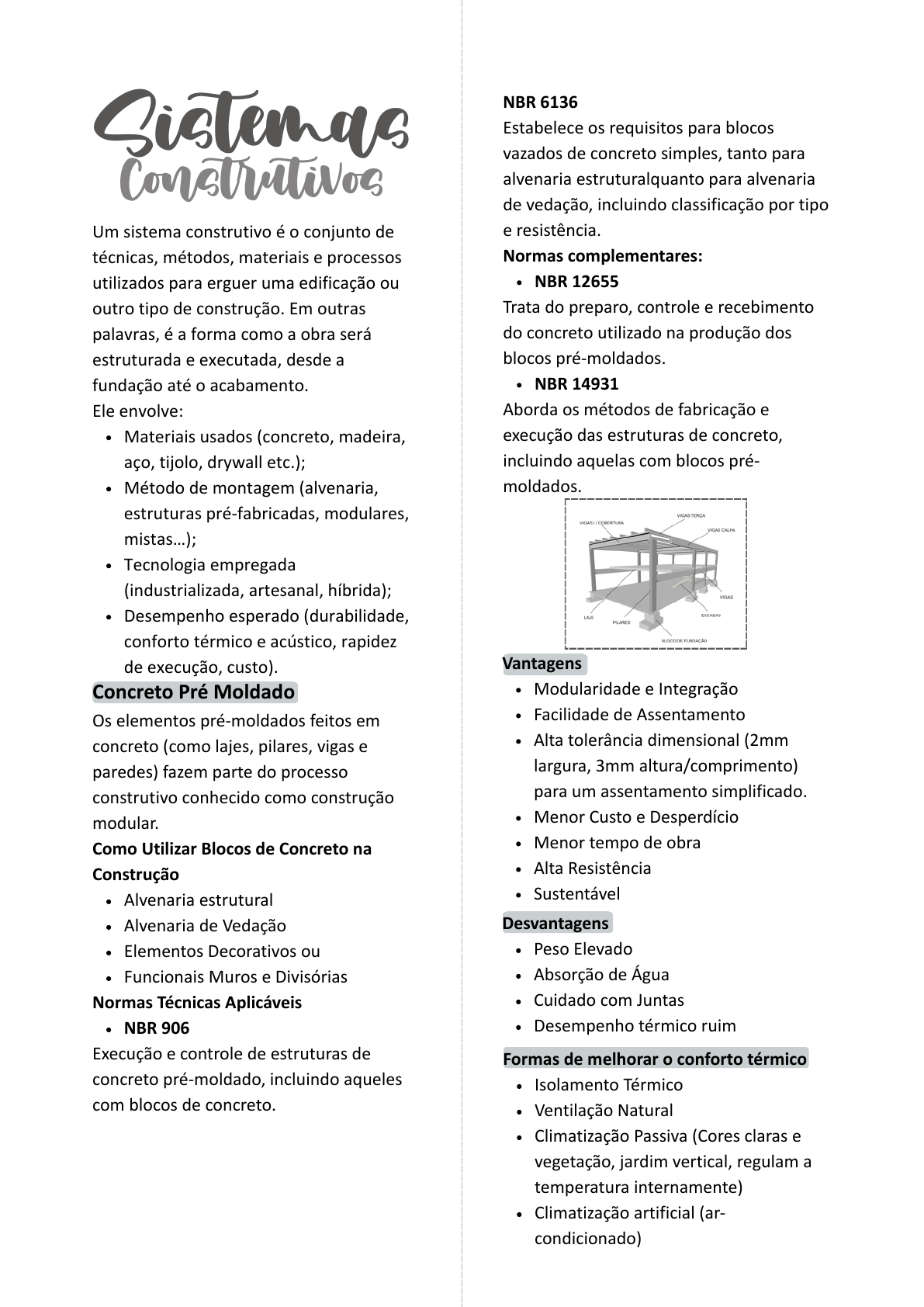 Um sistema construtivo é o conjunto de técnicas, métodos, materiais e processos utilizados para erguer uma edificação ou outro tipo de construção. Em outras palavras, é a forma como a obra será estruturada e executada, desde a fundação até o acabamento. Ele envolve: Materiais usados (concreto, madeira, aço, tijolo, drywall etc.); Método de montagem (alvenaria, estruturas pré-fabricadas, modulares, mistas…); Tecnologia empregada (industrializada, artesanal, híbrida); Desempenho esperado (durabilidade, conforto térmico e acústico, rapidez de execução, custo). Sistemas Construtivos Concreto Pré Moldado Os elementos pré-moldados feitos em concreto (como lajes, pilares, vigas e paredes) fazem parte do processo construtivo conhecido como construção modular. Como Utilizar Blocos de Concreto na Construção Alvenaria estrutural Alvenaria de Vedação Elementos Decorativos ou Funcionais Muros e Divisórias Normas Técnicas Aplicáveis NBR 906 Execução e controle de estruturas de concreto pré-moldado, incluindo aqueles com blocos de concreto. NBR 6136 Estabelece os requisitos para blocos vazados de concreto simples, tanto para alvenaria estruturalquanto para alvenaria de vedação, incluindo classificação por tipo e resistência. Normas complementares: NBR 12655 Trata do preparo, controle e recebimento do concreto utilizado na produção dos blocos pré-moldados. NBR 14931 Aborda os métodos de fabricação e execução das estruturas de concreto, incluindo aquelas com blocos pré- moldados. Vantagens Modularidade e Integração Facilidade de Assentamento Alta tolerância dimensional (2mm largura, 3mm altura/comprimento) para um assentamento simplificado. Menor Custo e Desperdício Menor tempo de obra Alta Resistência Sustentável Desvantagens Peso Elevado Absorção de Água Cuidado com Juntas Desempenho térmico ruim Formas de melhorar o conforto térmico Isolamento Térmico Ventilação Natural Climatização Passiva (Cores claras e vegetação, jardim vertical, regulam a temperatura internamente) Climatização artificial (ar- condicionado) Patologias Fissuras e Trincas. Desagregação (desplacamento/esfoliação) Segregação Manchas Eflorescência Calcinação Alvenaria Estrutural O que é alvenaria estrutural? As próprias paredes são responsáveis por sustentar a estrutura da edificação. Diferença entre alvenaria estrutural e convencional O que é alvenaria estrutural? As próprias paredes são responsáveis por sustentar a estrutura da edificação. Vantagens Rapidez na execução Redução de custos Mais aproveitamento de área útil Menos entulho e resíduos Melhor desempenho térmico e acústico Desvantagens Pouca flexibilidade de alterações Necessita de planejamento preciso Menor liberdade arquitetônica Demanda blocos de qualidade Quando vale a pena usar? Projeto sem grandes alterações futuras Necessidade de reduzir custos e tempo de obra Existência de padrão repetitivo Construção de até 4 andares Woodframe O que é Woodframe? O Wood Frame é um sistema construtivo industrializado, sustentável e leve, cada vez mais utilizado na construção civil por sua eficiência, rapidez e desempenho. As paredes são formadas por uma estrutura de madeira tratada, preenchidas com isolantes e fechadas com placas, funcionando como elementos estruturais e de vedação. Estrutura de madeira tratada Placas OSB ou cimentícias Isolamento termoacústico (lã de vidro, PET, etc.) Vantagens Rapidez na execução Redução de custos de fundação (estrutura leve) Ótimo desempenho térmico e acústico Sustentabilidade (material renovável) Menos entulho e resíduos Maior precisão e qualidade (industrialização) Também de reflorestamento. Boa resistência mecânica. Usado em perfis estruturais, desde que bem tratado. Mais usado nos EUA e Canadá. Mistura de espécies de coníferas (abeto, pinho e abeto-prateado). Leve e resistente, ideal para construções modulares. Desvantagens Pouca mão de obra especializada no Brasil Custo inicial maior em regiões sem fornecedores Necessidade de manutenção preventiva contra umidade e pragas Dependência de materiais industrializados específicos Quando vale a pena usar? Projetos sustentáveis e ecológicos Obras rápidas com necessidade de padronização Construções de pequeno e médio porte (casas, sobrados, prédios baixos) Regiões onde a madeira tratada e materiais industrializados são acessíveis Tipos de Madeira: Pinus Eucalipto SPF (Spruce-Pine-Fir) Muito comum em wood frame no Brasil. Crescimento rápido e abundante em reflorestamento. Precisa de tratamento para aumentar a durabilidade. Alvenaria convencional O que é alvenaria convencional? A alvenaria convencional é o sistema construtivo mais utilizado no Brasil, caracterizado pela combinação de pilares, vigas e lajes de concreto armado, junto com paredes de vedação em blocos ou tijolos. Vantagens Grande flexibilidade para reformas e alterações de layout Maior liberdade arquitetônica Permite construções de múltiplos andares (prédios altos) Compatível com diversos sistemas de instalações (hidráulica, elétrica, ar- condicionado) Durabilidade elevada As paredes não têm função estrutural. A sustentação da edificação é feita por um esqueleto de concreto armado (pilares e vigas), enquanto as paredes servem apenas para vedação e divisão de ambientes. Estrutura de concreto armado Paredes de blocos cerâmicos, blocos de concreto ou tijolos maciços Possibilidade de uso de diversos revestimentos Desvantagens Maior tempo de execução Maior geração de entulho e resíduos Custo geralmente mais alto em comparação à alvenaria estrutural Fundos de obra mais pesados (exigem fundações mais robustas) Quando vale a pena usar? Projetos de médio e grande porte Edificações com muitos pavimentos (prédios altos) Quando há necessidade de flexibilidade futura no layout Obras que exigem maior liberdade arquitetônica e de instalações Drywal