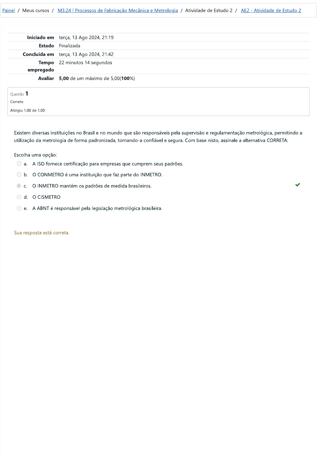 Painel / Meus cursos / M3.24 Processos de Fabricação Mecânica e Metrologia / Atividade de Estudo 2 / AE2 - Atividade de Estudo 2 Iniciado em terça, 13 Ago 2024, 21:19 Estado Finalizada Concluída em terça, 13 Ago 2024, 21:42 Tempo 22 minutos 14 segundos empregado Avaliar 5,00 de um máximo de 5,00(100%) Questão 1 Correto Atingiu 1,00 de 1,00 Existem diversas instituições no Brasil e no mundo que são responsáveis pela supervisão e regulamentação metrológica, permitindo a utilização da metrologia de forma padronizada, tornando-a confiável e segura. Com base nisto, assinale a alternativa CORRETA: Escolha uma opção: a. A ISO fornece certificação para empresas que cumprem seus padrões. b. CONMETRO é uma instituição que faz parte do INMETRO. C. INMETRO mantém os padrões de medida brasileiros. d. CISMETRO e. A ABNT é responsável pela legislação metrológica brasileira. Sua resposta está correta.Questão 2 Correto Atingiu 1,00 de 1,00 Os sistemas de medição utilizados na engenharia sempre apresentam algum tipo de erro, que é dividido em aleatório e sistemático. É necessário estimar a amplitude desses erros para saber a confiabilidade das medições realizadas. É também possível classificar estes sistemas utilizando os conceitos de precisão e exatidão. Sobre este assunto, classifique as sentenças em V para as verdadeiras e F para as falsas. () Um sistema de baixo erro sistemático é preciso. Todo sistema com alta exatidão possui alta precisão. () Erros sistemáticos causam uma tendência nas medições. Erros aleatórios são sempre menores que os sistemáticos Assinale a única alternativa CORRETA: Escolha uma opção: a. V-V-F-F b. V-F-V-F. C. F-V-F-V. d. V-F-F-V. e. Sua resposta está correta. Questão 3 Correto Atingiu 1,00 de 1,00 Na engenharia, processo de calibração é de suma importância para garantir a qualidade dos instrumentos utilizados, garantindo um resultado de medição condizente com a grandeza real sendo medida. Sobre este assunto, classifique as sentenças em V para as verdadeiras e F para as falsas. () certificado de calibração é emitido após o ajuste do equipamento. Os diagramas de calibração devem incluir as incertezas de medição. () processo de calibração deve ser repetido com periodicidade dependente de cada caso. A qualidade de um instrumento de medição depende da sua hierarquia de calibração. A seguir, assinale a sequência CORRETA: Escolha uma opção: a. F-V-V-V. b. F-V-V-F. V-F-V-F. d. V-F-F-F e. F-F-V-V. Sua resposta está correta.Questão 4 Correto Atingiu 1,00 de 1,00 Os processos de calibração, verificação, ajuste e regulagem são necessários para que os instrumentos de medições mantenham uma boa qualidade de medição, sendo processos utilizados frequentemente tanto na indústria quanto em laboratórios. Com base nesses processos classifique as sentenças em V para as verdadeiras e F para as falsas. () ajuste requer uma calibração prévia. (A regulagem é uma calibração sem uso de padrões. () A verificação não fornece resultados numéricos. () ajuste é uma parte do processo de calibração. Assinale a alternativa CORRETA: Escolha uma opção: a. F-V-F-V b. V-F-V-F. C. V-F-F-F d. V-F-F-V. e. Sua resposta está correta.Questão 5 Correto Atingiu 1,00 de 1,00 Existe uma terminologia específica da área de metrologia, desenvolvida ao longo do tempo, de forma a facilitar a comunicação entre os vários engenheiros e cientistas, cujo trabalho é relacionado a esta área. Com base nesta terminologia, associe os itens, utilizando o código a seguir: I- Gama de medição. II- Grandeza. III- Padrão. IV- Resolução. V- Unidade de medição. () Menor marcação existente no instrumento. Valor ou dimensão que pode ser medida no objeto ou fenômeno. () Faixa de valores que o instrumento permite medir. Dimensão usada como referência para representação de medidas. Objeto ou fenômeno usado como referência. Assinale a alternativa que apresenta a sequência CORRETA: Escolha uma opção: a. IV- II- V- III. b. I- IV- II- V- III. C. IV- II- I- III- V. d. III- IV- V- II. e. V- II- III- IV. Sua resposta está correta. Aula Digital 8 Seguir para... Aula Digital 9