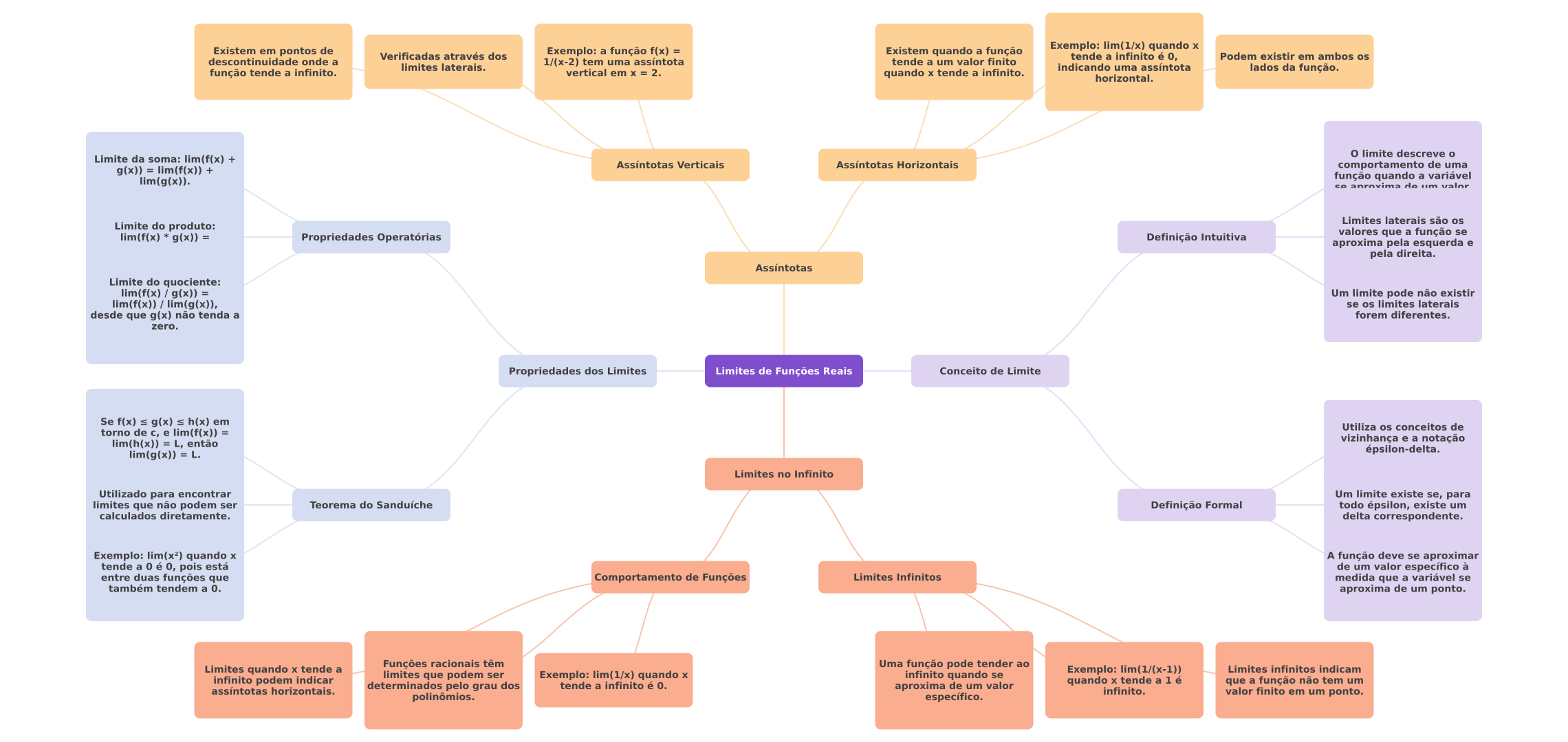 Existem em pontos de Exemplo: a função f(x) = Existem quando a função Exemplo: lim(1/x) quando Verificadas através dos tende a um valor finito tende a infinito é 0, Podem existir em ambos os descontinuidade onde a limites laterais. 1/(x-2) tem uma assíntota indicando uma assíntota função tende a infinito. vertical em = 2. quando tende a infinito. lados da função. horizontal. limite descreve Limite da soma: lim(f(x) + Assíntotas Verticais Assíntotas Horizontais g(x)) = lim(f(x)) + comportamento de uma função quando a variável lim(g(x)). de um valor Limites laterais são os Limite do produto: lim(f(x) g(x)) = Propriedades Operatórias Definição Intuitiva valores que a função se aproxima pela esquerda e pela direita. Assíntotas Limite do quociente: lim(f(x) g(x)) = Um limite pode não existir lim(f(x)) / lim(g(x)), se os limites laterais desde que g(x) não tenda a forem diferentes. zero. Propriedades dos Limites Limites de Funções Reais Conceito de Limite Se f(x) â g(x) â h(x) em Utiliza os conceitos de torno de c, e lim(f(x)) = lim(h(x)) = L, então vizinhança e a notação lim(g(x)) = L. épsilon-delta. Limites no Infinito Utilizado para encontrar Um limite existe se, para limites que não podem ser Teorema do Sanduíche Definição Formal todo épsilon, existe um calculados diretamente. delta correspondente. Exemplo: quando A função deve se aproximar tende a 0 é 0, pois está de um valor específico à entre duas funções que Comportamento de Funções Limites Infinitos medida que a variável se também tendem a 0. aproxima de um ponto. Limites quando tende a Funções racionais têm Uma função pode tender ao infinito podem indicar limites que podem ser Exemplo: lim(1/x) quando infinito quando se Exemplo: lim(1/(x-1)) Limites infinitos indicam assíntotas horizontais. determinados pelo grau dos tende a infinito é aproxima de um valor quando tende a lé que a função não tem um infinito. polinômios. específico. valor finito em um ponto.