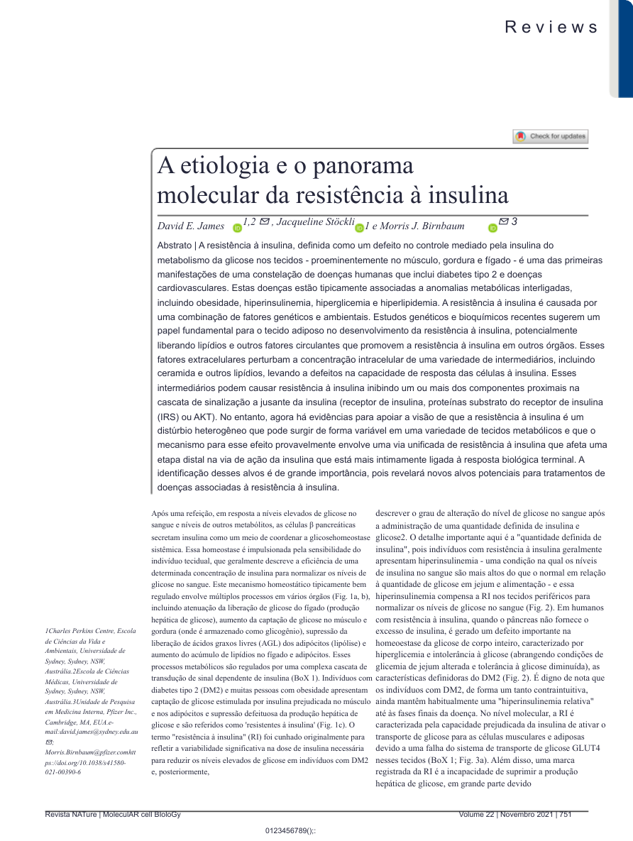 0123456789();: Após uma refeição, em resposta a níveis elevados de glicose no sangue e níveis de outros metabólitos, as células β pancreáticas secretam insulina como um meio de coordenar a glicosehomeostase sistêmica. Essa homeostase é impulsionada pela sensibilidade do indivíduo tecidual, que geralmente descreve a eficiência de uma determinada concentração de insulina para normalizar os níveis de glicose no sangue. Este mecanismo homeostático tipicamente bem regulado envolve múltiplos processos em vários órgãos (Fig. 1a, b), incluindo atenuação da liberação de glicose do fígado (produção hepática de glicose), aumento da captação de glicose no músculo e gordura (onde é armazenado como glicogênio), supressão da liberação de ácidos graxos livres (AGL) dos adipócitos (lipólise) e aumento do acúmulo de lipídios no fígado e adipócitos. Esses processos metabólicos são regulados por uma complexa cascata de transdução de sinal dependente de insulina (BoX 1). Indivíduos com diabetes tipo 2 (DM2) e muitas pessoas com obesidade apresentam captação de glicose estimulada por insulina prejudicada no músculo e nos adipócitos e supressão defeituosa da produção hepática de glicose e são referidos como 'resistentes à insulina' (Fig. 1c). O termo "resistência à insulina" (RI) foi cunhado originalmente para refletir a variabilidade significativa na dose de insulina necessária para reduzir os níveis elevados de glicose em indivíduos com DM2 e, posteriormente, descrever o grau de alteração do nível de glicose no sangue após a administração de uma quantidade definida de insulina e glicose2. O detalhe importante aqui é a "quantidade definida de insulina", pois indivíduos com resistência à insulina geralmente apresentam hiperinsulinemia - uma condição na qual os níveis de insulina no sangue são mais altos do que o normal em relação à quantidade de glicose em jejum e alimentação - e essa hiperinsulinemia compensa a RI nos tecidos periféricos para normalizar os níveis de glicose no sangue (Fig. 2). Em humanos com resistência à insulina, quando o pâncreas não fornece o excesso de insulina, é gerado um defeito importante na homeoestase da glicose de corpo inteiro, caracterizado por hiperglicemia e intolerância à glicose (abrangendo condições de glicemia de jejum alterada e tolerância à glicose diminuída), as características definidoras do DM2 (Fig. 2). É digno de nota que os indivíduos com DM2, de forma um tanto contraintuitiva, ainda mantêm habitualmente uma "hiperinsulinemia relativa" até às fases finais da doença. No nível molecular, a RI é caracterizada pela capacidade prejudicada da insulina de ativar o transporte de glicose para as células musculares e adiposas devido a uma falha do sistema de transporte de glicose GLUT4 nesses tecidos (BoX 1; Fig. 3a). Além disso, uma marca registrada da RI é a incapacidade de suprimir a produção hepática de glicose, em grande parte devido A etiologia e o panorama molecular da resistência à insulina David E. James 1,2 ✉ , Jacqueline Stöckli 1 e Morris J. Birnbaum ✉ 3 Abstrato | A resistência à insulina, definida como um defeito no controle mediado pela insulina do metabolismo da glicose nos tecidos - proeminentemente no músculo, gordura e fígado - é uma das primeiras manifestações de uma constelação de doenças humanas que inclui diabetes tipo 2 e doenças cardiovasculares. Estas doenças estão tipicamente associadas a anomalias metabólicas interligadas, incluindo obesidade, hiperinsulinemia, hiperglicemia e hiperlipidemia. A resistência à insulina é causada por uma combinação de fatores genéticos e ambientais. Estudos genéticos e bioquímicos recentes sugerem um papel fundamental para o tecido adiposo no desenvolvimento da resistência à insulina, potencialmente liberando lipídios e outros fatores circulantes que promovem a resistência à insulina em outros órgãos. Esses fatores extracelulares perturbam a concentração intracelular de uma variedade de intermediários, incluindo ceramida e outros lipídios, levando a defeitos na capacidade de resposta das células à insulina. Esses intermediários podem causar resistência à insulina inibindo um ou mais dos componentes proximais na cascata de sinalização a jusante da insulina (receptor de insulina, proteínas substrato do receptor de insulina (IRS) ou AKT). No entanto, agora há evidências para apoiar a visão de que a resistência à insulina é um distúrbio heterogêneo que pode surgir de forma variável em uma variedade de tecidos metabólicos e que o mecanismo para esse efeito provavelmente envolve uma via unificada de resistência à insulina que afeta uma etapa distal na via de ação da insulina que está mais intimamente ligada à resposta biológica terminal. A identificação desses alvos é de grande importância, pois revelará novos alvos potenciais para tratamentos de doenças associadas à resistência à insulina. 1Charles Perkins Centre, Escola de Ciências da Vida e Ambientais, Universidade de Sydney, Sydney, NSW, Austrália.2Escola de Ciências Médicas, Universidade de Sydney, Sydney, NSW, Austrália.3Unidade de Pesquisa em Medicina Interna, Pfizer Inc., Cambridge, MA, EUA.e- mail:david.james@sydney.edu.au ✉; Morris.Birnbaum@pfizer.comhtt ps://doi.org/10.1038/s41580- 021-00390-6 Revista NATure | MoleculAR cell BIoloGy R e v i e w s Volume 22 | Novembro 2021 | 751 0123456789();: a uma elevação sustentada da gliconeogênese (possivelmente como consequência indireta da regulação defeituosa do metabolismo lipídico nos adipócitos)3. A RI tem sido implicada como fator de risco para inúmeras doenças metabólicas, incluindo DM2, doenças cardiovasculares e hepáticas, como esteato-hepatite não alcoólica, além de outras doenças, como algumas formas de câncer, doenças neurodegenerativas e fragilidade4. Embora a RI esteja invariavelmente associada à hip