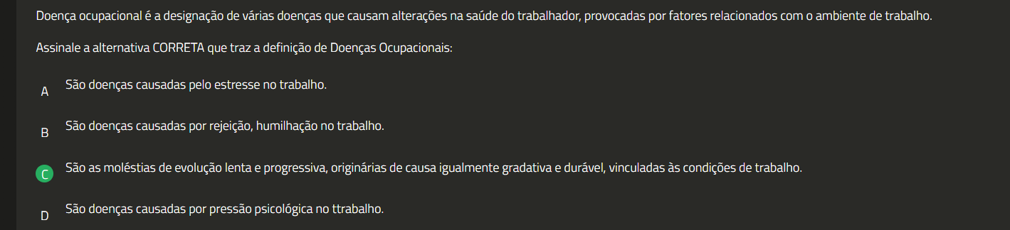 Doença ocupacional é a designação de várias doenças que causam alterações na saúde do trabalhador, provocadas por fatores relacionados com 0 ambiente de trabalho. Assinale a alternativa CORRETA que traz a definição de Doenças Ocupacionais: A São doenças causadas pelo estresse no trabalho. São doenças causadas por rejeição, humilhação no trabalho. São as moléstias de evolução lenta e progressiva, originárias de causa igualmente gradativa e durável, vinculadas às condições de trabalho. D São doenças causadas por pressão psicológica no ttrabalho.