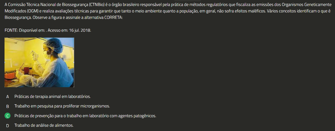 A Comissão Técnica Nacional de Biossegurança (CTNBio) é 0 órgão brasileiro responsável pela prática de métodos regulatórios que fiscaliza as emissões dos Organismos Geneticamente Modificados (OGM) e realiza avaliações técnicas para garantir que tanto 0 meio ambiente quanto a população, em geral, não sofra efeitos maléficos. Vários conceitos identificam 0 que é Biossegurança. Observe a figura e assinale a alternativa CORRETA: FONTE: Disponível em: Acesso em: 16 jul. 2018. A Práticas de terapia animal em laboratórios. Trabalho em pesquisa para proliferar microrganismos. Práticas de prevenção para 0 trabalho em laboratório com agentes patogênicos. D Trabalho de análise de alimentos.