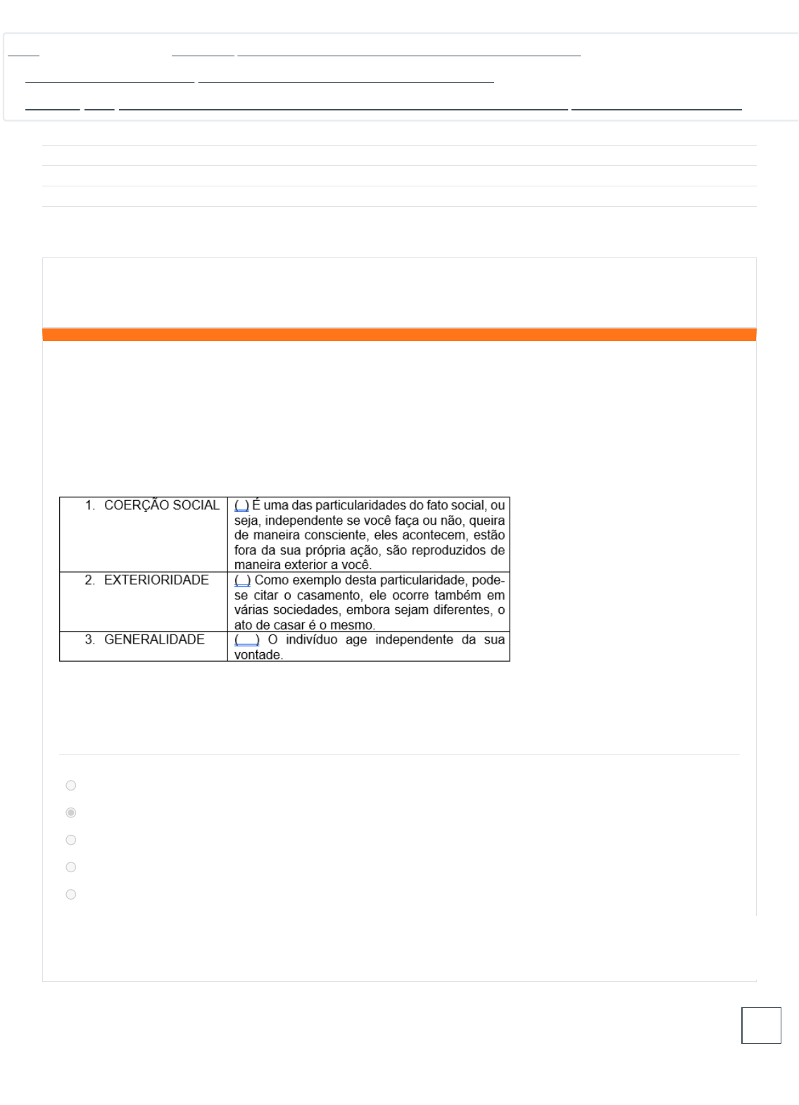 Iniciado em sábado, 22 mar 2025, 13:30 Estado Finalizada Concluída em sábado, 22 mar 2025, 13:55 Tempo empregado 25 minutos 8 segundos Questão 1 Completo Vale 0,60 ponto(s). Segundo Durkheim, o fato social deve ser pensado como uma “COISA” cabendo ao cientista, sem paixão nenhuma e nenhum juízo de valor, entendê-lo de maneira objetiva, descritiva, comparativa para que não exista dúvida sobre as suas afirmações. Assim, para Durkheim, o cientista deve ser neutro em sua pesquisa, sendo capaz de fazer uma apreciação fiel e imparcial do fato social a ser investigado. Para ser fato social é necessário identificarmos três particularidades, ele deve ser coercitivo, exterior e generalizante. Assim, relacione a coluna da direita com a da esquerda: Assinale a alternativa correta: a. 1, 2, 3. b. 2, 3, 1. c. 2, 1, 3. d. 1, 3, 2. e. 3, 2, 1. Sua resposta está correta. Painel / Minhas Disciplinas / 2ºGRADUAÇÃO EM SOCIOLOGIA-disc. 1225- CIÊNCIAS HUMANAS E SOCIAIS / PROVA CURRICULAR - REALIZAÇÃO DIA 21/03/2025 A 23/03/2025 - VALOR 6,0 PONTOS / AB4 - CLIQUE AQUI PARA REALIZAR A PROVA CURRICULAR - DIA 21/03/2025 A 23/03/2025 - VALOR 6,0 PONTOS - 1ª OPORTUNIDADE https://www.eadunifatecie.com.br/course/view.php?id=59551 https://www.eadunifatecie.com.br/course/view.php?id=59551 https://www.eadunifatecie.com.br/my/ https://www.eadunifatecie.com.br/course/view.php?id=59551 https://www.eadunifatecie.com.br/course/view.php?id=59551#section-12 https://www.eadunifatecie.com.br/mod/quiz/view.php?id=1929949 Questão 2 Completo Vale 0,60 ponto(s). A Antropologia, segundo Laplantine (1988, p. 20) “[...] não é apenas o estudo de tudo que compõe uma sociedade. Ela é o estudo de todas as sociedades (a nossa inclusive), ou seja, das culturas da humanidade como um todo em suas diversidades históricas e geográficas. Assim, com base nesta informação analise as asserções abaixo: I. O conceito de cultura foi definido pela primeira vez por Edward Tylor em seu livro Primitive Culture (1871), sendo tratada como um objeto de estudo sistemático que caracterizava um fenômeno natural composto de causas e regularidades, POR ISSO, II. permitiria um estudo objetivo e uma análise formulada por leis sobre o processo cultural e a evolução. A respeito dessas asserções, assinale a opção correta: a. As asserções I e II são proposições verdadeiras e a II é uma justificativa correta da I. b. As asserções I e II são proposições verdadeiras, mas a II não é uma justificativa correta da I. c. As asserções I e II são proposições falsas. d. A asserção I é uma proposição verdadeira e a II é uma proposição falsa. e. A asserção I é uma proposição falsa e a II é uma proposição verdadeira. Sua resposta está correta. Questão 3 Completo Vale 0,60 ponto(s). Questão 4 Completo Vale 0,60 ponto(s). É muito importante dizer que a Sociologia não é uma ciência “vazia” ou que surgiu “do nada” - expressão que usamos para dar sentido a aquilo que não sabemos argumentar. Diante disto, analise as afirmativas abaixo: I. O senso comum surgiu das novas configurações e condições sociais, políticas e econômicas advindas das transformações que ocorreram no mundo ocidental entre o final do século XVIII e início do século XIX. II. Na verdade, a sociologia, desde o seu início, sempre foi algo mais do que uma mera tentativa de reflexão sobre a sociedade moderna. III. As explicações da sociologia sempre contiveram intenções práticas, um forte desejo de interferir no rumo desta civilização. IV. A sociologia pode ser considerada uma ciência ilusória e tensa, que sempre representa os interesses dos movimentos revolucionários. Assinale a alternativa correta: a. Apenas I, II e IV estão corretas. b. Todas as alternativas estão corretas. c. Apenas I e III estão corretas. d. Apenas II é correta. e. Apenas II e III estão corretas. Sua resposta está correta. Sabe quando acontece uma grande catástrofe, seja enchente ou seca e alguns jornalistas entrevistam os moradores desses lugares e muitos deles atribuem estarem vivos por bondade divina? Repetem “Graças a Deus estou viva”, “Deus não quis o pior para mim e a minha família”, “está seco demais porque Deus quis assim”. Pois bem, segundo Comte, como esse tipo de pensamento humano pode ser considerado? Assinale a alternativa correta: a. Estado Fisiológico. b. Estado Teológico. c. Estado Positivo. d. Estado Metafísico. e. Estado de Cautela. Sua resposta está correta. Questão 5 Completo Vale 0,60 ponto(s). Para Comte a sociedade devia ser reorganizada, mas isso não deveria acontecer apenas nas estruturas/ instituições sociais e sim no intelectual humano. Se cada homem tivesse seu pensamento renovado e modificado, seria capaz de compreender a sociedade e isso determinaria uma real mudança. Sendo assim, Comte criou a lei dos estados em que defendia que era possível entender o desenvolvimento da ciência e do espírito humano através de três momentos distintos. Assim, quanto a esses estados defendido pelo pensador, analise as afirmativas abaixo: I. Estado de cautela. II. Estado Teológico. III. Estado Metafísico. IV. Estado Positivo. É verdadeiro o que se afirma em: a. Todas as alternativas estão corretas. b. Apenas I, III e IV estão corretas. c. Apenas I e III estão corretas. d. Apenas II é correta. e. Apenas II, III e IV estão corretas. Sua resposta está correta. Questão 6 Completo Vale 0,60 ponto(s). Entre os autores contemporâneos da Ciências Sociais e, em especial, da Sociologia, assim como, Zygmunt Bauman e seu conceito de Modernidade Líquida. Pierre Bourdieu também se diferenciou para compreender as relações sociais com a ajuda do pensamento clássico, mas também para além dele. Assim, baseado na linha de pensamento de Bourdieu, analise as afirmativas abaixo: I. O que chamava a atenção do autor eram as crenças, os comportamentos realizados pela coletividade e muitas v