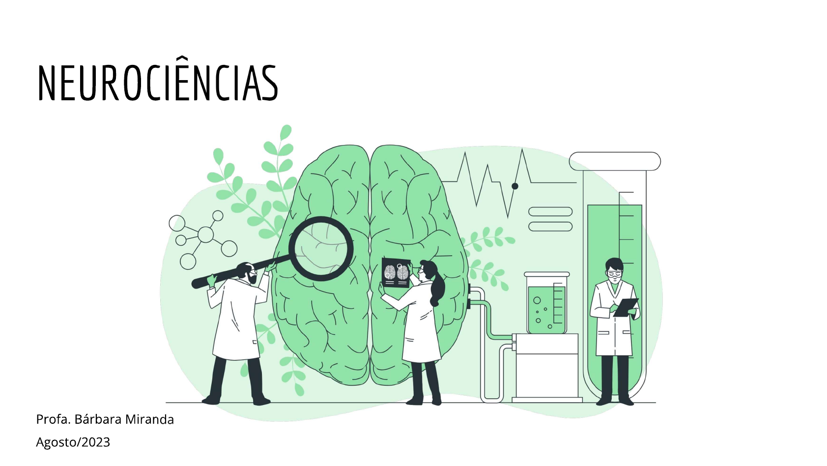 NEUROCIÊNCIAS Profa. Bárbara Miranda Agosto/2023EMENTA I. EMENTA Interfaces entre a Psicologia e Neurociências. Bases orgânicas do funcionamento do Sistema Nervoso. Fundamentos da Neuropsicologia. Enfoque nas alterações das funções cognitivas. Avaliação e reabilitação neuropsicológica. II. OBJETIVOS GERAIS Desenvolver a compreensão integrada dos fenômenos e processos psicológicos, por meio do estudo de conteúdos que tematizam a interface do saber psicológico com disciplinas das Ciências Biológicas, Humanas e Sociais, considerando-se OS desafios éticos para a construção de uma interdisciplinaridade. III. OBJETIVOS ESPECÍFICOS Identificar e reconhecer funcionamento geral do Sistema Nervoso. Identificar e reconhecer as diferentes áreas corticais, relacionando sua especificidade e inter-relações. Conhecer a história da Neurociência com enfoque na Neuropsicologia. Distinguir, especificar e explicar as funções cognitivas (funções executivas, atenção, memória, linguagem, visuoconstrução, praxia e cognição social) em interface com comportamento humano. Apresentar as alterações cognitivas e comportamentais mais comuns na prática do neuropsicólogo. Conhecer a relevância da Neuropsicologia para a avaliação e reabilitação.comportamento é resultado de alterações químicas + fisiológicas.CÉLULA NERVOSACÉLULA NERVOSA - Neurônios No sistema nervoso, existem 2 classes distintas de Núcleo células: as células neurais ou neurônios e as células da Corpo glia ou gliais. celular Bainha de Estima-se que cérebro humano é formado por cerca mielina Célula de 25 bilhões de neurônios. de Schwann Um neurônio apresenta 4 regiões morfologicamente Axónio Neurilema Dendrites definidas: corpo celular, dendritos, axônio e suas terminações pré sinápticas. A célula transmissora de um sinal é designado como célula pré - sináptica, enquanto que a célula que recebe Nódulo de Ranvier sinal é a célula pós - sináptica.(a) (b) aferente CÉLULA NERVOSA dendrites receptoras Os neurônios podem ser classificados, em termos de sua corpo função, em três grandes grupos: sensoriais, motores, e corpo celular interneurônios. Os neurônios sensoriais ou aferente axónio axónio conduzem informações para sistema nervoso, tanto para a percepção como para a coordenação motora. Os nodo de Ranvier corpo neurônios motores ou eferentes, conduzem comandos para OS músculos e glândulas. Os interneurônios formam a maior classe, conduzem informações de uma região sinapse central cerebral para outra. axónios terminais músculo terminaisCÉLULA NERVOSA - Gliócitos Os corpos celulares neurais e seus axônios são cercados por células da glia. Existem cerca de 10 a 50 vezes mais células da glia do que neurônios no SNC dos vertebrados. Macroglia: Astrócitos e Oligodendrócitos / Células Ependimárias / Micróglia As células da glia têm as seguintes funções: 1. Atuam como elementos de sustentação, dando firmeza e estrutura ao cérebro. Separam e isolam grupos de neurônios entre si. 2. Dois tipos de células da glia produzem mielina. 3. Algumas células da glia removem OS dendritos após lesão ou morte neural. 4. As células da glia tamponam e mantém a concentração dos íons potássio no espaço extracelular; algumas também captam e removem transmissores químicos liberados pelos neurônios durante a transmissão sináptica. 5. Durante desenvolvimento cerebral, certas classes de células da glia guiam a migração dos neurônios e dirigem crescimento do axônio. 6. Certas células da glia participam da criação de um revestimento, especial e impermeável, dos capilares e vênulas cerebrais, criando uma barreira hematoencefálica que impede acesso de substâncias tóxicas ao cérebro. 7. Existe evidência de que algumas células da glia, no SN do vertebrado, têm participação na nutrição das células neurais.SINAPSES E NEUROTRANSMISSORES Pode-se inicialmente definir que um transmissor é como uma substância que é liberada numa sinapse por um neurônio e que afeta uma outra célula. A transmissão sináptica química passa pelas seguintes fases: síntese da substância transmissora; armazenamento e a liberação do transmissor; interação do transmissor com receptor na membrana pós sináptica e remoção do transmissor da fenda sináptica. neurotransmissor é aquele que atende OS seguintes critérios: é sintetizado no neurônio; está presente na terminação pré sináptica afim de exercer uma ação sobre neurônio pós sináptico; quando administrada de forma exógena exerce a mesma função do transmissor endógeno; existe um mecanismo específico para sua remoção do sítio de ação (fenda sináptica).DIVISÃO ANATÔMICA E FUNCIONALMENINGES Meninges Encéfalo é protegido por 3 barreiras: crânio, meninges e Cráneo líquido cerebrospinal (produzido Duramadre no cérebro e absorvido pelo Aracnoides Sistema Venoso). Piamadre Meninges a partir do crânio: dura-máter, aracnóide-máter e Cerebro pia-máter.MENINGESDIVISÃO ANATÔMICA - SNC Telencéfalo Cérebro Diencéfalo Mesencéfalo Tronco Encefálico Ponte Bulbo Cerebelo CerebeloDIVISÃO ANATÔMICA - SNC Precentral Central Postcentral Postcentral Central Precentral gyrus sulcus gyrus gyrus sulcus gyrus Parietal lobe Corpus callosum Parietal lobe Thalamus and Frontal lobe 3rd ventricle Epithalamus Hypothalamus Cerebral Lateral sulcus aqueduct Frontal lobe Occipital lobe 4th ventricle Infundibulum Occipital lobe Pituitary gland Temporal lobe Cerebellum Midbrain Pons Pons Brainstem Cerebellum Medulla oblongata Medulla B A oblongata Spinal cordDIVISÃO ANATÔMICA - SNP Sistema Nervoso Central Encéfalo Medula espinhal Sistema Nervoso Periférico Ganglios NervosDIVISÃO FUNCIONAL - SNSomático Nervos Cranianos dos Pares Nervos Cranianos II- Óptico Olfatório- NERVOS SENSITIVOS NERVOS MOTORES III- Oculomotor Troclear- IV (aferentes) (eferentes) VI- Abducente Trigemeo- V III- nerv
