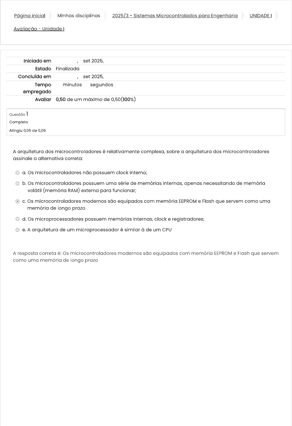 Página inicial Minhas disciplinas 2025/3 Sistemas Microcontrolados para Engenharia UNIDADE Avaliação Unidade Iniciado em set 2025, Estado Finalizada Concluída em set 2025, Tempo minutos segundos empregado Avaliar 0,50 de um máximo de 0,50(100%) Questão 1 Completo Atingiu 0,05 de 0,05 A arquitetura dos microcontroladores é relativamente complexa, sobre a arquitetura dos microcontroladores assinale a alternativa correta: a. Os microcontroladores não possuem clock interno; b. Os possuem uma série de memórias internas, apenas necessitando de memória volátil (memória RAM) externa para funcionar; C. Os microcontroladores modernos são equipados com memória EEPROM e Flash que servem como uma memória de longo prazo d. Os microprocessadores possuem memórias internas, clock e registradores; e. A arquitetura de um microprocessador é similar à de um CPU A resposta correta é: Os microcontroladores modernos são equipados com memória EEPROM e Flash que servem como uma memória de longo prazoQuestão 2 Completo Atingiu 0,05 de 0,05 A plataforma Arduino possui uma série de vantagens que ajudam o programador, sobre a plataforma Arduino assinale a alternativa correta: a. Arduino é um tipo de microcontrolador b. sistema Arduino possui uma IDE própria e faz uso de compilador externo para seu funcionamento C. Arduino é um sistema de código aberto, ou seja, promove licenciamento livre para design e esquematização do produto d. A plataforma Arduino é muito didática, mas não pode ser utilizada para aplicações profissionais e. Arduino é um sistema de código aberto, ou seja, pode-se ler código entre elementos internos da placa A resposta correta é: Arduino é um sistema de código aberto, ou seja, promove o licenciamento livre para o design e esquematização do produto Questão 3 Completo Atingiu 0,05 de 0,05 A plataforma Arduino possui uma série de vantagens que ajudam o programador, sobre a plataforma Arduino assinale a alternativa correta: a. A plataforma Arduino inclui uma série de placas de desenvolvimento como Arduino Uno, Mega, Nano, entre vários outros, e todas elas utilizam o microcontrolador AtMega328 para o seu funcionamento b. A plataforma Arduino pode ser programada em várias linguagens de programação C. Arduino é um sistema de código fechado, ou seja, não promove licenciamento livre para o design e esquematização do produto d. Arduino é uma placa de desenvolvimento que utiliza sempre o microcontrolador AtMega328 para seu funcionamento e. sistema Arduino pode ser programado em outras IDEs sem ser a IDE própria do Arduino, mas de qualquer forma, necessita do seu compilador para funcionar A resposta correta é: sistema Arduino pode ser programado em outras IDEs sem ser a IDE própria do Arduino, mas de qualquer forma, necessita do seu compilador para funcionarQuestão 4 Completo Atingiu 0,05 de 0,05 Dentre as diversas funções dos registradores, uma delas são as configurações de entradas e saídas, sobre as configurações de entradas e saídas analise as sentenças abaixo e assinale a alternativa correta: a. Os registradores PORTx são responsáveis por configurar quem é entrada e quem é saída dentro dos microcontroladores; b. Os registradores TRISx configuram como entrada e saída pino do registrador PORTx equivalente; C. Os registradores podem controlar entradas e saídas, mas não podem controlador interrupções; d. Os registradores TRISx não podem ser acessados diretamente pelo programador, somente pelo comando pinMode(); e. Os registradores TRISx possuem acesso direto aos pinos do microcontrolador; A resposta correta é: Os registradores TRISx configuram como entrada e saída pino do registrador PORTx equivalente; Questão 5 Completo Atingiu 0,05 de 0,05 estudo dos sistemas embarcados envolve microcontroladores e microprocessadores, sobre a diferença entre eles analise as sentenças abaixo e assinale a alternativa correta: a. microcontrolador possui um microprocessador dentro dele; b. Os microprocessadores possuem memórias internas; C. Tanto microcontroladores quanto microprocessadores possuem interfaces de entrada e saída para conecta-los; d. Tanto microcontroladores quanto microprocessadores necessitam de memórias externas para funcionar; e. Diferente do microprocessador, microcontrolador precisa de outros elementos para funcionar; A resposta correta é: microcontrolador possui um microprocessador dentro dele;Questão 6 Completo Atingiu 0,05 de 0,05 Os compiladores e as IDEs são grandes aliados dos programadores de microcontroladores, sobre os compiladores e as IDEs analise as sentenças abaixo e assinale a alternativa correta: I. Um compilador nada mais é do que um "tradutor" que traduz uma linguagem de entrada em uma linguagem de saída que pode ser entendida pelo microcontrolador; II. Uma IDE nada mais é do que uma ferramenta que auxilia o programador na escrita de seu código; III. Uma IDE pode ou não conter um compilador junto com a mesma; a. Todas as afirmativas estão corretas. b. Somente as afirmativas le III estão corretas. C. Somente as afirmativas e III estão corretas. d. Somente as afirmativas I, e III estão corretas. e. Somente as afirmativas I e estão corretas. A resposta correta é: Todas as afirmativas estão corretas. Questão 7 Completo Atingiu 0,05 de 0,05 Os microcontroladores DEVEM possuir em sua arquitetura: () Registradores () Microprocessador Memória ROM ( Memória EEPROM d.F,V,V,F. e.V,F,F,V. A resposta corretaQuestão 8 Completo Atingiu 0,05 de 0,05 Os microcontroladores são dispositivos digitais programáveis, com níveis de tensão TTL. Assim como qualquer microcontrolador, os microcontroladores da Atmel são compostos por ao menos um banco de memória de programa, uma unidade de processamento e pinos de entrada e saída. Quando queremos realizar uma operação qualquer, necessitamos saber qual será a operação, quais serão dados de entrada e onde será armazenado resultado. Em um microcontro