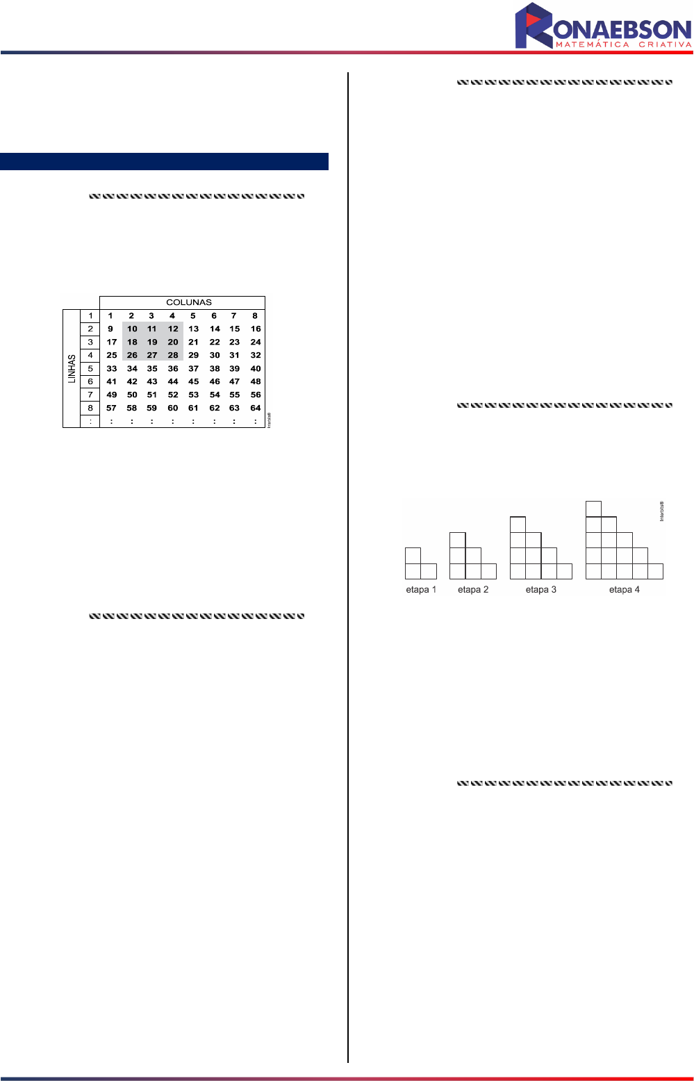 A equação perfeita para sua aprovação 1 PROGRESSÃO ARITMÉTICA PROGRESSÃO GEOMÉTRICA Ciclo de Revisões Questão 01 (FGV_2017) Na tabela de 8 colunas e infinitas linhas numeradas, indicada na figura, podemos formar infinitos quadrados coloridos 3 × 3 como mostra um exemplo. Nessa tabela, o quadrado colorido 3 × 3 cuja soma dos 9 elementos é igual a 4806 ocupa três linhas, sendo uma delas a linha A 71. B 67. C 53. D 49. E 41. Questão 02 (IFBA_2017) A Meia Maratona Shopping da Bahia Farol a Farol foi criada pela Personal Club e mais uma vez contará com a parceria do Shopping da Bahia. Tradicional no mês de outubro, a maior e mais esperada corrida de rua da Bahia, que já se encontra em sua sexta edição e será realizada nos percursos de 5km, 10km e 21km com largada no Farol de Itapuã e chegada no Farol da Barra, dois dos principais cartões postais da cidade de Salvador. Extraído de: http://www.meiamaratonafarolafarol.com.br/ em 26/08/2016 Um atleta, planejando percorrer o percurso de 21km fez um plano de treinamento, que consistia em correr 1000m no primeiro dia e, a cada dia subsequente, percorreria a distância do dia anterior acrescida de 400m. Sendo assim, esse atleta irá atingir a distância diária de 21km no: A 54º dia B 53º dia C 52º dia D 51º dia E 50º dia Questão 03 (IFAL_2017) Ao saber que a esposa estava grávida, um homem passa a armazenar latas de leite no quarto do bebê, aguardando sua chegada, porém, para ficar bem decorado, ele as junta formando uma pirâmide, onde na fila superior tem uma lata, na segunda fila duas latas, na terceira três e assim por diante até a fila da base. Se ele consegue formar exatamente filas sem sobras de latas, quantas latas ele conseguiu juntar? A 10 B 25 C 55 D 60 E 75 Questão 04 (UFGRS_2017) Quadrados iguais de lado são justapostos, segundo padrão representado nas figuras das etapas abaixo. Mantido esse padrão de construção, o número de quadrados de lado 1 existentes na figura da etapa 100, é A 1331. B 3050. C 5050. D 5100. E 5151. Questão 05 (UEG_2016) No primeiro semestre de 2015, a empresa “Aço Firme” fabricou 28.000 chapas metálicas em janeiro; em fevereiro sua produção começou a cair como uma progressão aritmética decrescente, de forma que em julho a sua produção foi de 8.800 chapas. Nessas condições, a produção da empresa nos meses de maio e junho totalizou A 33.600 chapas B 32.400 chapas C 27.200 chapas D 24.400 chapas E 22.600 chapas 10 1 A equação perfeita para sua aprovação 2 Questão 06 (IFCE_2016) Os lados de um triângulo retângulo estão em progressão aritmética. Então, o seno do menor ângulo é A 1. B 2/3. C 3/5. D 4/5. E 3/4. Questão 07 (INSPER_2015) Um determinado micro-organismo tem o seguinte ciclo de vida: - 1 dia após ser gerado, produz 2 cópias de si mesmo; - 2 dias após ser gerado, produz outras 2 cópias de si mesmo e, imediatamente, morre. Considere uma cultura que, no início do dia 1 possuía apenas 1 micro-organismo, imediatamente após ser gerado. A tabela a seguir mostra a evolução da população ao longo dos primeiros dias. Quantidade de micro- organismos... no final do dia 1 no final do dia 2 no final do dia 3 com 1 dia de vida 1 2 6 recém gerados 2 6 16 que acabaram de morrer 0 1 2 vivos, no total 3 8 22 Passados 6 dias, logo após as gerações e as mortes, a cultura terá A 46 indivíduos B 448 indivíduos C 564 indivíduos D 1073 indivíduos E 2048 indivíduos Questão 08 (UFSM_2015) Em 2011, o Ministério da Saúde firmou um acordo com a Associação das Indústrias de Alimentação (Abio) visando a uma redução de sódio nos alimentos industrializados. A meta é acumular uma redução de 28.000 toneladas de sódio nos próximos anos. Suponha que a redução anual de sódio nos alimentos industrializados, a partir de 2012, seja dada pela sequência: (1400,2000,2600,… ,5600) Assim, assinale verdadeira (V) ou falsa (F) em cada uma das afirmações a seguir. ( ) A sequência é uma progressão geométrica de razão 600. ( ) A meta será atingida em 2019. ( ) A redução de sódio nos alimentos industrializados acumulada até 2015 será de 3200 toneladas. A sequência correta é A F − V − V. B V − F − V. C V − V − F. D F − V − F. E F − F − V. Questão 09 (CEFET_2013) Durante o mesmo período, dois irmãos depositaram, uma vez por semana, em seus respectivos cofrinhos, uma determinada quantia, da seguinte forma: o mais novo depositou, na primeira semana, R$ 1,00, na segunda, R$ 2,00, na terceira, R$ 3,00 e assim, sucessivamente, enquanto que o mais velho colocou R$ 10,00 semanalmente até que ambos atingissem a mesma quantidade de dinheiro. Não havendo retirada em nenhum dos cofrinhos, a quantia que cada irmão obteve ao final desse período, em R$, foi de A 19. B 21. C 190. D 210. E 290. Questão 10 (UDESC_2013) Um professor de matemática, após corrigir uma prova aplicada em uma turma de 30 alunos, percebeu as seguintes peculiaridades em relação às notas atribuídas: - cada aluno obteve uma nota diferente; - a maior nota alcançada foi 9,2; - ordenando as notas em uma escala crescente, a diferença entre quaisquer duas notas consecutivas foi 0,3. Com base nessas informações, pode-se afirmar que o número de alunos desta turma que não alcançou, nesta prova, nota igual ou superior a 6,0 é igual a: A 9 B 11 C 19 D 21 E 12 3 A equação perfeita para sua aprovação 3 Questão 11 (FGV_2017) Certo capital foi aplicado em regime de juros compostos. Nos quatro primeiros meses, a taxa foi de 1% ao mês e, nos quatro meses seguintes, a taxa foi de 2% ao mês. Sabendo-se que, após os oito meses de aplicação, o montante resgatado foi de R$ 65.536,00 então o capital aplicado, em reais, foi aproximadamente igual a Dado: 65536 = 2./ A 3,660. B 3,720. C 3,380. D 3,880. E 3,940. Questão 12 (EBMSP_2016-Adaptada) A figura ilustra a árvore genealógica de uma pessoa composta pelos pais, quatro avós, oito bisavós e ass