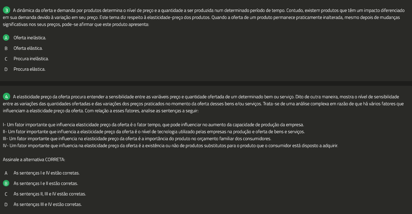 3 A dinâmica da oferta e demanda por produtos determina 0 nível de preço e a quantidade a ser produzida num determinado período de tempo. Contudo, existem produtos que têm um impacto diferenciado em sua demanda devido à variação em seu preço. Este tema diz respeito à elasticidade-preço dos produtos. Quando a oferta de um produto permanece praticamente inalterada, mesmo depois de mudanças significativas nos seus preços, pode-se afirmar que este produto apresenta: A Oferta inelástica. B Oferta elástica. Procura inelástica. D Procura elástica. 4 A elasticidade preço da oferta procura entender a sensibilidade entre as variáveis preço e quantidade ofertada de um determinado bem ou serviço. Dito de outra maneira, mostra O nível de sensibilidade entre as variações das quantidades ofertadas e das variações dos preços praticados no momento da oferta desses bens e/ou serviços. Trata-se de uma análise complexa em razão de que há vários fatores que influenciam a elasticidade preço da oferta. Com relação a esses fatores, analise as sentenças a seguir: I- Um fator importante que influencia elasticidade preço da oferta é 0 fator tempo, que pode influenciar no aumento da capacidade de produção da empresa. II- Um fator importante que influencia a elasticidade preço da oferta é 0 de tecnologia utilizado pelas empresas na produção e oferta de bens e serviços. III- Um fator importante que influencia na elasticidade preço da oferta é a importância do produto no orçamento familiar dos consumidores. IV- Um fator importante que influencia na elasticidade preço da oferta é a existência ou não de produtos substitutos para 0 produto que 0 consumidor está disposto a adquirir. Assinale a alternativa CORRETA: A As sentenças e IV estão corretas. As sentenças e estão corretas. As sentenças II, III e IV estão corretas. D As sentenças III e IV estão corretas.