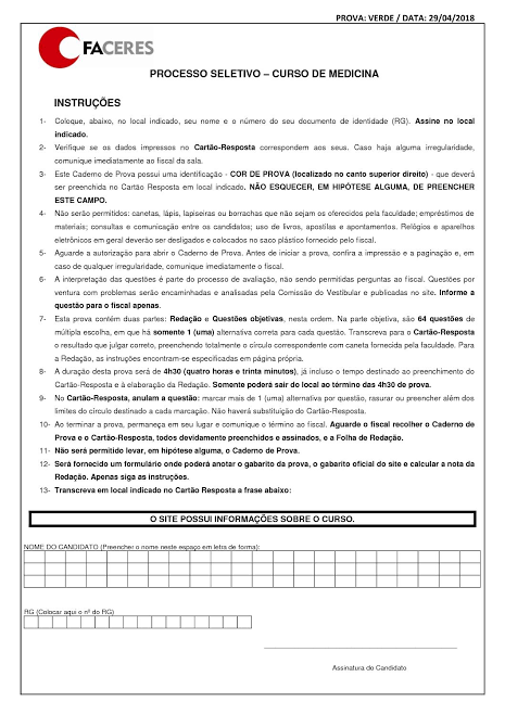 PROVA: VERDE / DATA: 29/04/2018 FACERES PROCESSO SELETIVO CURSO DE MEDICINA INSTRUÇÕES 1. abaixo, no local indicado, seu name e do seu documento de identidade (RG). Assine no local Verifique se dados impressos no Cartão-Resposta correspondem Caso haja alguma irregularidade, comunique imediatamente fiscal da sala Este Cademo de Prova possui uma identificação COR DE PROVA (localizado no canto superior direito) que deverá ser preenchida no Cartão Resposta em local NÃO EM DE PREENCHER ESTE CAMPO. Não serão permitidos: lapiseiras ou borrachas que não sejam pela empréstimos de consultas comunicação entre uso de aparelhos em geral per desligados colocados no plastico fornecido pelo Aguarde autorização para abrir Caderno de Antes de inciar a impressão a paginação caso de qualquer comunique imediatamente A interpretação das parte do processo de não sendo permitidas perguntas ao por ventura com problemas serão encaminhadas analsadas pela Comissão do Vestibular publicadas no Informe a questão para fiscal 7. Esta prova contém duas partes: Redação Na parte objetiva, são 64 questões de em que ha somente 1 correta para cada Transcreva para Cartão-Resposta resultado que julgar correto, totalmente correspondente com caneta fornecida pela Para a Redação, as instruções encontram-se em A duração desta prova será de 4h30 (quatro horas trints a tempo destinado preenchimento do elaboração da Somente sair local das 4h30 prova. 9. No anulam a marcar mais de 1 (uma) alternative por questão, ou preencher além dos limites do destinado a cada Não haverá substituição do 10- terminar a permaneça em seu comunique 0 50 Aguarde 0 fiscal recolher 0 Caderno de Prova 0 0 todos preenchides Folha de Redação. sera em hipotese alguma, 0 de Sera fornecido um formulario onde anotar gabarito da prova, gabarito oficial do site 0 calcular a nota da Redação. Apenas as 13- em local indicado no Cartão Resposta a frase abaixo: SITE POSSUI INFORMAÇÕES SOBRE CURSO. NOME DO CANDIDATO Preencher name de do Assinatura Candidate