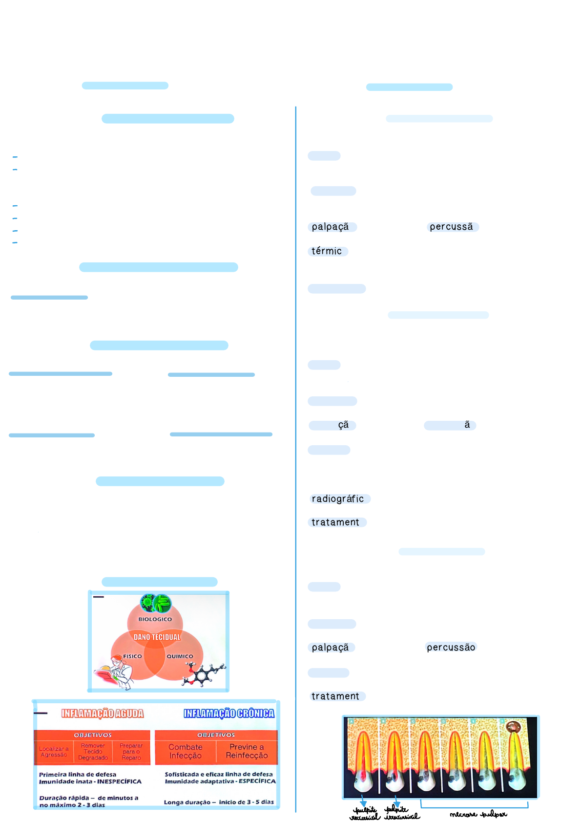 patologia pulpar e periŴadicular patologia pulpar e periŴadicular Ana Luiza Paschoal diagnostico endodontico exame extra-oral - inspeção - palpação exame intra-oral - inspeção - palpação - percussão vertical - teste de sensibilidade pulpar teste de sensibilidade pulpar testes térmicos frio - gás refrigerante (endo ice) calor - guta-percha aquecida classificacao dos sintomas quanto a intensidade: quanto a duração - intensa. - intermintente - moderada. - contínua - suave quanto a origem: quanto a localização: - espontânea - localizada - provocada - difusa diagnostico por imagem radiografia - panorâmica, periapical. proximidade da cárie com a polpa, adaptação de restaurações, alterações perirradiculares. tomografia computadorizada por feixe cônico. causas da inflamacao pulpite reversivel “leve alteração inflamatória inicial da polpa” sinais: cáries, restaurações com infiltrações, retração gengival, tratamento recente. sintomas: sensibilidade provocada (doce ou frio) de declínio rápido. palpação: negativo percussão: negativo térmico: calor - tardia a aplicação frio - aguda, rápida e localizada tratamento: remoção do agente agressor pulpite irreversivel “processo inflamatório grave e irreversível que acomete a polpa exposta, que progride para necrose.” sinais: cáries, restaurações com infiltrações, retração gengival, tratamento recente. sintomas: dor intensa, contínua, pulsátil, irradiada. palpação: negativo percussão: negativo/positivo térmico: calor - exacerbada -» vasodilatação frio - inicial: positiva/demora; avançado: negativa/ alívio da dor radiográfico: LP ligeiramente espessado tratamento: tratamento radical (pulpectomia) necrose pulpar “morte celular do tecido pulpar” sinais: alterações cromáticas (dentes hígidos - trauma), cáries, restaurações extensas. sintomas: assintomático (pode ter dor prévia) palpação: negativo percussão: negativo/positivo térmico: não responde ou responde tardiamente tratamento: remoção do tecido necrosado, tratamento endodôntico periodontite apical aguda “resposta inflamatória intensa que acomete lig. periodontal, com consequente edema” inspeção: escurecimento da coroa palpação: pode ser positiva percussão: dor extrema térmico: não responde radiográfico: LP espessado; sem reabsorção óssea abcesso perirradicular agudo “exacerbação da resposta dos tecidos perirradiculares, resultando em inflamação purulenta” - classificações: inicial, em evolução e evoluído. - presença de liquefação tecidual - formação de pus - dura de 72 a 96h ➵ intraósseo subperiostal (abcesso em evolução) edema difuso pastoso/duro pode não haver drenagem do conteúdo via canal ➵ estágio evoluído edema flutuante pode não haver drenagem via canal -» conteúdo nos tecidos moles. Depende da relação anatômica do ápice com as inserções musculares - intraoral ou extraoral - vestibular ou palatina drenagem menor resistência • dor intensa, espontânea, localizada ou difusa exacerbada pela mastigação. • dor mais pronunciada abcesso intraósseo e subperiostal • na fase evoluída alívio da dor • manifestações sistêmicas febre, miastenia, trismo, privação de sono e dificuldades na alimentação abcesso fenix e flare-up abcesso dentoalveolar agudo inicial, em evolução e evoluído diagnóstico diferencial e baseado na imagem radiográfica lesão periapical abcesso fênix ausência de lesão ou leve espessamento flare up (entre sessões) inspeção: extrusão e mobilidade dentária; tumefação intra ou extraoral palpação: positiva percussão: positiva vertical térmico: calor - pode responder (falso -) radiográfico: LP espessado sem LD; imagem radiolúcida difusa manifestações sistêmicas: febre, miastenia, trismo, privação de sono e dificuldades na alimentação. tratamento: • drenagem via canal / incisão da mucosa ou pele • evitar o escoamento para o meio oral • prescrição de analgésicos e AINES • retirar o dente de oclusão alívio da dor periodontite apical cronica resposta perirradicular crônico-adaptativa inflamação crônica sem aguda baixa intensidade assintomático episódio prévio de dor início da formação de granuloma sem reab. óssea inspeção: lesão de cárie profunda / rest. desadaptada palpação: negativa percussão: negativa térmico: negativa radiográfico: LP espessado granuloma perirradicular “patologia perirradicular mais comum, caracterizado por infiltrado inflamatório crônico, com formação de tecido granulomatoso.” tecido granulomatoso, predomínio de macrófagos, seguidos por linfócitos, plasmóticos e neutrófilos. pode haver epitelização patologia perirradicular mais comum (48%) periodontite apical não tratada mediadores químicos indução da reabsorção óssea acomodação do tecido granulomatoso inspeção: lesão de cárie profunda / rest. desadaptada palpação: negativa percussão: negativa + apical térmico: negativa radiográfico: lesão radiográfica circunscrita com perda de integridade da lâmina dura cisto perirradicular “lesão formada a partir da epitelização de um granuloma, com formação de cavidade cística.” cavidade contendo material líquido/semissólido revestido por epitélio pavimentoso estratificado envolto por tecido granulomatoso e cápsula de conjuntivo classificado em verdadeiro ou bolsa advém de um granuloma aspecto clínico radiográfico semelhante ao granuloma distinguíveis apenas histologicamente tratamento: endodôntico convencional cirurgia perirradicular classificação: baia - cisto contíguo ao canal radicular verdadeiro - sem contato com o canal palpação: negativa ou + crepitação cística percussão: negativa + apical térmico: negativa radiográfico: lesão radiográfica circunscrita com perda de integridade da lâmina dura aceso perirradicular cronico “lesão formada a partir do egresso gradual de irritantes para os tec