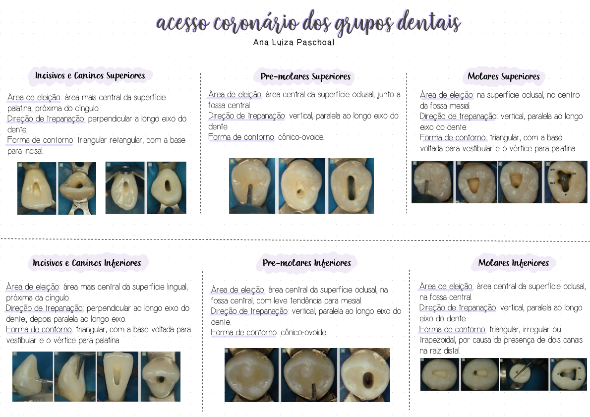 acesso coronário dos grupos dentais Ana Luiza Paschoal Incisivos e Caninos Superiores Área de eleição: área mais central da superfície palatina, próxima do cíngulo. Direção de trepanação: perpendicular a longo eixo do dente. Forma de contorno: triangular retangular, com a base para incisal. Pre-molares Superiores Área de eleição: área central da superfície oclusal, junto a fossa central. Direção de trepanação: vertical, paralela ao longo eixo do dente. Forma de contorno: cônico-ovoide. Molares Superiores Pre-molares Inferiores Molares Inferiores Área de eleição: na superfície oclusal, no centro da fossa mesial. Direção de trepanação: vertical, paralela ao longo eixo do dente. Forma de contorno: triangular, com a base voltada para vestibular e o vértice para palatina. Incisivos e Caninos Inferiores Área de eleição: área mais central da superfície lingual, próxima da cíngulo. Direção de trepanação: perpendicular ao longo eixo do dente., depois paralela ao longo eixo. Forma de contorno: triangular, com a base voltada para vestibular e o vértice para palatina. Área de eleição: área central da superfície oclusal, na fossa central, com leve tendência para mesial. Direção de trepanação: vertical, paralela ao longo eixo do dente. Forma de contorno: cônico-ovoide. acesso coronário dos grupos dentais Área de eleição: área central da superfície oclusal, na fossa central. Direção de trepanação: vertical, paralela ao longo eixo do dente. Forma de contorno: triangular, irregular ou trapezoidal, por causa da presença de dois canais na raiz distal. Mobile User anatomia interna anatomia internaesmalte dentina câmara pulpar cemento canal radicular ápice sistema de canais radiculares principal recorrente reticular cavo interadicular lateal ou adventício colateral ou bifurcado interconduto acessório delta apicalsecundário coroa raiz incisivo central superior 1 canal 75% reto curvatura vestibular incisivo lateral superior 1 canal longo desvio para D e P (terço apical) 80% achatamento MD canino 1 canal longo e amplo quase sempre reto 1º pre-molar superior 1 ou 2 raízes, 2 canais (V e L) acesso estreito no sentido MD pode apresentar 3 raízes e 3 canais 2º pre-molar superior 57,7% canal único achatamento MD septo de dentina 2 canais (2 ou 1 forame) curvatura p/ vestibular ou reta 1º molar superior 3 raízes 3 ou 4 canais (MV1, MV2, DV e P 2º molar superior 3 raízes separadas ou fusionadas canal MV2 (35%) canal DV centralizado incisivos superiores 73% canal único 27% 2 canais (V e L) acentuado achatamento MD pre-molares inferiores 2º PMI 89% de chance de 2 canais 1º molar inferior 2 raízes separadas 3º raiz DL 73% 3 canais (MV1, MV2 e D) 4º canal distal 1,3% 2º molar inferior 2 raízes separadas, 2 raízes fusionadas 3º raiz na face vestibular Ana Luiza Paschoal Mobile User