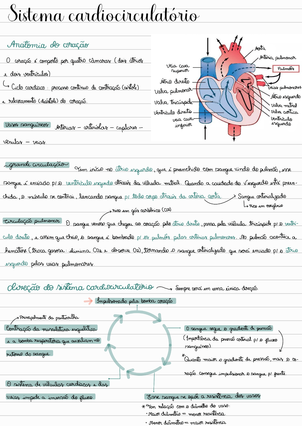 Sistema Anatomia do coração Aorta 0 coração é por quatro câmaras átrios Artéria pulmonar cava l dois superior Átrio direito Ciclo processo contínuo de contração (sistole) veias pulmonares e (diástole) do Átrio esquerdo valua mitral direito Valva aortica veia cava Vasos - arteriolas - capilares - inferior esquerdo - veias grande circulação Tem inicio no átrio que i preenchido com rangue vindo do pulmão, esse enviado ventriculo através Quando a cavidado do Vesquerdo está preen- chida D lancando sangue pl todo corpo através da artéria aorta Sangue arterializado Rico em rico em carbônico pulmonar sangue chegou pelo atrive passa pela váluula tricuspide pl D ventri- culo assim cheio, D sangue é bombeado pl or pelas artérias No a hematose (troca gasosa elimina CO2 e absorve tornando sangue arterializado que será enviado pl D esquerdo pelas direção do sistema Sempre em uma direção. Impulsionado pela bomba coração Principalmente da Contração da musculatura 0 rangue segue D gradiente de pressão a bomba respiratória que auxiliam no da pressão arterial p/ D do Quanto maior gradiente de mais D co- ração consegue impulsionar D sangue frente sistema de váluulas l das veias impede a do fluxo Erase sangue a resistincia dos vasos Tem relação com D do vaso: Maior diâmetro = menor Menor = maiorfunção do sistema cardiocirculatorio Transportar substancias através do Do meio externo interno do sangue pela hematose de nutrientes do intestino Dentro do próprio organismo Residuos de pelo cilulas do sistema imune, e nutrientes armagenados no figado e tecido Do mew interno pl externo Leva sangue rico em pl fora (hematose) e Circulação sistemica e pulmonar Veia cava Carótidas (2) superior Artéria pulmonar Pulmão Cabeça e cirebro Ascendente veia cava superior esquerdo Aorta AE Veia Descendente Átrio Veia pulmonar AD VE pulmonar figado VD Fígado veia cava Aorta rins inferior Veia cava Intestino e pernas inferior pulmonar Rim Rim pulmonares Átrio esquerdo coração como bomba Bombria Dangue para or vasor; fases do ciclo de relaxamento (enchimento dos que determina da sistole é fechamento das valuas Sistole ventricular: fase de contração ( bombeamento do sangue dos1 Diastase: câmaras relaxadas Início e ventrículo enche 5 passivamente atrial acontice anter Relaxamento Ventricular Iso- da ventricular Volumétrico: a medida que ventrículo relaxa, a pressão cai e fluxo retrógado fecha as 2 Sístole Atrial: força pequena valvas semilunares quantidade de sangue para os ventrículos. diastole 4 Ejeção Ventricular: a medida 3 Contração Ventricular que pressão ventricular Isovolumétrica: contração fecha aumenta e excede pressão nas valvas AV, mas não cria pressão artérias, abre valvas semilunar suficiente para abrir valvas e o sangue é ejetado semilunares Ciclo cardíaco Barulho ventricular (tum- som forte): 1° bulha cardíaca Decorre do fechamento das atriountriculares (promovido pela contração dos Representa D da sistole ventricular ventricular garantem que gue flua em uma única direção e não diástole ventricular (tum- som mais 2° bulha cardíaca aos após per yetado Decorre do fechamento das semilunares (promovido pela retração das paredes das (pressão arterial) Representa D da ventricular de enchimento ventricular importantes Volume de (VE) volume de sangue que coração bombeia corpo a cada contração VE = volume diastólico final (VDF) - volume sistólico final (VSF) VE USF cada vez que D bombeia em media 70mL de pl corpo. 135mL 65mL = 70mL Frequência cardíaca (FC) Quantidade de vezes coração bate em 1 Débito cardíaco (DC) Quantidade de sangue bombeado pelo coração por minuto X 70mL/bat = 5040mL/min (5L/min) Retorno (RV) Volume de retorna pl coraçãoque interferem no débito cardíaco SNA: Simpatico e 2. Retorno Frank-starling 3. Contratilidade do eoração de contração SNA Simpatico Potássio 1. Frequência nervojo (SNA) centro de controle SNA aumenta D: SNA aumenta D: em Saída grande quantidade Influxo de Na+ Efluxo de diminue D que aumenta a: de Frequincia de despolarização, As hiperpolarizadas e a aumentando a: Frequincia de diminuindo a: cardíaca cardíaca 2. Fatores que interferem no retorno Lei de Frank A contração da musculatura esquelitica que aperta as e aumenta D RV. Bomba (inspiração há aumento do RV pela negatividade do aumento da pressão abdominal Constrição das pela simpatica = diminuição do das vias) Volume de sangue aumenta D volume total, aumenta RV) Mecanismo de Frank-Starling (relação comprimento-tensão) 200 Quanto maior D venoso, maior D das É a capacidade intrínseca do coração de se adaptar a volumes variáveis de sangue Força: indicada pelo volume sistólico (mL) Valores normais 100 de repouso que chegam a ele. 70 TRV do assim, com maior forea D conseguirá De 0 Estabelece que coração, 0 100 135 200 300 400 dentro dos limites fisiológicos, Estiramento: indicado pelo volume ventricular diastólico final (mL) é capaz de ejetar todo 0 volume de sangue proveniente FIGURA 14-28 Relação comprimento-tensão em um do retorno venoso. coração sadio: curva de Starling. No coração sadio, volume sistólico é usado como um indicador de força contrátil.3. interferem contratilidade de contração do Sistema Concentração de cáleio (ca++) e potassio no extra - celular Maior influxo de Ca++ = maior de contração K+ = assim diminue a força de contração e a Simplificando ação do SNC sobre D DC SNA (noradrenalina) adrenalina FC Força de contração DC RUP RU SNA parasimpático FC DC