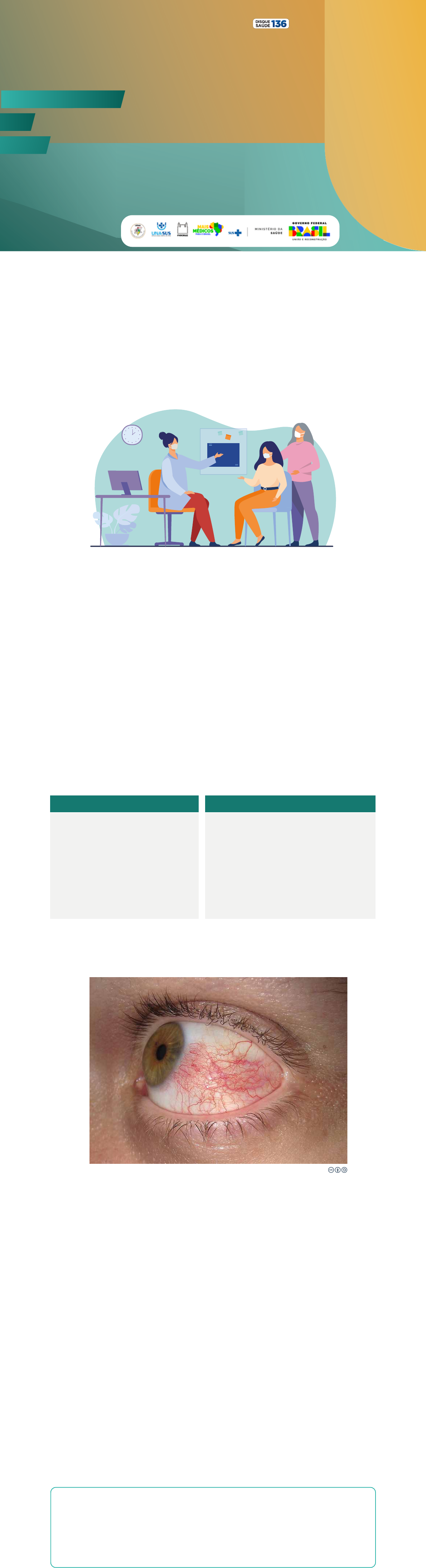Olá, profissional estudante! Na Atenção Primária à Saúde você poderá ter contato com várias situações relacionadas aos olhos e à visão que são muito comuns e muitas vezes não graves, mas que, ainda assim, precisam ser atendidas, avaliadas, tratadas e encaminhadas caso seja necessário. Neste recurso educacional, você deverá realizar uma abordagem diagnóstica e estabelecer o plano terapêutico para o caso clínico que será apresentado. Vamos lá? Usuária: Luciana, 17 anos. Fonte: UNA-SUS/UFMA Luciana, jovem de 17 anos, chega acompanhada de sua mãe, dona Marli, para atendimento. Luciana queixa-se de que os olhos estavam ardendo há alguns dias e que já há dois dias estão bem vermelhos. Acompanhe a conversa: - Doutor, por esses dias eu venho sentindo meus olhos ardendo. De uns dois dias para cá eles começaram a ficar bem vermelhos e hoje tá pior. Eu até passei um colírio, mas só melhorou uma horinha... – Neste momento, dona Marli interrompe sua filha e informa: - Ela só fica no computador jogando o dia todo, doutor. Tem depressão, toma os remédios direitinho, mas mesmo assim não quer sair de casa, aí passa o dia todo usando o celular, dentro do quarto, com o ar-condicionado ligado e jogando no computador, acaba cansando a vista desse jeito... - No começo, eu achei que era por causa das lentes que eu uso, mas já passei vários dias sem usar e não melhorou. Ficou meio seco e como se tivesse alguma coisa dentro... Dava até uma vontade grande de coçar! Com base nestas informações, os sintomas e alguns elementos da história de Luciana que puderam ser percebidos foram: Após ouvir a paciente e sua acompanhante, você pede para ver os olhos da Luciana, que possuem este aspecto: Fonte: Thepawn1 em Wikimedia Commons. Com base nessas informações, qual condição ocular você pode afirmar que Luciana tem e qual a abordagem terapêutica a ser orientada? Com base nas informações coletadas durante a consulta, o diagnóstico é o de Olho Seco, uma condição ocular bastante comum. Apesar de acometer com mais frequência idosos, também atinge jovens. Considerando os hábitos e a história de Luciana, há muitos fatores que corroboram o diagnóstico: uso de lentes de contato, muito tempo diante de telas, ambientes com ar-condicionado e uso de medicamentos antidepressivos. Além disso, as queixas apresentadas por Luciana também fazem parte da sintomatologia de Olho Seco: sensação de corpo estranho, olho seco, coceira e, por último, olho vermelho, que, por seu exame clínico, trata-se de uma hiperemia conjuntival moderada. O plano terapêutico não é difícil. Você pode receitar: • Lubrificantes oculares tópicos, de preferência em gel, para que a paciente não precise fazer reaplicações tão frequentemente; • Marcar uma nova consulta 4 (quatro) semanas depois para fins de reavaliação; • Como não há suspeita de outra doença subjacente, não é necessário encaminhar para outros níveis de atenção; • Não esquecer de orientar sobre os problemas relacionados ao uso de telas, ambiente com ar condicionado e uso de lentes de contato por muito tempo. No caso desta paciente, a orientação deve ser reduzir esses elementos para que esta condição não retorne frequentemente. © 2021. Ministério da Saúde. Sistema Universidade Aberta do SUS. Fundação Oswaldo Cruz & Universi- dade Federal do Maranhão. É permitida a reprodução, disseminação e utilização desta obra, em parte ou em sua totalidade, nos termos da licença para usuário final do Acervo de Recursos Educacionais em Saúde (ARES). Deve ser citada a fonte e é vedada sua utilização comercial, sem a autorização expressa dos seus autores, conf. Lei de Direitos Autorais-LDA. (Lei n.⁰9.610, de 19 de fevereiro de 1998). Coordenação do Projeto Ana Emilia Figueiredo de Oliveira Coordenação Geral da DTED/UNA-SUS/UFMA Ana Emilia Figueiredo de Oliveira Gestão de projetos da UNA-SUS/UFMA Amanda Rocha Araújo Coordenação de Produção Pedagógica da UNA-SUS/UFMA Paola Trindade Garcia Coordenação de Ofertas Educacionais da UNA-SUS/UFMA Elza Bernardes Monier Coordenação de Tecnologia da Informação da UNA-SUS/UFMA Mário Antonio Meireles Teixeira Coordenação de Comunicação da UNA-SUS/UFMA José Henrique Coutinho Pinheiro Professora-autora Steffi Greyce de Castro Lima Validador técnico Carlos Frederico Confort Campos Validadoras pedagógicas Aguardando Revisora textual Camila Cantanhede Vieira Designer instrucional Steffi Greyce de Castro Lima Designer Gráfico Vital Amorim Vital CRÉDITOS Como citar este material: LIMA, Steffi Greyce de Castro. Caso clínico: atendimento à condição ocular comum na APS. In: UNIVERSIDADE ABERTA DO SUS. UNIVERSIDADE FEDERAL DO MARANHÃO. Especialização Médicos pelo Brasil. Abordagem a problemas de olhos e visão. São Luís: UNA-SUS; UFMA, 2021. Sintomas Elementos da história da paciente • Sensação de secura nos olhos. • Coceira; • Ardência; • Olhos vermelhos; • Sensação de corpo estranho no olho; • Fez uso de um colírio sem prescrição médica. • Usa lentes de contato; • Permanece muito tempo em ambiente com ar-condicionado; • Faz uso exagerado de computador; • Luciana tem depressão e faz uso de medicamento antidepressivo; Programa Mais Médicos para o Brasil 2ª edição EIXO 4 | ATENÇÃO À SAÚDE Abordagem a problemas de olhos e visão MÓDULO 24