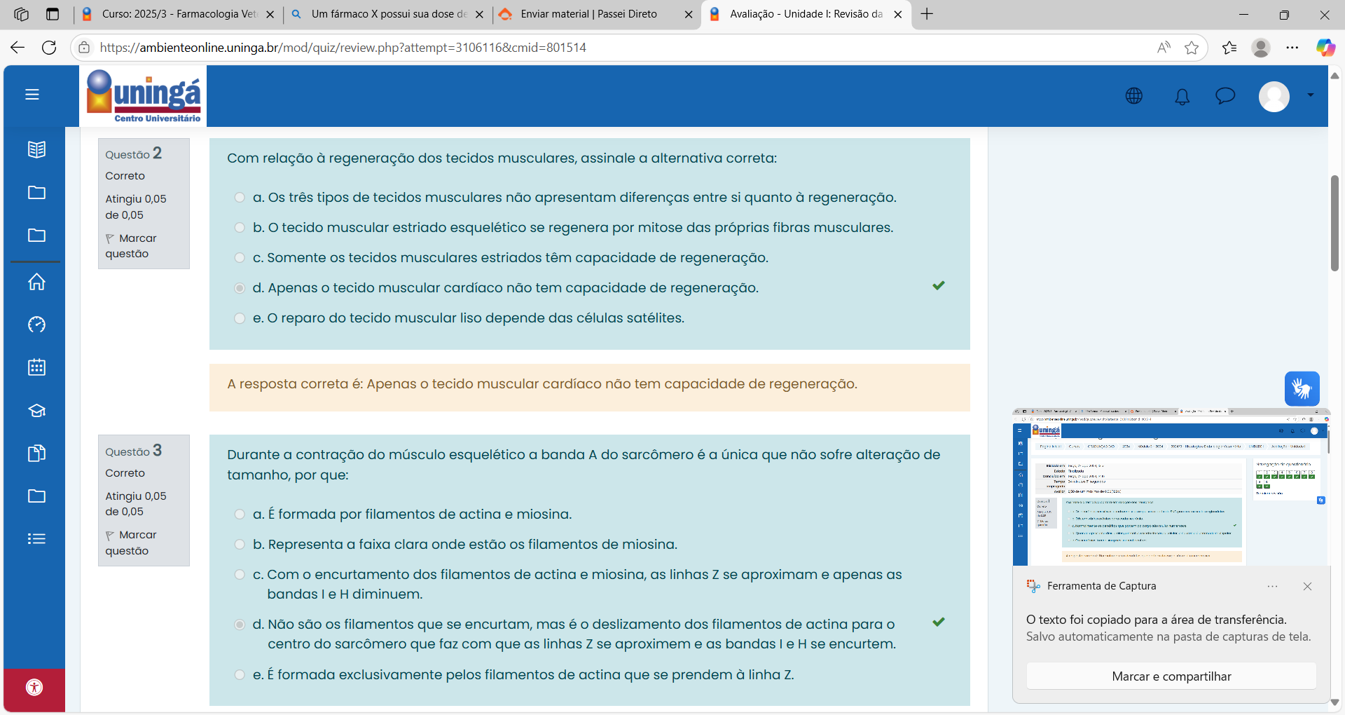 Curso: 2025/3 - Farmacologia Vet X Um fármaco X possui sua dose de X Enviar material Passei Direto X Avaliação Unidade I: Revisão da X + X uningá Centro Universitário Questão 2 Com relação à regeneração dos tecidos musculares, assinale a alternativa correta: Correto Atingiu 0,05 a. Os três tipos de tecidos musculares não apresentam diferenças entre si quanto à regeneração. de 0,05 b. tecido muscular estriado esquelético se regenera por mitose das próprias fibras musculares. Marcar questão C. Somente OS tecidos musculares estriados têm capacidade de regeneração. d. Apenas O tecido muscular cardíaco não tem capacidade de regeneração. e. reparo do tecido muscular liso depende das células satélites. A resposta correta é: Apenas tecido muscular cardíaco não tem capacidade de regeneração. = Questão 3 Durante a contração do músculo esquelético a banda A do sarcômero é a única que não sofre alteração de Correto tamanho, por que: Atingiu 0,05 de 0,05 a. É formada por filamentos de actina e miosina. Marcar questão b. Representa a faixa clara onde estão filamentos de miosina. C. Com encurtamento dos filamentos de actina e miosina, as linhas Z se aproximam e apenas as Ferramenta de Captura X bandas I e H diminuem. d. Não são filamentos que se encurtam, mas é deslizamento dos filamentos de actina para texto foi copiado para a área de transferência. centro do sarcômero que faz com que as linhas Z se aproximem e as bandas e H se encurtem. Salvo automaticamente na pasta de capturas de tela. e. É formada exclusivamente pelos filamentos de actina que se prendem à linha Z. Marcar e compartilhar