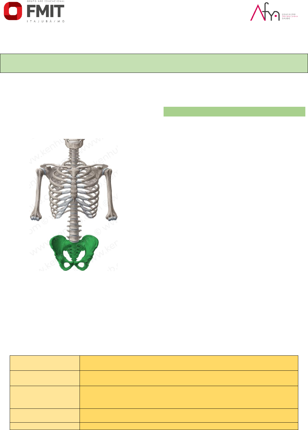 Pedro Lucas Cariri Moura – 2º Período FMIT – Faculdade de Medicina de Itajubá, 2020/1. Semana 15 – 04/06/2020 Sistemas Orgânicos Integrados II – SOI II, APG. Problema 29 – A queda da bacia Estudar a anatomia óssea do quadril e diferenciar a pelve masculina e feminina. A pelve é a parte mais inferior do tronco. Composta pela cintura pélvica e pelo períneo, ela sustenta os órgãos dos sistemas urinário e reprodutivo. Imagem 1. Pelve. Os órgãos pélvicos estão relacionados com o ato sexual e com a reprodução. Pelve O arcabouço ósseo da pelve é chamado de cin- tura pélvica. É composto pelos dois ossos do quadril (anca) e pelo sacro. Os ossos pélvicos são mantidos juntos pelas duas articulações principais da pelve: a sínfise púbica e a articulação sacrilíaca, que são reforçadas pelos músculos pélvicos. A cavidade pélvica se abre superiormente e é con- tínua com a cavidade abdominal através da aber- tura superior pélvica. Enquanto a abertura inferior pélvica é fechada pelo assoalho pélvico, composto pelo diafragma pélvico. Existem duas partes da pelve; pelve maior (falsa) e pelve menor (verdadeira). A pelve maior é encontrada superiormente à aber- tura superior pélvica e contém as partes inferiores dos órgãos abdominais. A pelve menor está localizada entre a abertura su- perior pélvica e a abertura inferior pélvica, e inclui os órgãos urinários distais, os órgãos reprodutores internos e o períneo. Aprenda mais sobre a pelve com a unidade de estudo abaixo. Pelve Definição: Região do tronco entre o abdome e o membro inferior. Partes: pelve maior, pelve menor, períneo. Períneo Definição: Parte da pelve menor que contém a genitália externa. Partes: trígono urogenital, trígono anal. Vísceras Partes distais do sistema urinário: ureter, bexiga urinária, uretra. Partes do trato alimentar: íleo terminal, cólon sigmoide, reto, ânus. Órgão reprodutivos: genitália interna, genitália externa. Vasos sanguíneos Artéria ilíaca interna, artérias gonadais, artéria sacral mediana, artéria retal superior. Nervos Plexo lombar, plexo sacral, plexo coccígeo, nervos esplâncnicos. Assoalho pélvico O assoalho pélvico é formado pelo diafragma pélvico, que possui um formato de funil. O diafragma pélvico é composto por um par de músculos e suas fáscias; o músculo levantador do ânus e o músculo coccígeo. A função do diafragma pélvico é sustentar os órgãos pélvicos e prevenir o seu prolapso. Imagem 2. Assoalho pélvico. O músculo levantador consiste em três partes: puborretal, pubococcígeo e iliococcígeo. A parte puborretal faz uma curva em “U” em torno da junção anorretal (alça puborretal), formando o hiato urogenital. Além do reto e da uretra em ambos os sexos, nas mulheres esse hiato também permite a passagem da vagina. Levantador do ânus Origem: face posterior dos corpos dos ossos púbicos (puborretal e pubococcígeo); arco tendíneo da fáscia obturadora interna, espinha isquiática (iliococcígeo). Inserção: alça puborretal (puborretal); ligamento anococcígeo, cóccix (pubococ- cígeo, iliococcígeo). Inervação: nervo para o levantador do ânus (S2-S4). Função: sustenta vísceras pélvicas, aumenta a pressão intra-abdominal, auxilia nas continências urinária e fecal. Coccígeo Origem: espinha isquiática. Inserção: extremidade inferior do sacro, cóccix. Inervação: ramos anteriores dos nervos espinhais S4-S5. Função: sustenta vísceras pélvicas, flexiona o cóccix. Períneo O períneo é a parte da pelve que contém a geni- tália externa e o ânus. É inferior ao diafragma pél- vico. Em relação à anatomia de superfície, a área perineal é a região entre as coxas, estendendo-se desde a sínfise púbica anterior até os sulcos inter- glúteos posteriormente. Uma linha imaginária conectando as tuberosidades isquiáticas divide o períneo em um trígono urogeni- tal (TUG) anteriormente, e um trígono anal posteri- ormente. O trígono anal inclui o reto e as duas fossas isquioanais. Essas fossas são preenchidas por tecido adiposo, que sustenta os movimentos do diafragma pélvico. Elas se comunicam com o TUG através de seus recessos anteriores. O trígono urogenital contém a membrana peri- neal e a fáscia superficial de Colles. Elas ligam dois espaços anatômicos dentro do TUG; a bolsa perineal superficial e a bolsa perineal profunda. Entre os sexos, há diferenças anatô- micas apenas no conteúdo do trígono urogeni- tal, uma vez que ele contém a genitália externa. Uma massa de tecidos conjuntivo, esquelético e muscular liso, chamada de corpo perineal, é encon- trada entre os trígonos. É a massa central do perí- neo que ancora a maior parte dos músculos perine- ais. Pelve Feminina A pelve feminina é mais ampla e mais larga do que a pelve masculina para proporcionar um ambiente confortável para o desenvolvimento do feto. A pelve maior faz parte da seção de estudo do abdômen, então não vamos gastar muito tempo com ela aqui. O íleo terminal e o cólon sigmoide são encon- trados dentro da pelve maior em ambos os se- xos. Pelve feminina menor Partes distais dos sistemas urinário e digestório: ureter, bexiga urinária, uretra e reto; Genitália interna: ovários, tubas uterinas, útero e vagina; Genitália externa, contida pelo períneo. Imagem 3. Anatomia da pelve feminina. Na vista medial, de anterior para posterior, vemos o reto imediatamente anterior ao cóccix, a bexiga uri- nária posterior à sínfise púbica e o útero entre os dois. O peritônio recobre as superfícies superiores desses órgãos, criando duas bolsas peritoneais: a bolsa reto-uterina de Douglas, entre o reto e o útero, e a bolsa vesico-uterina, entre o útero e a bexiga. Esses três órgãos se comunicam com o exterior do corpo, estendendo-se através do períneo: A uretra se estende da superfície inferior da be- xiga e se abre no orifício externo da uretra; A vagina se es