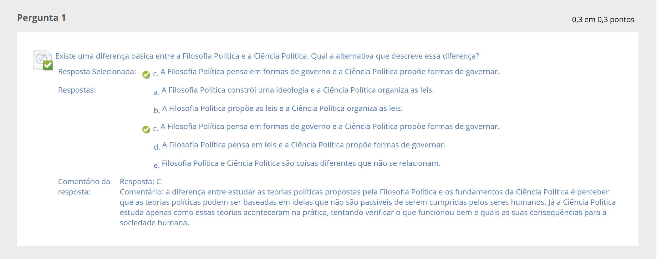 Pergunta 1 0,3 em 0,3 pontos Existe uma diferença básica entre a Filosofia Política e a Ciência Política. Qual a alternativa que descreve essa diferença? Resposta Selecionada: C. A Filosofia Política pensa em formas de governo e a Ciência Política propõe formas de governar. Respostas: a. A Filosofia Política constrói uma ideologia e a Ciência Política organiza as leis. b. A Filosofia Política propõe as leis e a Ciência Política organiza as leis. C. A Filosofia Política pensa em formas de governo e a Ciência Política propõe formas de governar. d. A Filosofia Política pensa em leis e a Ciência Política propõe formas de governar. e. Filosofia Política e Ciência Política são coisas diferentes que não se relacionam. Comentário da Resposta: resposta: Comentário: a diferença entre estudar as teorias políticas propostas pela Filosofia Política e os fundamentos da Ciência Política é perceber que as teorias políticas podem ser baseadas em ideias que não são passíveis de serem cumpridas pelos seres humanos. Já a Ciência Política estuda apenas como essas teorias aconteceram na prática, tentando verificar que funcionou bem e quais as suas consequências para a sociedade humana.