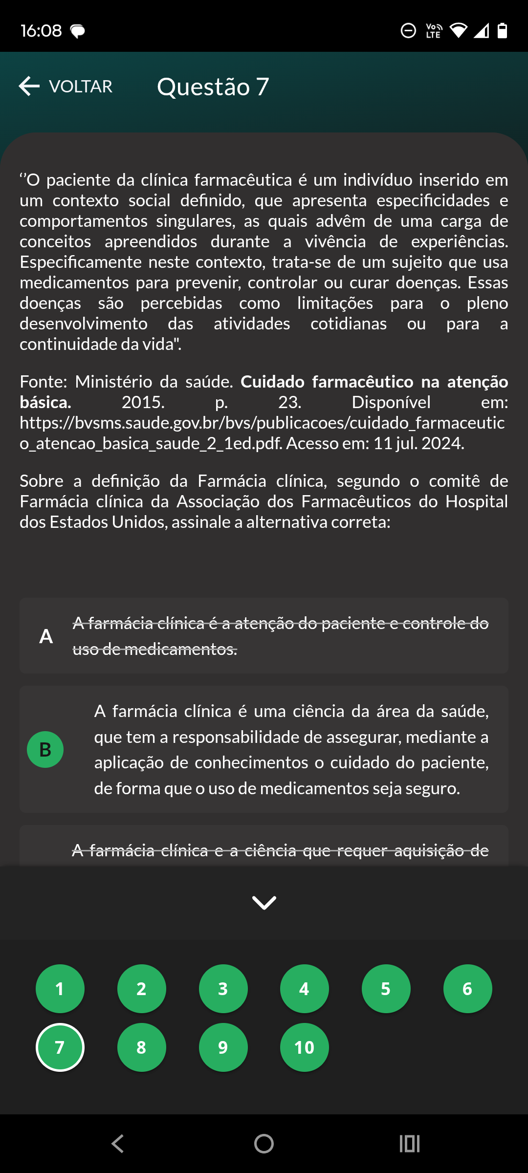 16:08 LTE VOLTAR Questão 7 "O paciente da clínica farmacêutica é um indivíduo inserido em um contexto social definido, que apresenta especificidades e comportamentos singulares, as quais advêm de uma carga de conceitos apreendidos durante a vivência de experiências. Especificamente neste contexto, trata-se de um sujeito que usa medicamentos para prevenir, controlar ou curar doenças. Essas doenças são percebidas como limitações para pleno desenvolvimento das atividades cotidianas ou para a continuidade da vida". Fonte: Ministério da saúde. Cuidado farmacêutico na atenção básica. 2015. p. 23. Disponível em: https://bvsms.saude.gov.br/bvs/publicacoes/cuidado_farmaceutic o_atencao_basica_saude_2_1ed.pdf.Acesso em: 11 jul. 2024. Sobre a definição da Farmácia clínica, segundo comitê de Farmácia clínica da Associação dos Farmacêuticos do Hospital dos Estados Unidos, assinale a alternativa correta: A farmácia clínica é a atenção do paciente e controle do uso de medicamentos. A farmácia clínica é uma ciência da área da saúde, que tem a responsabilidade de assegurar, mediante a aplicação de conhecimentos cuidado do paciente, de forma que uso de medicamentos seja seguro. A farmácia clínica e a ciência que requer aquisição de 1 2 3 4 5 6 7 8 9 10