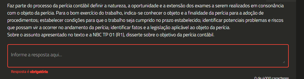 Faz parte do processo da perícia contábil definir a natureza, a oportunidade e a extensão dos exames a serem realizados em consonância com objeto da perícia. Para 0 bom exercício do trabalho, indica-se conhecer objeto e a finalidade da perícia para a adoção de procedimentos; estabelecer condições para que trabalho seja cumprido no prazo estabelecido; identificar potenciais problemas e riscos que possam vir a ocorrer no andamento da perícia; identificar fatos e a legislação aplicável ao objeto da perícia. Sobre 0 assunto apresentado no texto e a NBC TP 01 (R1), disserte sobre 0 objetivo da perícia contábil. Informe a resposta aqui... Resposta é obrigatória de 4000 caracteres