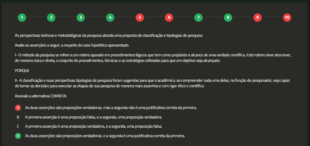 1 2 3 4 5 6 7 8 9 10 As perspectivas teóricas e metodológicas da pesquisa aborda uma proposta de classificação e tipologias de pesquisa. Avalie as asserções a seguir, a respeito do caso hipotético apresentado. I- 0 método da pesquisa se refere a um roteiro apoiado em procedimentos lógicos que tem como propósito 0 alcance de uma verdade Este roteiro deve descrever, de maneira clara e direta, 0 conjunto de procedimentos, técnicas e as estratégias utilizadas para que um objetivo seja alcançado. PORQUE II- A classificação e suas perspectivas tipologias de pesquisa foram sugeridas para que 0 acadêmico, ao compreender cada uma delas, na função de pesquisador, seja capaz de tomar as decisões para executar as etapas de sua pesquisa de maneira mais assertiva e com rigor ético e científico. Assinale a alternativa CORRETA: A As duas asserções são proposições verdadeiras, mas a segunda não uma justificativa correta da primeira. B A primeira asserção é uma proposição falsa, e a segunda, uma proposição verdadeira. C A primeira asserção uma proposição verdadeira, e a segunda, uma proposição falsa. D As duas asserções são proposições verdadeiras, e a segunda é uma justificativa correta da primeira.