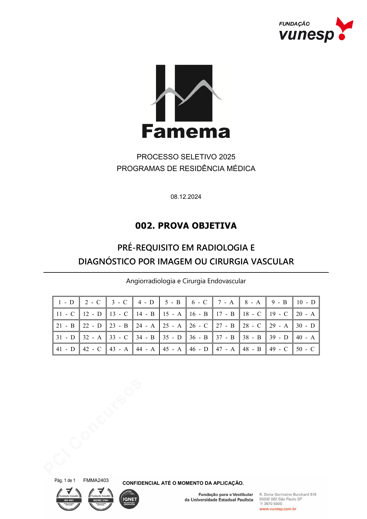 pcimarkpci MjgwNDowMTRjOjAxMDk6OGI0YTpiNGRiOjI4NzA6ZjBjYzpiYzcz:VGh1LCAxMSBTZXAgMjAyNSAwOToyODowMyAtMDMwMA== www.pciconcursos.com.br Pág. 1 de 1 FMMA2403 CONFIDENCIAL ATÉ O MOMENTO DA APLICAÇÃO. PROCESSO SELETIVO 2025 PROGRAMAS DE RESIDÊNCIA MÉDICA 08.12.2024 002. PROVA OBJETIVA PRÉ-REQUISITO EM RADIOLOGIA E DIAGNÓSTICO POR IMAGEM OU CIRURGIA VASCULAR Angiorradiologia e Cirurgia Endovascular 1 - D 2 - C 3 - C 4 - D 5 - B 6 - C 7 - A 8 - A 9 - B 10 - D 11 - C 12 - D 13 - C 14 - B 15 - A 16 - B 17 - B 18 - C 19 - C 20 - A 21 - B 22 - D 23 - B 24 - A 25 - A 26 - C 27 - B 28 - C 29 - A 30 - D 31 - D 32 - A 33 - C 34 - B 35 - D 36 - B 37 - B 38 - B 39 - D 40 - A 41 - D 42 - C 43 - A 44 - A 45 - A 46 - D 47 - A 48 - B 49 - C 50 - C pcimarkpci MjgwNDowMTRjOjAxMDk6OGI0YTpiNGRiOjI4NzA6ZjBjYzpiYzcz:VGh1LCAxMSBTZXAgMjAyNSAwOToyODowMyAtMDMwMA== www.pciconcursos.com.br Pág. 1 de 1 FMMA2403 CONFIDENCIAL ATÉ O MOMENTO DA APLICAÇÃO. PROCESSO SELETIVO 2025 PROGRAMAS DE RESIDÊNCIA MÉDICA 08.12.2024 003. PROVA OBJETIVA PRÉ-REQUISITO EM CLÍNICA MÉDICA Cardiologia | Endocrinologia e Metabologia | Geriatria | Hematologia e Hemoterapia | Reumatologia 1 - D 2 - A 3 - D 4 - A 5 - D 6 - A 7 - C 8 - B 9 - B 10 - D 11 - C 12 - B 13 - A 14 - B 15 - C 16 - A 17 - B 18 - D 19 - B 20 - C 21 - C 22 - D 23 - B 24 - B 25 - D 26 - D 27 - B 28 - A 29 - A 30 - B 31 - A 32 - C 33 - B 34 - B 35 - A 36 - C 37 - A 38 - A 39 - D 40 - C 41 - D 42 - C 43 - B 44 - C 45 - D 46 - A 47 - B 48 - A 49 - D 50 - C pcimarkpci MjgwNDowMTRjOjAxMDk6OGI0YTpiNGRiOjI4NzA6ZjBjYzpiYzcz:VGh1LCAxMSBTZXAgMjAyNSAwOToyODowMyAtMDMwMA== www.pciconcursos.com.br Pág. 1 de 1 FMMA2403 CONFIDENCIAL ATÉ O MOMENTO DA APLICAÇÃO. PROCESSO SELETIVO 2025 PROGRAMAS DE RESIDÊNCIA MÉDICA 08.12.2024 001. PROVA OBJETIVA ÁREAS BÁSICAS E ACESSO DIRETO Anestesiologia | Cirurgia Geral | Clínica Médica | Dermatologia | Ginecologia e Obstetrícia | Infectologia | Medicina De Emergência | Medicina De Família e Comunidade | Medicina Física e Reabilitação | Medicina Intensiva | Neurologia | Oftalmologia | Ortopedia e Traumatologia | Otorrinolaringologia | Pediatria | Psiquiatria | Radiologia e Diagnóstico por Imagem 1 - A 2 - D 3 - C 4 - B 5 - B 6 - A 7 - A 8 - A 9 - B 10 - B 11 - C 12 - D 13 - C 14 - C 15 - D 16 - D 17 - A 18 - C 19 - D 20 - B 21 - B 22 - C 23 - D 24 - A 25 - C 26 - B 27 - D 28 - A 29 - B 30 - C 31 - D 32 - A 33 - B 34 - C 35 - C 36 - A 37 - D 38 - D 39 - A 40 - B 41 - B 42 - B 43 - C 44 - C 45 - A 46 - C 47 - C 48 - B 49 - D 50 - C 51 - A 52 - C 53 - D 54 - B 55 - B 56 - C 57 - D 58 - D 59 - A 60 - A 61 - D 62 - C 63 - B 64 - A 65 - C 66 - A 67 - D 68 - A 69 - B 70 - B 71 - D 72 - C 73 - A 74 - C 75 - B 76 - C 77 - B 78 - D 79 - A 80 - C 81 - D 82 - C 83 - B 84 - B 85 - D 86 - C 87 - A 88 - B 89 - C 90 - D 91 - A 92 - D 93 - C 94 - D 95 - B 96 - D 97 - B 98 - A 99 - C 100 - A pcimarkpci MjgwNDowMTRjOjAxMDk6OGI0YTpiNGRiOjI4NzA6ZjBjYzpiYzcz:VGh1LCAxMSBTZXAgMjAyNSAwOToyODowMyAtMDMwMA== www.pciconcursos.com.br Pág. 1 de 1 FMMA2403 CONFIDENCIAL ATÉ O MOMENTO DA APLICAÇÃO. PROCESSO SELETIVO 2025 PROGRAMAS DE RESIDÊNCIA MÉDICA 08.12.2024 005. PROVA OBJETIVA PRÉ-REQUISITO EM PEDIATRIA Medicina Intensiva Pediátrica | Oncologia Pediátrica 1 - A 2 - B 3 - D 4 - C 5 - B 6 - A 7 - A 8 - D 9 - D 10 - B 11 - D 12 - B 13 - B 14 - A 15 - C 16 - D 17 - A 18 - C 19 - A 20 - C 21 - D 22 - B 23 - A 24 - C 25 - A 26 - D 27 - D 28 - D 29 - B 30 - B 31 - B 32 - B 33 - C 34 - C 35 - A 36 - C 37 - A 38 - D 39 - C 40 - A 41 - A 42 - D 43 - D 44 - D 45 - C 46 - B 47 - B 48 - C 49 - B 50 - A pcimarkpci MjgwNDowMTRjOjAxMDk6OGI0YTpiNGRiOjI4NzA6ZjBjYzpiYzcz:VGh1LCAxMSBTZXAgMjAyNSAwOToyODowMyAtMDMwMA== www.pciconcursos.com.br Pág. 1 de 1 FMMA2403 CONFIDENCIAL ATÉ O MOMENTO DA APLICAÇÃO. PROCESSO SELETIVO 2025 PROGRAMAS DE RESIDÊNCIA MÉDICA 08.12.2024 004. PROVA OBJETIVA PRÉ-REQUISITO EM CIRURGIA GERAL/ÁREA CIRÚRGICA BÁSICA Cirurgia do Aparelho Digestivo | Cirurgia Plástica | Cirurgia Vascular | Urologia 1 - C 2 - B 3 - C 4 - D 5 - B 6 - A 7 - B 8 - C 9 - D 10 - B 11 - A 12 - D 13 - D 14 - B 15 - A 16 - C 17 - D 18 - A 19 - C 20 - B 21 - A 22 - D 23 - C 24 - D 25 - A 26 - B 27 - D 28 - B 29 - A 30 - B 31 - C 32 - D 33 - C 34 - B 35 - D 36 - C 37 - B 38 - A 39 - A 40 - D 41 - B 42 - D 43 - C 44 - B 45 - A 46 - C 47 - B 48 - A 49 - A 50 - C