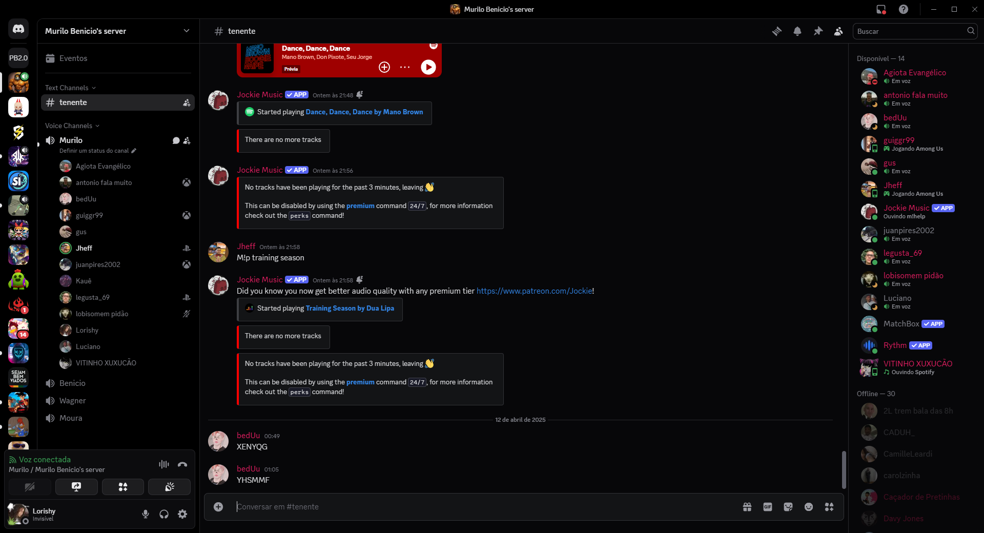 Murilo Benicio's server ? Murilo Benicio's server # tenente Buscar Dance, Dance, Dance PB2.0 Eventos Mano Brown, Don Pixote, Seu Jorge Disponível 14 Prévia + Agiota Evangélico Em voz Text Channels Jockie Music APP Ontem 21:48 antonio fala muito # tenente Em voz Started playing Dance, Dance, Dance by Mano Brown bedUu Voice Channels Em voz Murilo There are no more tracks guiggr99 Definir um status do canal Jogando Among Us Agiota Evangélico gus Jockie Music APP Ontem as 21:56 Em voz SI antonio fala muito No tracks have been playing for the past 3 minutes, leaving Jheff Jogando Among Us bedUu This can be disabled by using the premium command 24/7, for more information Jockie Music APP guiggr99 check out the perks command! Ouvindo m!help gus juanpires2002 Em voz Jheff Jheff Ontem 21:58 M!p training season legusta_ 69 Em voz juanpires2002 Jockie Music lobisomem pidão Ontem 21:58 Em voz Did you know you now get better audio quality with any premium tier https://www.patreon.com/Jockiel! legusta_ 69 Luciano Started playing Training Season by Dua Lipa Em voz lobisomem pidão MatchBox Lorishy There are no more tracks Luciano Rythm APP VITINHO XUXUCÃO No tracks have been playing for the past 3 minutes, leaving VITINHO XUXUCÃO SEJAM Ouvindo Spotify VIADOS Benicio This can be disabled by using the premium command 24/7, for more information check out the perks command! Offline 30 Wagner 2L trem bala das 8h Moura 12 de abril de 2025 bedUu 00:49 CADUH_ XENYQG CamilleLeardi Voz conectada Murilo / Murilo Benicio's server bedUu 01:05 carolzinha YHSMMF Caçador de Pretinhas Conversar em #tenente Lorishy Invisivel Davy Jones
