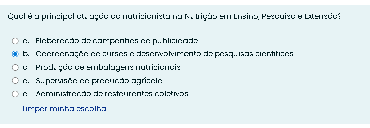 Qual é a principal atuação do nutricionista na Nutrição em Ensino, Pesquisa e Extensão? Elaboração de campanhas de publicidade b. Coordenação de cursos e desenvolvimento de pesquisas C. Produção de embalagens nutricionais d. Supervisão da produção agricola e. Administração de restaurantes coletivos Limpar minha escolha