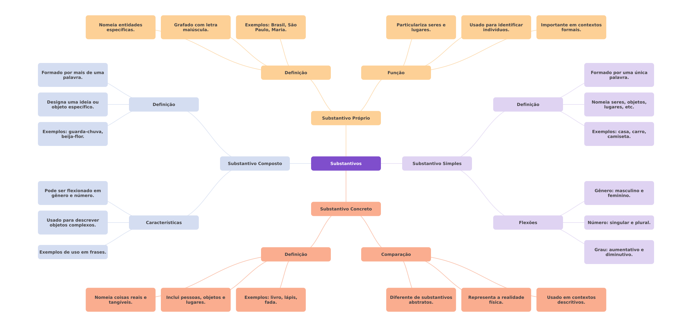 Nomeia entidades Grafado com letra Exemplos: Brasil, São Particulariza seres e Usado para identificar Importante em contextos específicas. maiúscula. Paulo, Maria. lugares. indivíduos. formais. Formado por mais de uma Definição Função Formado por uma única palavra. palavra. Designa uma ideia ou objeto específico. Definição Definição Nomeia seres, objetos, lugares, etc. Substantivo Próprio Exemplos: guarda-chuva, Exemplos: casa, carro, beija-flor. camiseta. Substantivo Composto Substantivos Substantivo Simples Pode ser flexionado em Gênero: masculino e gênero e número. feminino. Substantivo Concreto Usado para descrever Características Flexões objetos complexos. Número: singular e plural. Grau: aumentativo e Exemplos de uso em frases. Definição Comparação diminutivo. Nomeia coisas reais e Inclui pessoas, objetos e Exemplos: livro, lápis, Diferente de substantivos Representa a realidade Usado em contextos tangíveis. lugares. fada. abstratos. física. descritivos.