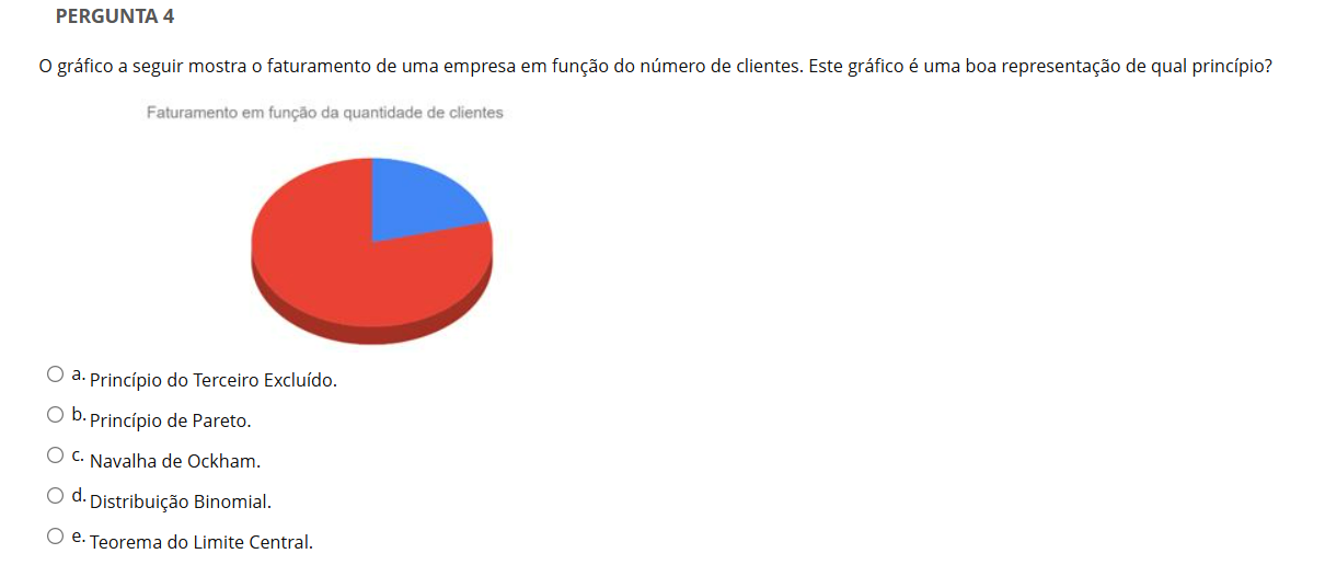 PERGUNTA 4 gráfico a seguir mostra faturamento de uma empresa em função do número de clientes. Este gráfico é uma boa representação de qual princípio? Faturamento em função da quantidade de clientes a. Princípio do Terceiro Excluído. b. Princípio de Pareto. C. Navalha de Ockham. d. Distribuição Binomial. e. Teorema do Limite Central.