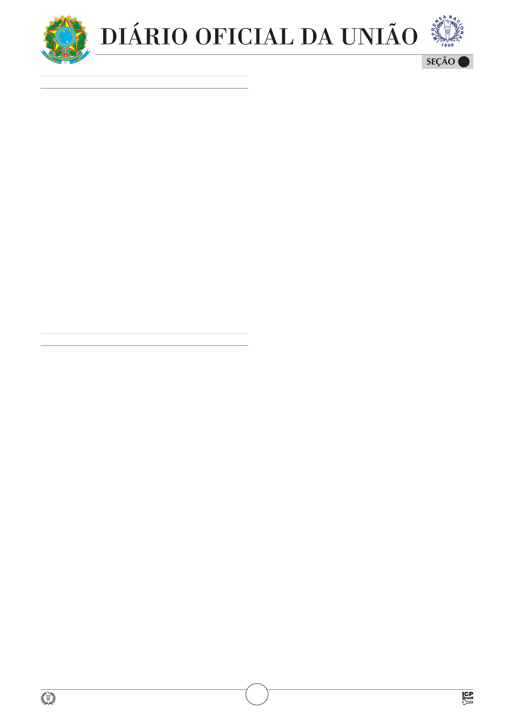 REPÚBLICA FEDERATIVA DO BRASIL • IMPRENSA NACIONAL Ano LXVI Nº 173 Brasília - DF, quinta-feira, 11 de setembro de 2025 ISSN 1677-7050 2 Documento assinado digitalmente conforme MP nº 2.200-2 de 24/08/2001, que institui a Infraestrutura de Chaves Públicas Brasileira - ICP-Brasil. Este documento pode ser verificado no endereço eletrônico http://www.in.gov.br/autenticidade.html, pelo código 05292025091100001 1 Sumário Presidência da República .......................................................................................................... 1 Ministério da Agricultura e Pecuária ....................................................................................... 5 Ministério das Cidades.............................................................................................................. 6 Ministério da Ciência, Tecnologia e Inovação......................................................................... 6 Ministério das Comunicações ................................................................................................... 7 Ministério da Cultura ................................................................................................................ 8 Ministério da Defesa................................................................................................................. 9 Ministério do Desenvolvimento Agrário e Agricultura Familiar ........................................... 13 Ministério do Desenvolvimento e Assistência Social, Família e Combate à Fome ............ 14 Ministério do Desenvolvimento, Indústria, Comércio e Serviços......................................... 14 Ministério dos Direitos Humanos e da Cidadania ................................................................ 16 Ministério da Educação........................................................................................................... 16 Ministério da Fazenda............................................................................................................. 42 Ministério da Gestão e da Inovação em Serviços Públicos ................................................. 44 Ministério da Integração e do Desenvolvimento Regional .................................................. 47 Ministério da Justiça e Segurança Pública ............................................................................ 48 Ministério do Meio Ambiente e Mudança do Clima............................................................ 51 Ministério de Minas e Energia ............................................................................................... 53 Ministério das Mulheres ......................................................................................................... 53 Ministério do Planejamento e Orçamento ............................................................................ 53 Ministério de Portos e Aeroportos ........................................................................................ 54 Ministério dos Povos Indígenas.............................................................................................. 55 Ministério da Previdência Social ............................................................................................ 55 Ministério das Relações Exteriores ........................................................................................ 57 Ministério da Saúde ................................................................................................................ 58 Ministério do Trabalho e Emprego........................................................................................ 62 Ministério dos Transportes ..................................................................................................... 63 Banco Central do Brasil .......................................................................................................... 63 Controladoria-Geral da União................................................................................................. 63 Conselho Nacional do Ministério Público.............................................................................. 64 Ministério Público da União ................................................................................................... 64 Defensoria Pública da União .................................................................................................. 66 Poder Legislativo ..................................................................................................................... 66 Poder Judiciário ....................................................................................................................... 68 Entidades de Fiscalização do Exercício das Profissões Liberais ........................................... 73 Editais e Avisos........................................................................................................................ 74 ................................... Esta edição é composta de 75 páginas .................................. Presidência da República CASA CIVIL PORTARIAS DE 10 DE SETEMBRO DE 2025 SECRETARIA DE COMUNICAÇÃO SOCIAL O MINISTRO DE ESTADO DA CASA CIVIL DA PRESIDÊNCIA DA REPÚBLICA, no uso de suas atribuições e tendo em vista o disposto no art. 4º do Decreto nº 9.794, de 14 de maio de 2019, resolve: Nº 1.124 - D ES I G N A R GIOVANO JOSÉ FELIPIN, para exercer a função de Assessor Especial do Gabinete da Secretaria de Comunicação Social da Presidência da República, código FCE 2.15, ficando dispensado da função que atualmente ocupa. RUI COSTA DOS SANTOS MINISTÉRIO DA EDUCAÇÃO O MINISTRO DE ESTADO DA CASA CIVIL DA PRESIDÊNCIA DA REPÚBLICA, no uso de suas atribuições e tendo em vista o disposto no art. 4º do Decreto nº 9.794, de 14 de maio de 2019, resolve: Nº 1.125 - N O M EA R MARIANA ANDRIOTTI FUZER, para exercer o cargo de Diretora do Centr