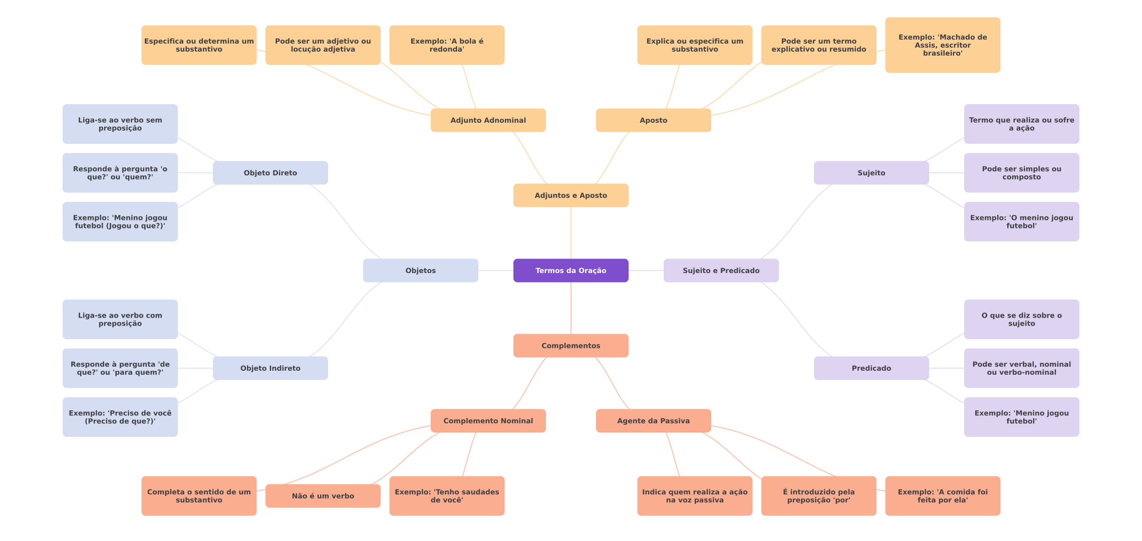 Especifica ou determina um Pode ser um adjetivo ou Exemplo: 'A bola é Explica ou especifica um Pode ser um termo Exemplo: 'Machado de redonda' Assis, escritor substantivo locução adjetiva substantivo explicativo ou resumido brasileiro' Liga-se ao verbo sem Adjunto Adnominal Aposto Termo que realiza ou sofre preposição a ação Responde à pergunta 'o que?' ou 'quem?' Objeto Direto Sujeito Pode ser simples ou composto Adjuntos e Aposto Exemplo: 'Menino jogou Exemplo: 'O menino jogou futebol (Jogou que?)' futebol' Objetos Termos da Oração Sujeito e Predicado Liga-se ao verbo com que se diz sobre preposição sujeito Complementos Responde à pergunta 'de Pode ser verbal, nominal Objeto Indireto Predicado que?' ou 'para quem?' ou verbo-nominal Exemplo: 'Preciso de você Exemplo: 'Menino jogou (Preciso de que?)' Complemento Nominal Agente da Passiva futebol' Completa sentido de um Não é um verbo Exemplo: 'Tenho saudades Indica quem realiza a ação É introduzido pela Exemplo: A comida foi substantivo de na voz passiva preposição 'por' feita por ela'
