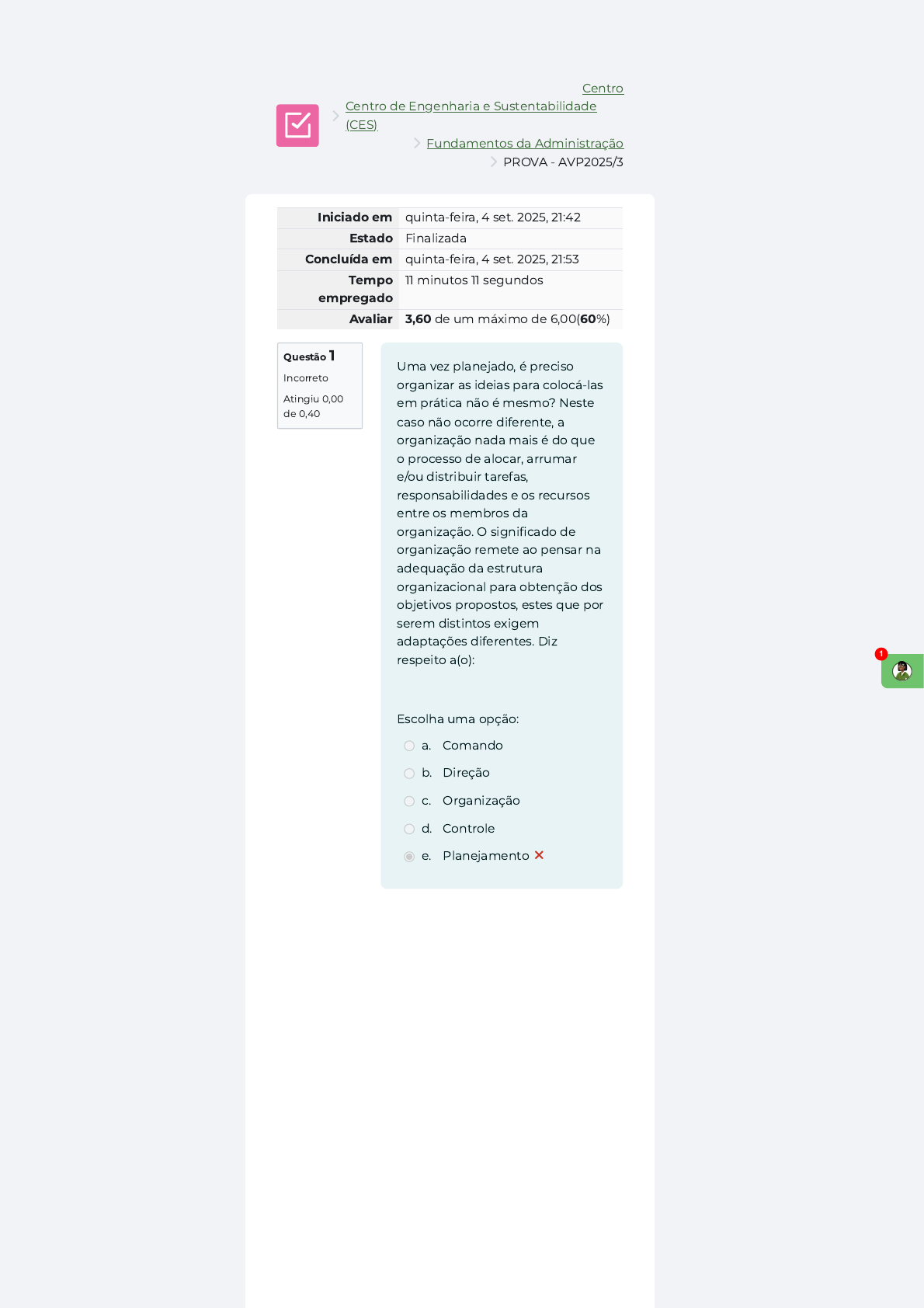 Centro 〉 Centro de Engenharia e Sustentabilidade (CES) 〉 Fundamentos da Administração 〉 PROVA - AVP2025/3 Questão 1 Incorreto Atingiu 0,00 de 0,40 Iniciado em quinta-feira, 4 set. 2025, 21:42 Estado Finalizada Concluída em quinta-feira, 4 set. 2025, 21:53 Tempo empregado 11 minutos 11 segundos Avaliar 3,60 de um máximo de 6,00(60%) Uma vez planejado, é preciso organizar as ideias para colocá-las em prática não é mesmo? Neste caso não ocorre diferente, a organização nada mais é do que o processo de alocar, arrumar e/ou distribuir tarefas, responsabilidades e os recursos entre os membros da organização. O significado de organização remete ao pensar na adequação da estrutura organizacional para obtenção dos objetivos propostos, estes que por serem distintos exigem adaptações diferentes. Diz respeito a(o): Escolha uma opção: a. Comando b. Direção c. Organização d. Controle e. Planejamento × 1 https://ava.graduacaoead.unicv.edu.br/course/index.php?categoryid=267 https://ava.graduacaoead.unicv.edu.br/course/index.php?categoryid=271 https://ava.graduacaoead.unicv.edu.br/course/index.php?categoryid=271 https://ava.graduacaoead.unicv.edu.br/course/view.php?id=13448#section-5 Questão 2 Incorreto Atingiu 0,00 de 0,40 Questão 3 Correto Atingiu 0,40 de 0,40 Relacionado à administração, assinale a opção incorreta: Escolha uma opção: a. administrar é obter resultados por meio de pessoas, ou seja, é o ato de trabalhar com pessoas para realizar os objetivos da organização e de seus membros. × b. Administração não está relacionada com alcance de objetivos por meio dos esforços de outras pessoas. c. a administração é a maneira que temos para melhorar os processos e os resultados das organizações. d. Administração é o sistema estruturado e intuitivo que consolida um conjunto de princípios, processos e funções para alavancar, harmoniosamente, o processo de planejamento de situações futuras desejadas. e. Administrar os processos pode levar a organização a atingir seus objetivos, o que estenderia seu tempo de vida. Já a organização que não aprimora seus procedimentos tende a alongar o caminho para atingir seus objetivos ou até mesmo encurtar seu tempo de vida. Acontece quando o receptor já tem uma imagem formada sobre o assunto em questão ou quando não simpatiza com o emissor. Nessas situações, é comum que o ouvinte se coloque nessa situação, rejeitando aquilo que é dito antes mesmo de compreender seu real significado. Escolha uma opção: a. Credibilidade. b. Defensiva. ✓ c. Distração. d. Confusão. e. Presunção. 1 Questão 4 Correto Atingiu 0,40 de 0,40 É composta, essencialmente, do que comunicamos, em todas as suas formas, e o significado que as pessoas derivam disto. Desde a escolha do local físico, do mobiliário, da forma como o espaço está dividido, do nome, da grafia, das cores, do jeito como falamos, das palavras que escolhemos ao tom de voz que usamos em cada situação… Tudo que fazemos, falamos e escolhemos comunica a forma como vemos o mundo, como nos posicionamos dentro dele e com que tipo de pessoas queremos nos relacionar. E como esperamos que as pessoas respondam a isto. Escolha uma opção: a. Cultura estrutural. b. Cultura organizacional. ✓ c. Recursos humanos. d. Gestão de pessoas. e. Comunicação empresarial. 1 Questão 5 Incorreto Atingiu 0,00 de 0,40 O mercado atual tem se mostrado altamente competitivo e as empresas lutam para se destacar perante as demais. A acirrada disputa por consumidores faz com que a organização mobilize esforços a fim de satisfazer suas necessidades não atendidas. Esse novo cenário competitivo leva as organizações a revisar suas estratégias e a almejar, cada vez mais, melhores níveis de competitividade e de excelência. As empresas buscam profissionais qualificados e competentes em suas funções. Diante do constante crescimento do estudo e aplicação das competências no meio empresarial, torna-se importante apontar quais são, de fato, as principais habilidades para a atuação do administrador na atualidade. Assim sendo julgue as afirmativas abaixo. I. Habilidades técnicas: em nível de administração operacional, são aquelas inerentes ao uso de conhecimento especializado para execução de técnicas relacionadas com o trabalho. Dizem respeito ao desempenho de funções ou trabalhos especializados dentro da organização. Realização de tarefas específicas. II. Habilidades humanas: em nível de alta administração, exige visão geral da organização. Trabalha com ideias e conceitos, teorias e abstrações. Capacidade de compreender a organização como um todo. III. Habilidades conceituais: em nível de administração média, relaciona-se diretamente com o trabalho com pessoas. Relacionamento interpessoal ou em grupo. Capacidade de trabalhar com pessoas. Assinale a alternativa correta: Escolha uma opção: a. Apenas III está correta. b. Apenas I está correta. c. Apenas II e III estão corretas. d. Apenas I e II estão corretas. × e. Apenas II está correta. 1 Questão 6 Correto Atingiu 0,40 de 0,40 A comunicação sempre foi reconhecida como sendo de extrema importância nas atividades das organizações ou das pessoas, e essa importância tende a cada vez mais aumentar sua influência nos resultados, pois a velocidade da comunicação aumenta a cada dia que passa. Sobre comunicação empresarial é correto o que se afirma em. Escolha uma opção: a. Pode ocorrer a partir do envolvimento de apenas uma das partes. b. Importante, porém não tem papel essencial na administração da empresa, pois as preocupações do administrador são outras, como custos de insumos por exemplo. c. A comunicação empresarial é a maneira com que uma organização se comunica com os stakeholders. ✓ d. Deve ser considerada como fundamental nos departamentos que possuem contato direto com o cliente, nos demais pode ter menor foco. e. O processo da comunicaç
