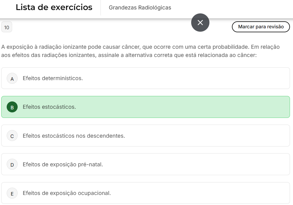 Lista de exercícios Grandezas Radiológicas X 10 Marcar para revisão A exposição à radiação ionizante pode causar câncer, que ocorre com uma certa probabilidade. Em relação aos efeitos das radiações ionizantes, assinale a alternativa correta que está relacionada ao câncer: A Efeitos determinísticos. Efeitos estocásticos. C Efeitos estocásticos nos descendentes. D Efeitos de exposição pré-natal. E Efeitos de exposição ocupacional.