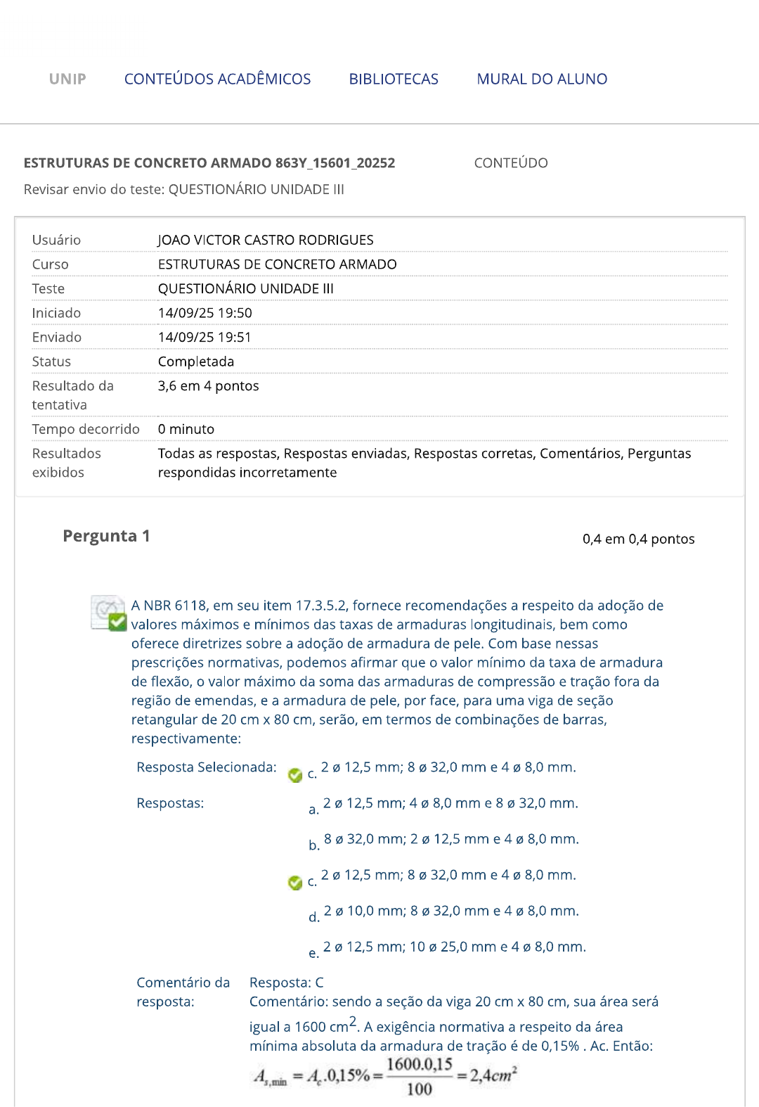 UNIP CONTEÚDOS ACADÊMICOS BIBLIOTECAS MURAL DO ALUNO ESTRUTURAS DE CONCRETO ARMADO 863Y_15601_20252 CONTEÚDO Revisar envio do teste: QUESTIONÁRIO UNIDADE III Usuário JOAO VICTOR CASTRO RODRIGUES Curso ESTRUTURAS DE CONCRETO ARMADO Teste QUESTIONÁRIO UNIDADE III Iniciado 14/09/25 19:50 Enviado 14/09/25 19:51 Status Completada Resultado da 3,6 em 4 pontos tentativa Tempo decorrido 0 minuto Resultados Todas as respostas, Respostas enviadas, Respostas corretas, Comentários, Perguntas exibidos respondidas incorretamente Pergunta 1 0,4 em 0,4 pontos A NBR 6118, em seu item 17.3.5.2, fornece recomendações a respeito da adoção de valores máximos e mínimos das taxas de armaduras longitudinais, bem como oferece diretrizes sobre a adoção de armadura de pele. Com base nessas prescrições normativas, podemos afirmar que o valor mínimo da taxa de armadura de flexão, valor máximo da soma das armaduras de compressão e tração fora da região de emendas, e a armadura de pele, por face, para uma viga de seção retangular de 20 cm X 80 cm, serão, em termos de combinações de barras, respectivamente: Resposta Selecionada: mm; 8 32,0 mm e mm. Respostas: mm; mm e mm. a. b. mm; mm e mm. mm; 8 32,0 mm e mm. d. mm; mm e mm. mm; 10 25,0 mm e mm. e. Comentário da Resposta: resposta: Comentário: sendo a seção da viga 20 cm X 80 cm, sua área será igual a 1600 A exigência normativa a respeito da área mínima absoluta da armadura de tração é de 0,15% Então: 1600.0,15 100Já a armadura longitudinal máxima, na região onde não houver emendas, será: = 1600.4 100 Por fim, como h = 80 cm > 60 cm, a armadura de pele em cada face da alma da viga será calculada pela expressão: = 1600.0,1 100 1,6cm² Deve-se, então, eleger as combinações de diâmetros comerciais de barras de aço, mais próximas dos valores calculados. Assim, conforme indica a figura a seguir, as combinações serão: Área de aço da seção conforme número de barras diâmetro (mm) 1 2 3 4 5 6 7 8 9 10 5,0 0,20 1,20 1.40 1,60 1,80 2,00 6,3 0,315 0,63 0,945 1,26 1,575 1,89 2,205 2,52 2,835 3,15 C 8,0 0,50 1,00 1,50 2,00 2,50 3,00 3,50 4,00 4,50 5,00 10,0 0,80 1,60 2,40 3,20 4,00 4,80 5,60 6,40 7,20 8,80 A 12,5 1,25 2,50 3,75 5,00 6,25 7,50 8,75 11,25 12,50 16,0 2,00 4,00 6,00 10,00 12,00 14,00 16,00 18,00 20,00 20,0 3,15 6,30 9,45 15,75 18,90 22,05 25,20 28,35 31,50 25,0 5,00 10,00 15,00 20,00 25,00 30,00 35,00 40,00 50,00 32,0 16,00 24,00 32,00 40,00 48,00 56,00 72,00 80,00 40,0 12,50 25,00 50,00 65,50 75,00 87,50 100,00 125,00 Fonte: livro-texto 2 12,5 mm = 2,5 (situação A, no quadro) mm = 64 (situação B, no quadro) (situação C, no quadro) Pergunta 2 0,4 em 0,4 pontos Com base na figura, na qual se representam detalhamento parcial de uma viga de concreto armado e hipotéticas seções a ela relacionadas, assinale a alternativa correta:35 A 35 N2 2 10 C=462 N3 3 C=386 5 N2 2 10 C=462 25 14 N4 2 225 56 N5 2 4 42 42 N6 C=310 N6 2 10 C=310 N1 54 0 5mm C=150 10 N7 2 12,5 620 N7 2 620 A 3N3 3N3 2N2 3N3 2N4 2N4 54N1 (I) 54N1 (II) 54N1 (III) (IV) 54N1 2x4N5 2x4N5 2x4N5 2x4N5 2N6 2N6 2N7 2N7 2N7 2N7 Fonte: autoria própria Resposta d. Selecionada: Trata-se de uma viga contínua de dois tramos simétricos em relação ao apoio central, sendo que ao corte AA corresponde a seção (II), e ao corte BB corresponde a seção (III), e N3, N4 e N6 são armaduras de tração. Respostas: a. Trata-se de uma viga contínua de dois tramos simétricos em relação ao apoio central, sendo que, ao corte AA corresponde a seção (III), e ao corte corresponde a seção (II), e N3 e N4 são armadura de compressão. b. Trata-se de uma viga biapoiada, sendo que ao corte AA corresponde a seção (II), e ao corte corresponde a seção (III), e N2, N3 e N4 são armaduras de compressão, enquanto N6 e N7 são armadura de tração. Trata-se de uma viga biapoada, sendo que ao corte AA corresponde a seção (III), e ao corte corresponde a seção (II), e N3 e N4 são armadura de compressão. d. Trata-se de uma viga contínua de dois tramos simétricos em relação ao apoio central, sendo que ao corte AA corresponde a seção (II), e ao corte corresponde a seção (III), e N3, N4 e N6 são armaduras de tração. e. Trata-se de uma viga contínua de dois tramos simétricos em relação ao apoio central, sendo que ao corte AA corresponde a seção (II), e ao corte corresponde a seção (III), e N3, N4 e N6 são armaduras de compressão. Comentário Resposta: D da resposta: Comentário: a simetria em relação ao centro da armadura deixa evidente tratar-se de armadura de uma viga contínua, triapoiada e simétrica em relação ao apoio central. Assim sendo, diagrama de momentos fletores "inverterá" na região desse apoio, fazendo com que as armaduras superiores trabalhem tracionadas. Assim, podemos dizer que: Alternativa A: trata-se de uma viga contínua de dois tramossimétricos em relação ao apoio central, mas ao corte AA não corresponde a seção (III), mas sim à seção (II), e ao corte não corresponde a seção (II), mas sim (III), e N3 e N4 não são armaduras de compressão, mas sim de tração. Portanto, a alternativa está incorreta. Alternativa B: não se trata de uma viga biapoiada, sendo que ao corte AA corresponde a seção (II), e ao corte corresponde a seção (III), e N2, N3 e N4 não são armaduras de compressão, enquanto N6 e N7 são armaduras de tração. Portanto, a alternativa está incorreta. Alternativa C: não se trata de uma viga biapoiada, sendo que ao corte AA não corresponde a seção (III), mas sim (II), e ao corte não corresponde a seção (II), mas sim a (III), e N3 e N4 não são armaduras de compressão, mas sim de tração. Portanto, a alternativa está incorreta. Alternativa D: trata-se de uma viga contínua de dois tramos simétricos em relação ao apoio central, sendo que ao corte AA corresponde a seção (II), e ao corte corresponde a seção (III), e N3, N4 e N6 são armaduras de tração. Portanto a