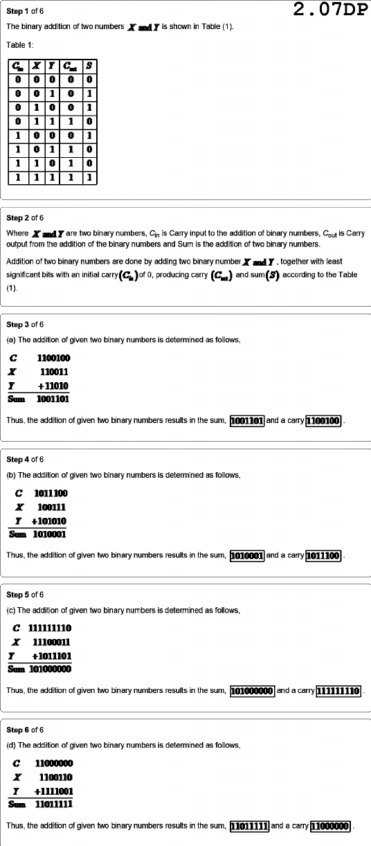 Step 1 of 6 2.07DP The binary addition of two numbers is shown in Table (1). Table 1: 00000 00101 01001 01110 10001 10110 11010 11111 Step 2 of 6 Where X and are two binary numbers, Cin is Carry input to the addition of binary numbers, Cout is Carry output from the addition of the binary numbers and Sum is the addition of two binary numbers. Addition of two binary numbers are done by adding two binary number together with least significant bits with an initial carry of 0, producing carry and sum according to the Table (1). Step 3 of 6 (a) The addition of given two binary numbers is determined as follows, 1100100 X 110011 +11010 Sum 1001101 Thus, the addition of given two binary numbers results in the sum, 1001101 and a carry 1100100 Step 4 of 6 (b) The addition of given two binary numbers is determined as follows, 1011100 X 100111 Y +101010 Sum 1010001 Thus, the addition of given two binary numbers results in the sum, 1010001 and a carry 1011100 Step 5 of 6 (c) The addition of given two binary numbers is determined as follows, 111111110 X 11100011 +1011101 Sum 101000000 Thus, the addition of given two binary numbers results in the sum, 101000000 and a carry 111111110 Step 6 of 6 (d) The addition of given two binary numbers is determined as follows, 11000000 X 1100110 Y +1111001 Sum 11011111 Thus, the addition of given two binary numbers results in the sum, 11011111 and a carry 11000000