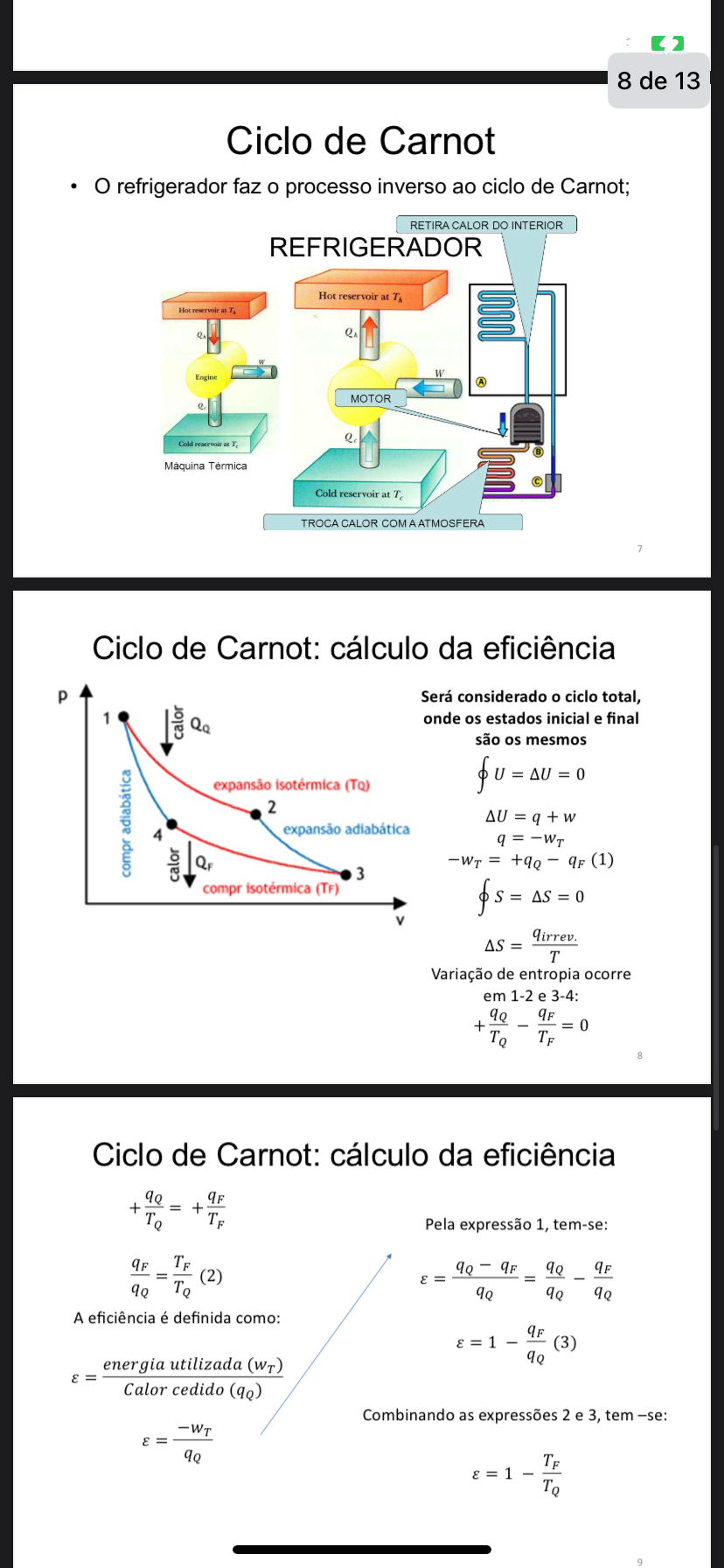 8 de 13 Ciclo de Carnot refrigerador faz o processo inverso ao ciclo de Carnot; RETIRA CALOR DO INTERIOR REFRIGERADOR Hot reservoir at Th Hot reservoir Engine W MOTOR Cold reservoir Máquina Térmica Cold reservoir at TROCA CALOR COM AATMOSFERA 7 Ciclo de Carnot: cálculo da eficiência Será considerado ciclo total, 1 calor onde os estados inicial e final são os mesmos expansão isotérmica (TQ) compr adiabática 2 4 expansão adiabática calor QF 3 compr isotérmica (TF) V Variação de entropia ocorre em 1-2 e 3-4: Ciclo de Carnot: cálculo da eficiência Pela expressão 1, tem-se: A eficiência é definida como: energia utilizada (WT) = Calor cedido (q₀) Combinando as expressões 2 e 3, tem -se: 9