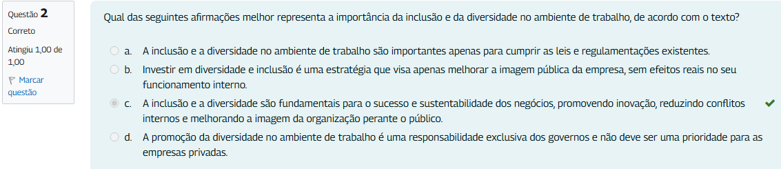 Questão 2 Qual das seguintes afirmações melhor representa a importância da inclusão e da diversidade no ambiente de trabalho, de acordo com texto? Correto Atingiu 1,00 de a. A inclusão e a diversidade no ambiente de trabalho são importantes apenas para cumprir as leis e regulamentações existentes. 1,00 b. Investir em diversidade e inclusão é uma estratégia que visa apenas melhorar a imagem pública da empresa, sem efeitos reais no seu Marcar funcionamento interno. questão C. A inclusão e a diversidade são fundamentais para sucesso e sustentabilidade dos negócios, promovendo inovação, reduzindo conflitos internos e melhorando a imagem da organização perante público. d. A promoção da diversidade no ambiente de trabalho é uma responsabilidade exclusiva dos governos e não deve ser uma prioridade para as empresas privadas.