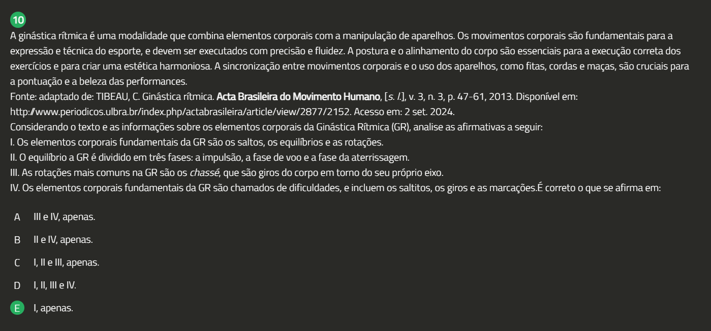 10 A ginástica rítmica é uma modalidade que combina elementos corporais com a manipulação de aparelhos. Os movimentos corporais são fundamentais para a expressão e técnica do esporte, e devem ser executados com precisão e fluidez. A postura e 0 alinhamento do corpo são essenciais para a execução correta dos exercícios e para criar uma estética harmoniosa. A sincronização entre movimentos corporais e 0 uso dos aparelhos, como fitas, cordas e maças, são cruciais para a pontuação e a beleza das performances. Fonte: adaptado de: TIBEAU, C. Ginástica rítmica. Acta Brasileira do Movimento Humano, [s. /.], V. 3, n. 3, p. 47-61, 2013. Disponível em: Acesso em: 2 set. 2024. Considerando 0 texto e as informações sobre elementos corporais da Ginástica Rítmica (GR), analise as afirmativas a seguir: I. Os elementos corporais fundamentais da GR são saltos, equilíbrios e as rotações. II. 0 equilíbrio a GR é dividido em três fases: a impulsão, a fase de e a fase da aterrissagem. III. As rotações mais comuns na GR são chassé, que são giros do corpo em torno do seu próprio eixo. IV. Os elementos corporais fundamentais da GR são chamados de dificuldades, e incluem saltitos, giros e as marcações.É correto 0 que se afirma em: A III e IV, apenas. B e IV, apenas. C I, e III, apenas. D I, II, III e IV. E I, apenas.
