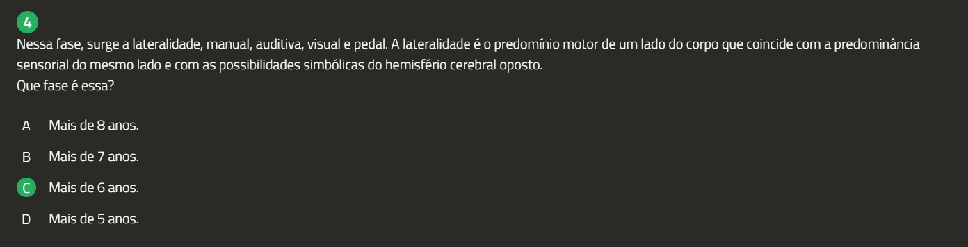 4 Nessa fase, surge a lateralidade, manual, auditiva, visual e pedal. A lateralidade é 0 predomínio motor de um lado do corpo que coincide com a predominância sensorial do mesmo lado e com as possibilidades simbólicas do hemisfério cerebral oposto. Que fase é essa? A Mais de 8 anos. B Mais de 7 anos. Mais de 6 anos. D Mais de 5 anos.
