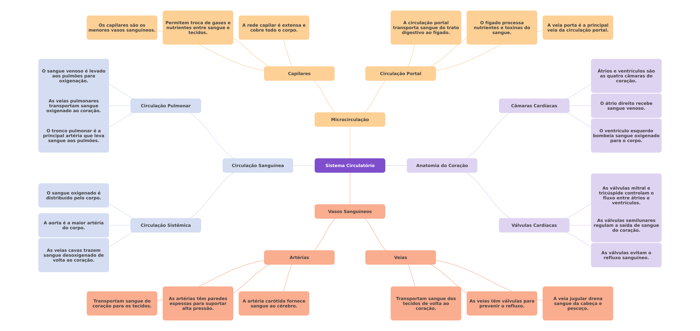 Os capilares são os Permitem troca de gases e A rede capilar é extensa e A circulação portal fígado processa menores vasos sanguíneos. nutrientes entre sangue e transporta sangue do trato nutrientes e toxinas do A veia porta é a principal tecidos. cobre todo corpo. digestivo ao fígado. veia da circulação portal. sangue. sangue venoso é levado Átrios e ventrículos são aos pulmões para Capilares Circulação Portal as quatro câmaras do oxigenação. coração. As veias pulmonares átrio direito recebe transportam sangue Circulação Pulmonar Câmaras Cardíacas oxigenado ao coração. sangue venoso. Microcirculação tronco pulmonar é a ventrículo esquerdo principal artéria que leva bombeia sangue oxigenado sangue aos pulmões. para corpo. Circulação Sanguínea Sistema Circulatório Anatomia do Coração As válvulas mitral e sangue oxigenado é tricúspide controlam distribuído pelo corpo. fluxo entre átrios e ventrículos. Vasos Sanguíneos As válvulas semilunares A aorta é a maior artéria do corpo. Circulação Sistêmica Válvulas Cardíacas regulam a saída de sangue do coração. As veias cavas trazem As válvulas evitam sangue desoxigenado de Artérias Veias volta ao coração. refluxo sanguíneo. Transportam sangue do As artérias têm paredes A artéria carótida fornece Transportam sangue dos As veias têm válvulas para A veia jugular drena espessas para suportar tecidos de volta ao coração para os tecidos. alta pressão. sangue ao cérebro. prevenir refluxo. sangue da cabeça e coração. pescoço.