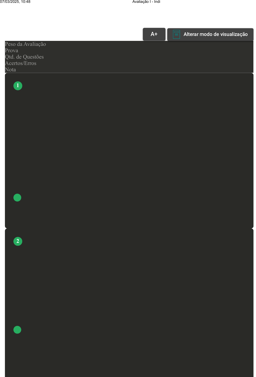 Prova Impressa GABARITO | Avaliação I - Individual (Cod.:992674) Peso da Avaliação 2,00 Prova 87396984 Qtd. de Questões 10 Acertos/Erros 10/0 Nota 10,00 Toda arquitetura reflete valores. A arquitetura é espelho da nossa sociedade. As linhas, formas, texturas ou cores refletem as mais variadas características e necessidades do mundo ao nosso redor e dos seus indivíduos. Sobre os fatores relacionados ao conceito de arquitetura, analise as opções a seguir: I- Planejamento. II- Organização e construção de uma obra arquitetônica. III- A arquitetura não expressa os gostos e as aspirações da sociedade. IV- Resolução estética e funcional da obra. V- A arquitetura teve início com o surgimento das cidades. Assinale a alternativa CORRETA: A As opções I, III e V estão corretas. B As opções I, II, III e V estão corretas. C As opções I, II e IV estão corretas. D As opções II, IV e V estão corretas. A Arquitetura Contemporânea foi inserida no cenário mundial através da indução tecnológica. Com o passar do tempo, os arquitetos, por meio da evolução técnica e científica, puderam incorporar em suas obras o uso da diversificação de materiais, contribuindo com um novo conjunto de tendências. Pode-se destacar as construções com formatos irregulares, pisos abertos, grandes vãos, além da inserção da sustentabilidade. Sobre as obras que remetem à arquitetura contemporânea, classifique V para as opções verdadeiras e F para as falsas: ( ) Capela Bosjes. ( ) Hotel Unique. ( ) Cappela Cornaro. ( ) Biblioteca, Mosteiro de Melk. Assinale a alternativa que apresenta a sequência CORRETA: A V - V - F - F. B F - V - V - V. C F - F - V - F. D VOLTAR A+ Alterar modo de visualização 1 2 07/03/2025, 10:48 Avaliação I - Individual about:blank 1/5 V - F - F - F. A história do Egito começa por volta de 3000 a.C., quando Menes, faraó do Alto Egito, uniu o Alto e o Baixo Egito e estabeleceu sua capital em Mênfiz, perto da junção dos dois territórios. As pirâmides arqueológicas tiveram início à medida que ocorriam os rituais religiosos. As construções exigiram conhecimento avançado em matemática com relação à quantidade de pedras utilizadas. Das dezenas de pirâmides do Egito, a mais conhecida é a Quéops, a única que resistiu ao tempo. Assinale a alternativa CORRETA que apresenta a primeira pirâmide construída no Egito em escala monumental: A Saqqara. B Parthenon. C Quéops. D Trajano. O processo de urbanização teve início no Século XVIII nos países desenvolvidos da América do Norte e da Europa. Fomentada pelas induções técnicas, em 1850, a Inglaterra, pioneira no processo, se concretizava por um território industrializado com 50% da população residindo em áreas urbanas. Anos mais tarde, logo após o término da Segunda Guerra Mundial, o processo de urbanização expande-se aceleradamente nos países subdesenvolvidos da América Latina, África e Ásia. Sobre os fatores relacionados à urbanização, analise as opções a seguir: I- Reprodução espacial. II- Êxodo rural. III- Industrialização. IV- Aumento populacional nas áreas rurais. V- Início das transformações espaciais. Assinale a alternativa CORRETA: A As opções II, IV e V estão corretas. B As opções III e IV estão corretas. C As opções I, III e V estão corretas. D As opções I, II e III estão corretas. A arquitetura de uma cidade, assim como o seu planejamento urbano, deve estar baseada em conceitos importantes, não só relacionados à estética e à beleza, como também ao de felicidade e bem-estar. Desde os primórdios, observa-se a produção de espaços significativos para os homens. No início, as construções eram pensadas e estruturadas com enfoque na função de subsistência. A partir desses pressupostos, assinale a alternativa CORRETA que apresenta as características estéticas de uma cidade: A A qualidade estética de uma cidade precisa estar relacionada à melhoria de vida da sociedade. 3 4 5 07/03/2025, 10:48 Avaliação I - Individual about:blank 2/5 B As características principais da estética nos programas arquitetônicos está relacionada a forma adequada a função. C A qualidade estética está relacionada ao funcionalismo do programa arquitetônico. D A função da estética está relacionada a um programa de necessidades que o profissional precisa seguir. A história é a maneira necessária para a abordagem da arquitetura. É nela que podemos encontrar o sentido da ação e da reflexão arquitetônica. A arquitetura Pré-História tem grande importância no período Neolítico, tempo em que se desenvolveram as primeiras construções e os primeiros assentamentos humanos. Sobre as primeiras construções megalíticas, classifique V para as opções verdadeiras e F para as falsas ( ) Coluna de Trajano. ( ) Parthenon. ( ) Dolmens. ( ) Nuragues. Assinale a alternativa que apresenta a sequência CORRETA: A V - F - V - F. B F - V - F - F. C F - F - V - V. D F - V - V - V. A arquitetura na Antiguidade Clássica remete aos gregos e romanos. A cidade torna-se o elemento principal da vida política e social desses dois povos. As obras construídas no estilo que denominamos "clássico" foram responsáveis pela consolidação de uma linguagem arquitetônica que dominou o cenário ocidental por pelo menos cinco séculos (GLANCEY, 2007). Sobre as obras que remetem a arquitetura na Antiguidade Clássica, classifique V para as opções verdadeiras e F para as falsas: ( ) Parthenon. ( ) Coluna de Trajano. ( ) Pirâmide Saggara. ( ) Arco Monumental de Napoleão. Assinale a alternativa que apresenta a sequência CORRETA: FONTE: GLANCEY, J. A história da Arquitetura. São Paulo: Loyola, 2007. A V - F - F - F. B V - V - F - V. C F - V - F - F. 6 7 07/03/2025, 10:48 Avaliação I - Individual about:blank 3/5 D F - F - V - F. A arquitetura desponta como uma das principais expressões artísticas na Mesopotâmia que é vista como o berço da arquitetura an