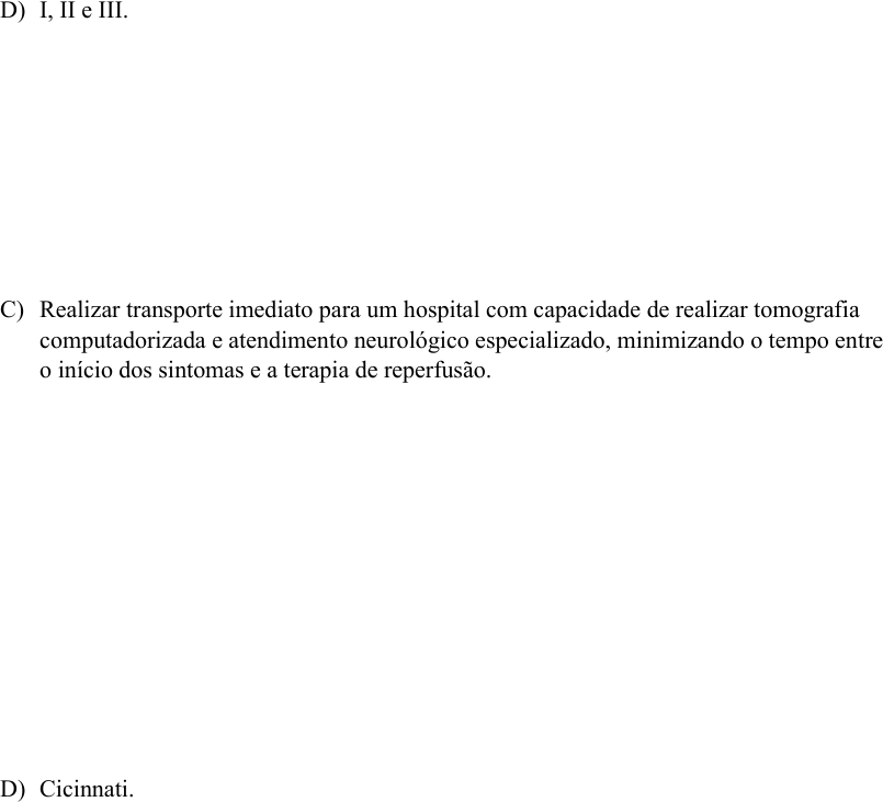 QUESTÕES SOBRE DISTÚRBIOS NEUROLÓGICOS 1- Em relação ao caso apresentado, analise as afirmativas abaixo: I. Algumas das ações de manejo inicial, caso esse paciente seja atendido na Unidade de Atenção Primária, serão: aplicar as escalas de Cincinatti e Glasgow; verificar os sinais vitais; checar glicemia capilar e corrigir hipoglicemia; instalar acesso venoso periférico em membro superior não parético; e, acionar o Serviço de Atendimento Móvel (SAMU) o mais rápido possível. II. Algumas das ações de manejo inicial, caso esse paciente seja atendido pelo SAMU, serão as mesmas mencionadas no item I no atendimento da Unidade de Atenção Primária, acrescentando a ordem de aguardar a orientação da Regulação Médica para realizar o transporte para a Unidade Hospitalar de referência. III. Algumas das ações de manejo inicial, caso esse paciente seja atendido na Unidade Hospitalar de referência serão as mesmas mencionadas no item I no atendimento da Unidade de Atenção Primária, acrescentando a realização da tomografia de crânio sem contraste de urgência para definição do diagnóstico de AVC isquêmico ou hemorrágico e posterior tratamento. Considerando as Linhas de Cuidado para o Acidente Vascular Cerebral (AVC) no adulto do Ministério da Saúde, está CORRETO o que se afirma em: A) I e II, apenas. B) II e III, apenas C) I e III, apenas. D) I, II e III. 2- A regulação médica do SAMU é essencial para organizar a assistência pré-hospitalar. Ao receber uma chamada de um paciente com suspeita de acidente vascular cerebral (AVC) isquêmico, qual é a medida mais indicada para otimizar o atendimento? A) Encaminhar o paciente para a unidade de pronto atendimento mais próxima para avaliação inicial e posterior encaminhamento ao serviço especializado caso necessário. B) Priorizar a estabilização hemodinâmica no local, administrar anti-hipertensivos para reduzir a pressão arterial e encaminhar para um hospital geral, independentemente de disponibilidade de unidade neurológica. C) Realizar transporte imediato para um hospital com capacidade de realizar tomografia computadorizada e atendimento neurológico especializado, minimizando o tempo entre o início dos sintomas e a terapia de reperfusão. D) Manter o paciente em observação no local por até 30 minutos para avaliar a progressão dos sintomas e só então definir o transporte conforme a evolução do quadro clínico. 3- Em ambiente extra-hospitalar, um enfermeiro realiza a avaliação de um usuário com 66 anos de idade com queixa de cefaleia, vertigem, distúrbio da marcha e visual unilateral. Suspeitando se tratar de um caso de acidente vascular cerebral (AVC), entre outras ações, o enfermeiro solicitou ao indivíduo que mostrasse os dentes, fechasse os olhos e elevasse os membros superiores, mantendo-os nessa posição por 10 segundos, e que repetisse a frase “O Brasil é o país do futebol”. É correto afirmar que, ao realizar essas solicitações, o enfermeiro está aplicando a escala de A) Pfeffer. B) Lawton. C) Tinneti. D) Cicinnati. E) Katz. 4- “O Acidente Vascular Cerebral (AVC) hemorrágico ocorre quando há __________ de um vaso cerebral, provocando __________. Ele pode acontecer dentro do tecido cerebral ou na superfície entre o cérebro e a meninge. É responsável por 15% de todos os casos de AVC, mas pode causar a morte com mais frequência do que o AVC isquêmico.” Preenche corretamente as lacunas, respectivamente: A) obstrução; hemorragia. B) obstrução; obstrução da passagem de oxigênio para células cerebrais. C) rompimento; hemorragia. D) rompimento; a formação de trombos dentro dos vasos cerebrais. 5- São fatores de risco para ocorrência de acidente vascular cerebral (AVC): I. hipertensão; diabetes tipo 2. II. hipercolesterolemia; obesidade. III. tabagismo; alcoolismo. IV. sedentarismo; histórico familiar. São corretas as afirmativas: A) I, II e III. B) I, III e IV. C) II e IV. D) todas afirmativas estão corretas. 6- Determinados acidentes vasculares cerebrais podem resultar em apraxias que comprometem movimentos básicos necessários ao cotidiano. Uma pessoa, após sofrer um acidente vascular cerebral (AVC) isquêmico, apresentou dificuldade grave em articular palavras em sua fala, sendo necessário acompanhamento fonoaudiológico e fisioterapêutico de longo prazo. A região do córtex cerebral mais provavelmente afetada pelo AVC foi A) o córtex motor primário. B) a área de Wernicke. C) o giro pré-frontal. D) o hipocampo. 7-Sobre o Ataque Isquêmico Transitório (AIT), assinale a alternativa errada: A) Ataques Isquêmicos Transitórios (AITs) são caracterizados por deficit neurológicos cerebrais isquêmicos focais que duram menos de 24h (geralmente menos de uma a duas horas). B) 5% a 10% dos pacientes com AITs terão acidente vascular cerebral dentro de 90 dias. C) O risco de acidente vascular cerebral é maior em pacientes com mais de 60 anos, em pacientes com diabetes, ou após AITs que duram mais de dez minutos e com sintomas ou sinais de fraqueza, comprometimento da fala ou distúrbio da marcha. D) Na presença de fibrilação atrial, o tratamento é com varfarina (meta de INR 2,0 a 3,0); É estritamente necessária a associação de varfarina com heparina, e alguns especialistas defendem o tratamento com aspirina até que o INR se torne terapêutico. E) A Tomografia Computadorizada (TC) ou Ressonância Magnética (RM) é indicada dentro de 24h do início dos sintomas, em parte para excluir a possibilidade de uma pequena hemorragia cerebral ou um tumor cerebral disfarçado como um AIT. 8- O ataque isquêmico transitório ocorre quando o episódio de disfunção neurológica, de origem isquêmica, apresenta duração inferior a A) duas horas. B) quatro horas. C) seis horas. D) doze horas. E) 24 horas. 9- A hipertensão intracraniana pode ocorrer como consequência do aumento de volume cerebral nos compartimentos venoso, arterial, parenquim
