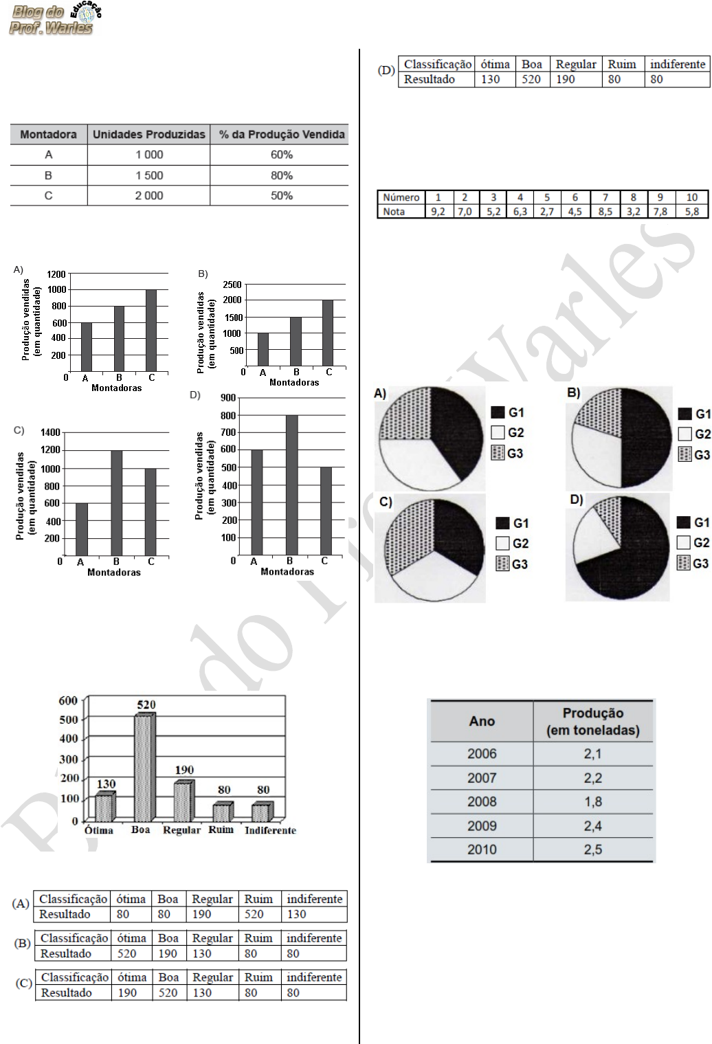 D37 - Associar informações apresentadas em listas e/ou tabelas simples aos gráficos que as representam e vice-versa ------------------------------------------------------------------- (Supletivo 2011 – MG). A tabela abaixo apresenta os dados sobre a produção e a venda de automóveis de três montadoras em certo mês do ano. O gráfico que melhor representa a quantidade da produção vendida por essas três montadoras é (Resp. C) ------------------------------------------------------------------- (3ª P.D - SEDUC-GO). O gráfico a seguir representa o resultado de uma pesquisa feita com moradores de uma cidade, para verificar o nível de aprovação da administração do prefeito. Das tabelas abaixo qual representa corretamente os dados apresentados no gráfico? (Resp. D) ------------------------------------------------------------------- (SARESP). As notas que os dez alunos de uma classe tiveram em uma prova de Biologia foram transcritas na tabela seguinte. Para visualizar melhor o desempenho da turma, o professor dividiu as notes em três grupos descritos a seguir, e construiu com eles um gráfico de setores. G1: notas maiores ou iguais a 6,0. G2: notas entre 4,0 e 6,00. G3: notas menores ou iguais a 4,0. O gráfico que corresponde aos dados apresentados é (Resp. B) ------------------------------------------------------------------- (Saerj). Observe na tabela abaixo, a quantidade de carne bovina produzida por um frigorífico no período de 2006 a 2010. Qual é o gráfico que melhor representa os dados apresentados nessa tabela? (Resp. B) ------------------------------------------------------------------- (SISPAE). No mês de setembro, a Loja Popular vendeu 100 calças, 50 blusas, 25 pares de sapatos, 65 cintos e 80 pares de meias. Qual é o gráfico que melhor representa as vendas da Loja Popular nesse mês? ------------------------------------------------------------------- (SAEPI). Observe abaixo o gráfico que mostra o número de carros vendidos em uma cidade, no período de 2000 a 2004. Qual é o quadro que melhor representa os dados apresentados nesse gráfico? (resp. d) ------------------------------------------------------------------- (SAEPI). O lucro da Indústria Paraíso dos Doces, em milhares de reais, no último ano está apresentado na tabela abaixo. O gráfico que melhor representa a situação da Indústria Paraíso dos Doces é (Resp. A) ------------------------------------------------------------------- (SAEB 2013). A comissão organizadora de uma prova de seleção constatou que das 80 questões propostas, 10 tiveram desempenho muito bom, 20 desempenho bom, 15 regular e 35 fraco. Qual dos gráficos abaixo a comissão utilizou para representar esses resultados? (A) B) (C) (D) ------------------------------------------------------------------- (SAEP 2013). No galinheiro de Bento encontram-se galinhas, galos e pintinhos. Ele precisa saber quantos animais de cada tipo tem. Vamos ajudá-lo? Vamos começar contando a quantidade de cada animal. O gráfico que melhor representa contagem do seu Bento é (Resp. B) ------------------------------------------------------------------- (PAEBES). O gráfico abaixo mostra o consumo de água de uma família nos meses de janeiro, fevereiro e março, medido em metros cúbicos. Fonte: Dados hipotéticos A tabela que representa esse gráfico é (Resp. D) ------------------------------------------------------------------- Os alunos da 8ª série fizeram uma estimativa para 200 pessoas com base no estudo abaixo. Que gráfico de barras melhor representa o estudo? (Resp. C) ------------------------------------------------------------------- (SIMAVE). A tabela abaixo mostra os dados de uma pesquisa sobre o número de pessoas desempregadas no Brasil, por sexo, de Janeiro a Abril de 2009. (Resp. B) O gráfico que melhor representa os dados dessa tabela é: ------------------------------------------------------------------- A tabela abaixo mostra as temperaturas mínimas registradas durante uma semana do mês de julho, numa cidade do Rio Grande do Sul. Qual é o gráfico que representa a variação da temperatura mínima nessa cidade, nessa semana? (Resp. C) ------------------------------------------------------------------- (SAERS). Em uma pesquisa sobre atendimento médico, foi perguntado a um grupo de pessoas sobre o que eles fariam caso fossem mal atendidos em uma consulta médica. Os resultados estão registrados no gráfico de barras a seguir: De acordo com os dados desse gráfico, o quadro que representa essas informações é: (Resp. C) ------------------------------------------------------------------- O gráfico abaixo mostra o resultado de uma pesquisa feita entre os visitantes de um zoológico sobre a preferência dos animais. A tabela que deu origem ao gráfico, é: (Resp. A) ------------------------------------------------------------------- Foi realizada uma pesquisa sobre o local onde cada aluno da 5ª série A nasceu. Com as informações obtidas o professor construiu o seguinte gráfico de barras. A tabela que deu origem ao gráfico, é: (Resp. A) ------------------------------------------------------------------- A tabela seguinte mostra os números de pares de calçados vendidos pela loja “Pise Bem”, durante os meses de janeiro a abril de 2010. O gráfico que melhor representa a tabela é: (Resp. B) ------------------------------------------------------------------- Observe o gráfico de barras que mostra o número de helicópteros da frota brasileira, no período de 1997 a 2002. Das tabelas a seguir, qual corresponde aos dados apresentados nesse gráfico? (Resp. A) ------------------------------------------------------------------- Para a final do Campeonato Estadual de Futebol estão classificados quatro times. Foi feita uma pesquisa entre os alunos da escola, com o objetivo de saber a preferência em relação a um deles. Cada aluno votou em um só time e os resultados estão no gráfico a seguir. Então, a tabel