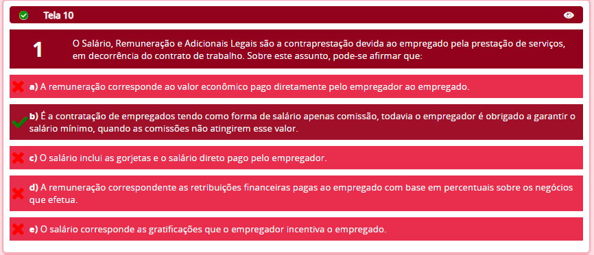 Tela 10 1 Salário, Remuneração e Adicionais Legais são a contraprestação devida ao empregado pela prestação de serviços, em decorrência do contrato de trabalho. Sobre este assunto, pode-se afirmar que: a) A remuneração corresponde ao valor econômico pago diretamente pelo empregador ao empregado. b) É a contratação de empregados tendo como forma de salário apenas comissão, todavia empregador é obrigado a garantir O salário mínimo, quando as comissões não atingirem esse valor. c) salário inclui as gorjetas e salário direto pago pelo empregador. d) A remuneração correspondente as retribuições financeiras pagas ao empregado com base em percentuais sobre os negócios que efetua. e) salário corresponde as gratificações que empregador incentiva empregado.
