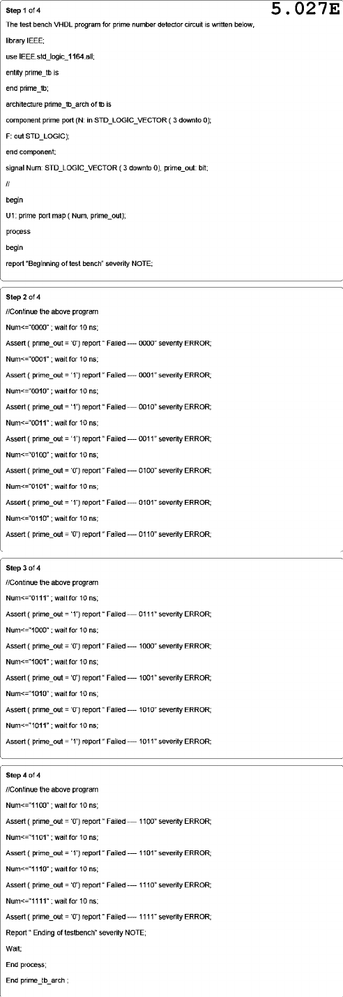 Step of 4 5.027E The test bench VHDL program for prime number detector circuit is written below, library IEEE; use entity prime_tb is end prime_tb; architecture prime_tb_arch of tb is component prime port (N: in STD_LOGIC_VECTOR (3 downto 0); F: out STD_LOGIC); end component; signal Num: STD_LOGIC_VECTOR (3 downto 0), prime_out: bit; // begin U1: prime port map Num, prime_out); process begin report "Beginning of test bench" severity Step 2 of 4 //Continue the above program Num