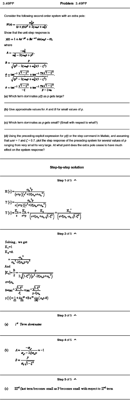 Problem 3.49PP Consider the following second-order system with an extra pole; «W = ;( *+ P )(^ + 2f Show that the unit-step response is y(0 = 1 +Ae~^ +Be-^* an(coat - e), where A = «3-2»P s(s+p)(s“ +25ti>i,s+ti>«’ ) Y ( s ) = ^ + ^ + Step 2 of 5 Solving, we get K i= l K j= A V And 2 2 ^ ( K ’ )(p=-2?avP+aw’ )