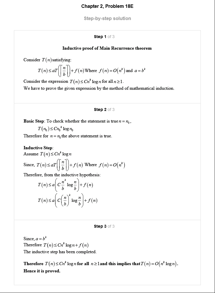 Chapter 2, Problem 18E Step-by-step solution Step 1 of 3 Inductive proof of Main Recurrence theorem Consider T(n) satisfying: Where and a=b* Consider the expression T(n) log for all n We have to prove the given expression by the method of mathematical Step 2 of 3 Basic Step: To check whether the statement is Therefore for n=n₀ the above statement is true. Inductive Step: Assume Since, Where Therefore, from the inductive hypothesis: Step 3 of 3 Since, a=b* The inductive step has been completed. Therefore T(n) logn for all n≥1 and this implies Hence it is proved.