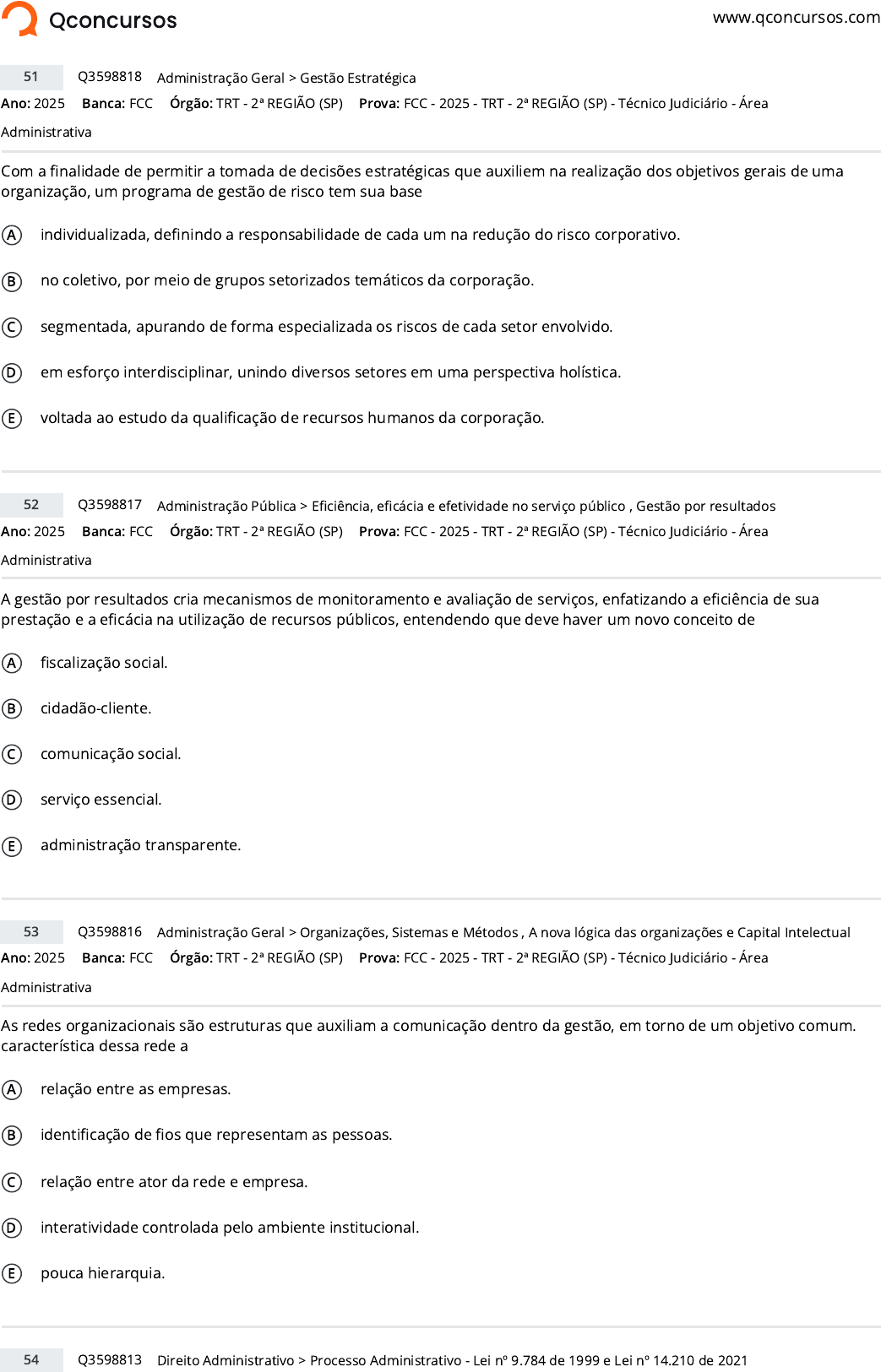 www.qconcursos.com Ano: 2025 Banca: FCC Órgão: TRT - 2ª REGIÃO (SP) Com a finalidade de permitir a tomada de decisões estratégicas que auxiliem na realização dos objetivos gerais de uma organização, um programa de gestão de risco tem sua base A individualizada, definindo a responsabilidade de cada um na redução do risco corporativo. B no coletivo, por meio de grupos setorizados temáticos da corporação. C segmentada, apurando de forma especializada os riscos de cada setor envolvido. D em esforço interdisciplinar, unindo diversos setores em uma perspectiva holística. E voltada ao estudo da qualificação de recursos humanos da corporação. Ano: 2025 Banca: FCC Órgão: TRT - 2ª REGIÃO (SP) A gestão por resultados cria mecanismos de monitoramento e avaliação de serviços, enfatizando a eficiência de sua prestação e a eficácia na utilização de recursos públicos, entendendo que deve haver um novo conceito de A fiscalização social. B cidadão-cliente. C comunicação social. D serviço essencial. E administração transparente. Ano: 2025 Banca: FCC Órgão: TRT - 2ª REGIÃO (SP) As redes organizacionais são estruturas que auxiliam a comunicação dentro da gestão, em torno de um objetivo comum. característica dessa rede a A relação entre as empresas. B identificação de fios que representam as pessoas. C relação entre ator da rede e empresa. D interatividade controlada pelo ambiente institucional. E pouca hierarquia. 51 Q3598818 >Administração Geral Gestão Estratégica Prova: FCC - 2025 - TRT - 2ª REGIÃO (SP) - Técnico Judiciário - Área Administrativa 52 Q3598817 >Administração Pública Eficiência, eficácia e efetividade no serviço público , Gestão por resultados Prova: FCC - 2025 - TRT - 2ª REGIÃO (SP) - Técnico Judiciário - Área Administrativa 53 Q3598816 >Administração Geral Organizações, Sistemas e Métodos , A nova lógica das organizações e Capital Intelectual Prova: FCC - 2025 - TRT - 2ª REGIÃO (SP) - Técnico Judiciário - Área Administrativa 54 Q3598813 >Direito Administrativo Processo Administrativo - Lei nº 9.784 de 1999 e Lei nº 14.210 de 2021 https://www.qconcursos.com/ https://www.qconcursos.com/questoes-de-concursos/bancas/fcc https://www.qconcursos.com/questoes-de-concursos/institutos/trt-2-regiao-sp https://www.qconcursos.com/questoes-de-concursos/bancas/fcc https://www.qconcursos.com/questoes-de-concursos/institutos/trt-2-regiao-sp https://www.qconcursos.com/questoes-de-concursos/bancas/fcc https://www.qconcursos.com/questoes-de-concursos/institutos/trt-2-regiao-sp https://www.qconcursos.com/questoes-de-concursos/questoes/c2e2d32a-91 https://www.qconcursos.com/questoes-de-concursos/disciplinas/administracao-administracao-geral https://www.qconcursos.com/questoes-de-concursos/disciplinas/administracao-administracao-geral/gestao-estrategica https://www.qconcursos.com/questoes-de-concursos/provas/fcc-2025-trt-2-regiao-sp-tecnico-judiciario-area-administrativa https://www.qconcursos.com/questoes-de-concursos/provas/fcc-2025-trt-2-regiao-sp-tecnico-judiciario-area-administrativa https://www.qconcursos.com/questoes-de-concursos/questoes/c2e078cf-91 https://www.qconcursos.com/questoes-de-concursos/disciplinas/administracao-administracao-publica https://www.qconcursos.com/questoes-de-concursos/disciplinas/administracao-administracao-publica/eficiencia-eficacia-e-efetividade-no-servico-publico https://www.qconcursos.com/questoes-de-concursos/disciplinas/administracao-administracao-publica/gestao-por-resultados https://www.qconcursos.com/questoes-de-concursos/provas/fcc-2025-trt-2-regiao-sp-tecnico-judiciario-area-administrativa https://www.qconcursos.com/questoes-de-concursos/provas/fcc-2025-trt-2-regiao-sp-tecnico-judiciario-area-administrativa https://www.qconcursos.com/questoes-de-concursos/questoes/c2de0c3c-91 https://www.qconcursos.com/questoes-de-concursos/disciplinas/administracao-administracao-geral https://www.qconcursos.com/questoes-de-concursos/disciplinas/administracao-administracao-geral/organizacoes-sistemas-e-metodos https://www.qconcursos.com/questoes-de-concursos/disciplinas/administracao-administracao-geral/a-nova-logica-das-organizacoes-e-capital-intelectual https://www.qconcursos.com/questoes-de-concursos/provas/fcc-2025-trt-2-regiao-sp-tecnico-judiciario-area-administrativa https://www.qconcursos.com/questoes-de-concursos/provas/fcc-2025-trt-2-regiao-sp-tecnico-judiciario-area-administrativa https://www.qconcursos.com/questoes-de-concursos/questoes/c2d68ed8-91 https://www.qconcursos.com/questoes-de-concursos/disciplinas/direito-direito-administrativo https://www.qconcursos.com/questoes-de-concursos/disciplinas/direito-direito-administrativo/processo-administrativo-lei-n-9-784-de-1999-e-lei-n-14-210-de-2021 Ano: 2025 Banca: FCC Órgão: TRT - 2ª REGIÃO (SP) A propósito da intimação dos atos do processo administrativo, a Lei nº 9.784/1999 (Lei do Processo Administrativo) prescreve: A No caso de interessados indeterminados, desconhecidos ou com domicílio indefinido, a intimação deve ser efetuada por meio de edital publicado em jornal de circulação local. B O desatendimento da intimação não importa o reconhecimento da verdade dos fatos nem a renúncia a direito, salvo na hipótese de direitos disponíveis. C A intimação deverá observara antecedência mínima de 10 dias quanto à data de comparecimento. D As intimações serão nulas quando feitas sem observância das prescrições legais, mas o comparecimento do administrado supre sua falta ou irregularidade. E É dispensada a intimação quando o interessado for servidor do órgão condutor do processo administrativo. Ano: 2025 Banca: FCC Órgão: TRT - 2ª REGIÃO (SP) A prefeitura do Município X pretende delegar a uma empresa privada, selecionada por meio de licitação, a prestação do serviço de iluminação pública, por entender que a execução indireta otimizará a eficiência e propiciará a ampliação da infraestru