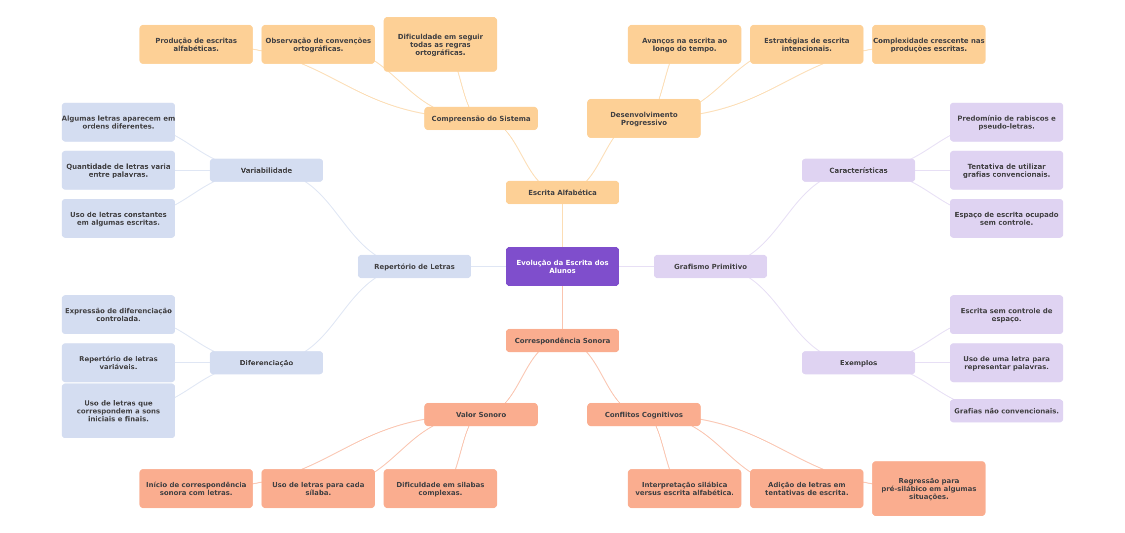 Produção de escritas Observação de convenções Dificuldade em seguir Avanços na escrita ao Estratégias de escrita Complexidade crescente nas alfabéticas. ortográficas. todas as regras ortográficas. longo do tempo. intencionais. produções escritas. Desenvolvimento Algumas letras aparecem em Compreensão do Sistema Predomínio de rabiscos e ordens diferentes. Progressivo pseudo-letras. Quantidade de letras varia Tentativa de utilizar Variabilidade Características entre palavras. grafias convencionais. Escrita Alfabética Uso de letras constantes Espaço de escrita ocupado em algumas escritas. sem controle. Repertório de Letras Evolução da Escrita dos Grafismo Primitivo Alunos Expressão de diferenciação Escrita sem controle de controlada. espaço. Correspondência Sonora Repertório de letras variáveis. Diferenciação Exemplos Uso de uma letra para representar palavras. Uso de letras que correspondem a sons Grafias não convencionais. Valor Sonoro iniciais e finais. Conflitos Cognitivos Início de correspondência Uso de letras para cada Dificuldade em silabas Interpretação silábica Adição de letras em Regressão para sonora com letras. sílaba. complexas. versus escrita alfabética. tentativas de escrita. pré-silábico em algumas situações.
