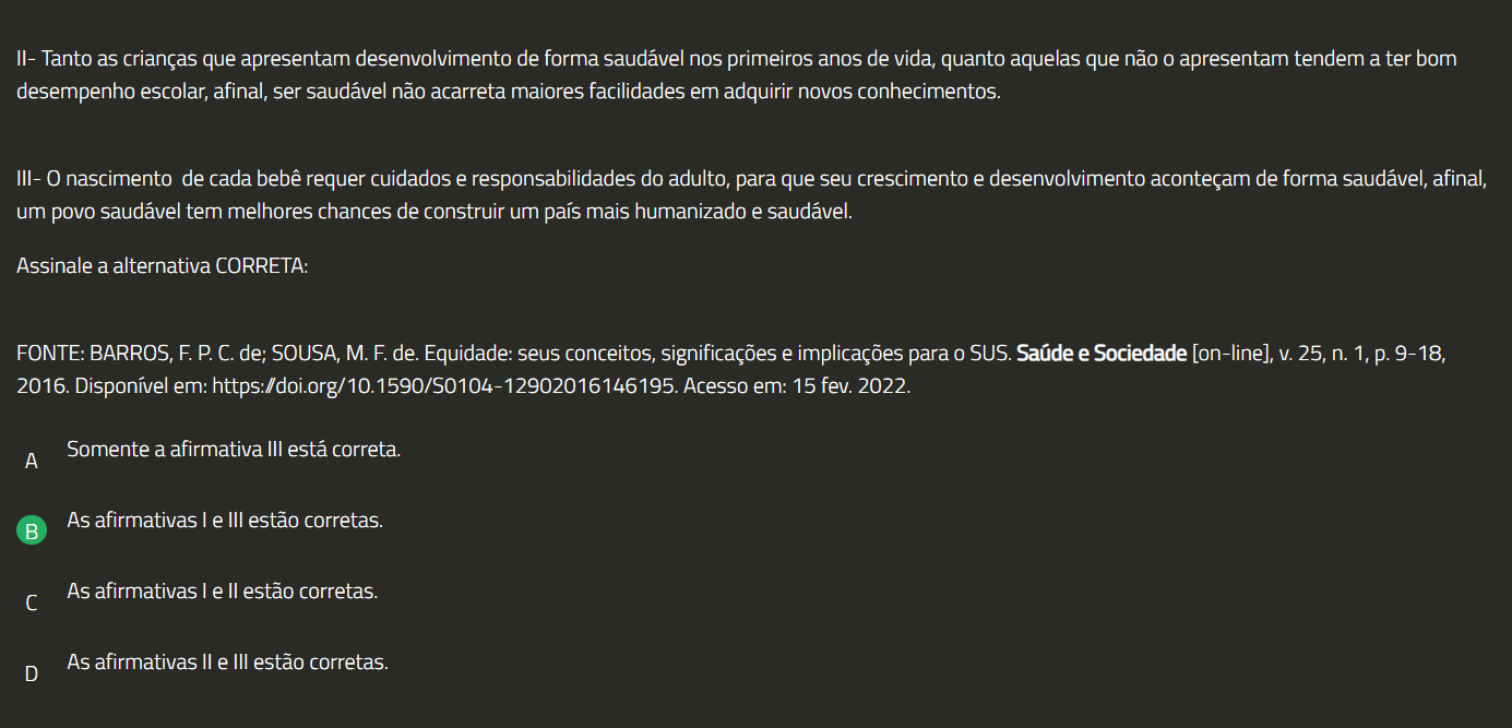II- Tanto as crianças que apresentam desenvolvimento de forma saudável nos primeiros anos de vida, quanto aquelas que não 0 apresentam tendem a ter bom desempenho escolar, afinal, ser saudável não acarreta maiores facilidades em adquirir novos conhecimentos. III- 0 nascimento de cada bebê requer cuidados e responsabilidades do adulto, para que seu crescimento e desenvolvimento aconteçam de forma saudável, afinal, um povo saudável tem melhores chances de construir um país mais humanizado e saudável. Assinale a alternativa CORRETA: FONTE: BARROS, F.P. C. de; SOUSA, M.F. de. Equidade: seus conceitos, significações e implicações para 0 SUS. Saúde e Sociedade [on-line], V. 25, n. 1, p. 9-18, 2016. Disponível em: https://doi.org/10.1590/S0104-12902016146195. Acesso em: 15 fev. 2022. Somente a afirmativa III está correta. A As afirmativas e III estão corretas. As afirmativas e estão corretas. As afirmativas II e III estão corretas. D