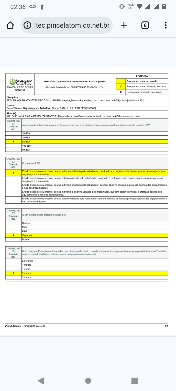 02:36 LTE + 8 LEGENDA ESCOLA TÉCNICA CEDTEC Exercicio Caminho do Conhecimento Etapa 4 (15658) Resposta correta na questão ANA PAULA DE SOUZA Atividade finalizada em 30/04/2025 00:13:43 (3701277 # Resposta correta Questão Anulada SANTOS X Resposta selecionada pelo Aluno Disciplina: SEGURANÇA NA CONSTRUÇÃO CIVIL [1428598] Avaliação com 4 questões, com peso total de 6,50 pontos 102] Turma: Curso Segurança do Trabalho Grupo: EAD 01/25 EAD SEG [152686] Aluno(a): 91716450 ANA PAULA DE SOUZA SANTOS Respondeu 4 questões corretas, obtendo um total de 6,50 pontos como nota 34] A audição do trabalhador requer proteção sempre que nivel de pressão sonora equivalente ultrapassar de quantos dBA? Questão 001 30 dBA 70 dBA 85 dBA 105 dBA 90 dBA 32] Questão que um EPI? 002 E todo dispositivo ou de uso individual utilizado pelo destinado a proteção contra riscos capazes de ameaçar a sua X segurança e a sua todo dispositivo ou produto, de uso coletivo utilizado pelo trabalhador, destinado a proteção contra riscos capazes de ameaçar a sua segurança e a sua saúde. E todo dispositivo ou produto, de uso individual utilizado pelo trabalhador, que tem objetivo principal a proteção apenas dos equipamentos não dos trabalhadores E todo dispositivo ou de uso individual 0 coletivo utilizado pelo que tem objetivo principal a proteção apenas dos equipamentos 0 não dos trabalhadores E todo dispositivo ou produto, de uso coletivo utilizado pelo trabalhador, que tem objetivo principal a proteção apenas dos equipamentos e não dos 33] Questão O EPI utilizado para proteger a cabeça 003 Oculos Meia Luva Capacete Botina 35] Com a Proteção contra quedas com diferença de nivel, uso de equipamentos de proteção exigido pelo Ministério do Questão sempre que trabalho for realizado acima de quantos metros do solo? 004 2.5 metros 4 metros 1 metro 2 metros 3 metros Pincel Atômico 16/09/2025 02:36:08 1/1