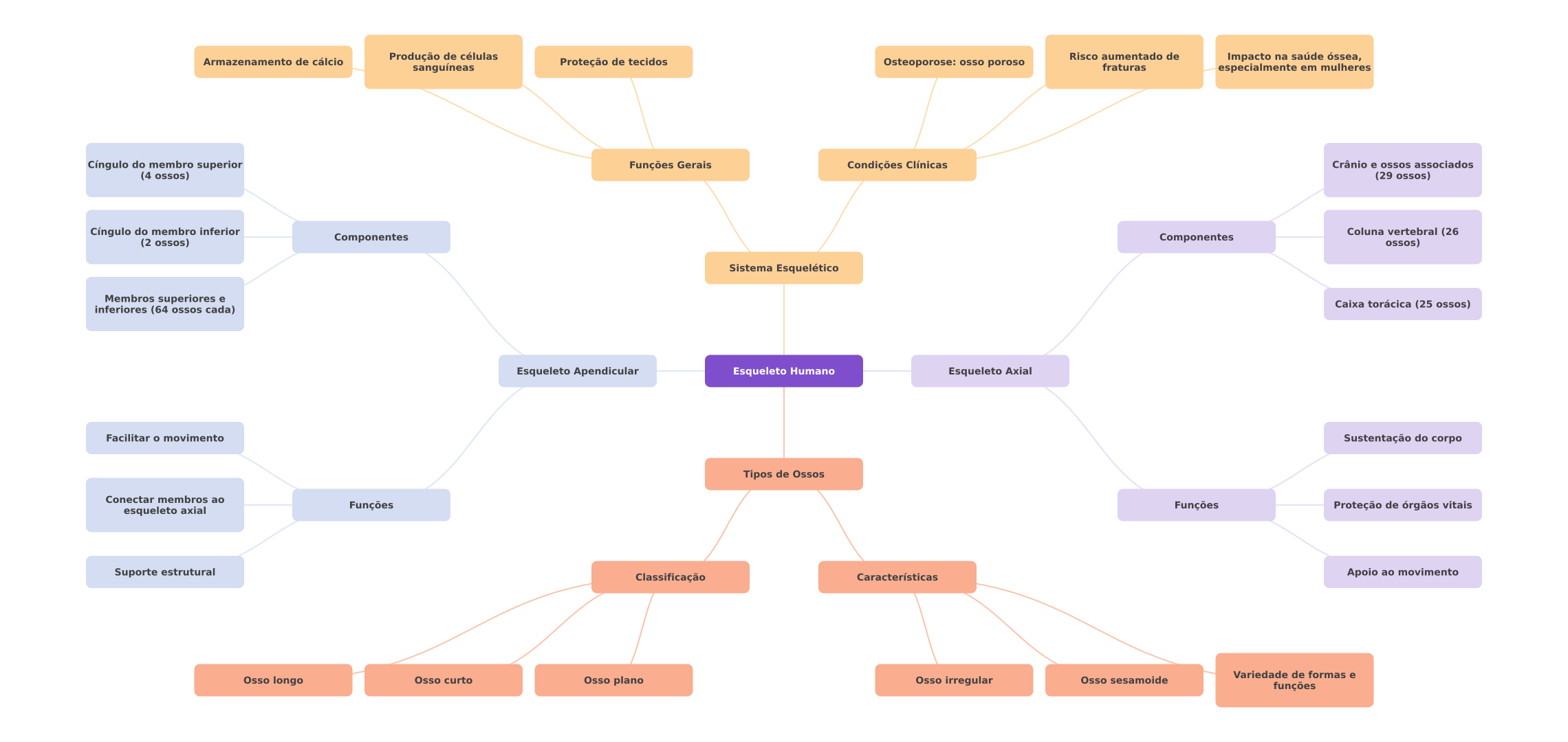 Produção de células Risco aumentado de Armazenamento de cálcio Proteção de tecidos Impacto na saúde óssea, sanguíneas Osteoporose: osso poroso fraturas especialmente em mulheres Cíngulo do membro superior Funções Gerais Condições Clínicas Crânio e ossos associados (4 ossos) (29 ossos) Cíngulo do membro inferior Coluna vertebral (26 (2 ossos) Componentes Componentes ossos) Sistema Esquelético Membros superiores e inferiores (64 ossos cada) Caixa torácica (25 ossos) Esqueleto Apendicular Esqueleto Humano Esqueleto Axial Facilitar movimento Sustentação do corpo Tipos de Ossos Conectar membros ao esqueleto axial Funções Funções Proteção de órgãos vitais Suporte estrutural Classificação Características Apoio ao movimento Variedade de formas e Osso longo Osso curto Osso plano Osso irregular Osso sesamoide funções